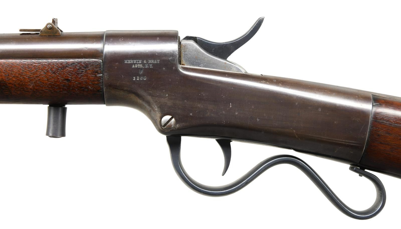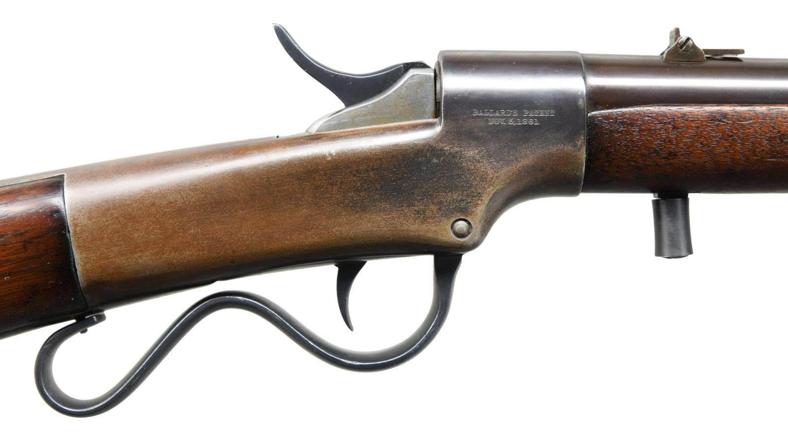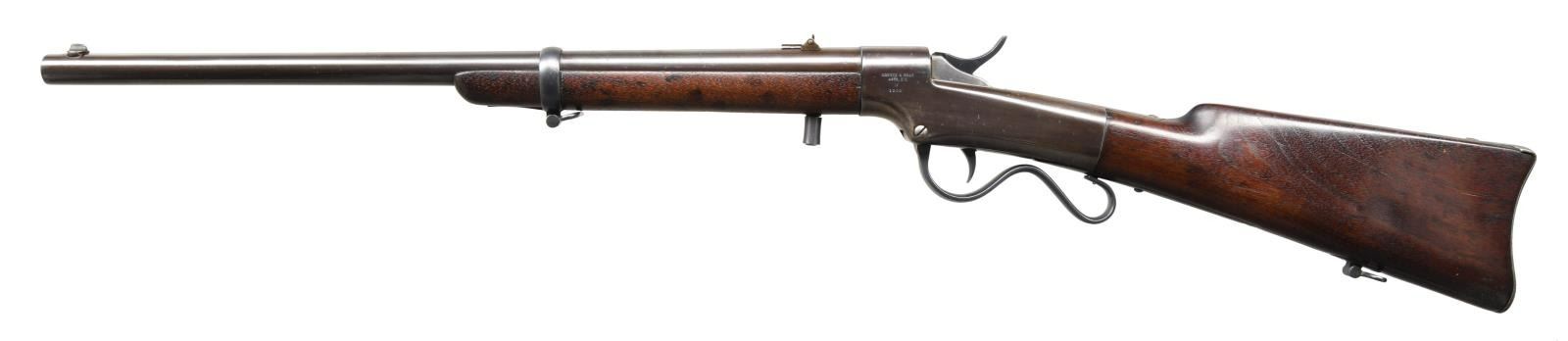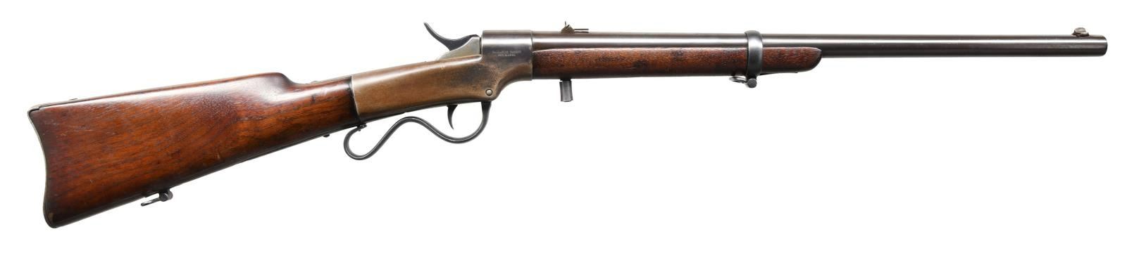 MARKED LARGE FRAME BALLARD PATENT CARBINE. CAL. 52RF. S# 1165. These carbines have an interesting story. In 1862 Merwin & Bray secured a US contract for 1000 carbines and 1000 rifles of large caliber Ballard patent. Merwin & Bray contracted with Dwight, Chapin & Co to produce the guns. The company was only able to deliver 115 carbines from the order and consequently entered into bankruptcy. Merwin & Bray acquired the assets from the company and had Ball & William complete the assembly. Ball & Williams likely removed the Dwight, Chapin & Co markings and marked the approx 1000 carbines that were assembled with the Merwin & Bray agent & Ballard patent markings. All of which were purchased by Kentucky in April 1864. CONDITION: Overall good as restored throughout with scattered handling marks present. Very good bright bore with solid rifling. (01-23181/ZAL) ANTIQUE $1200-1800