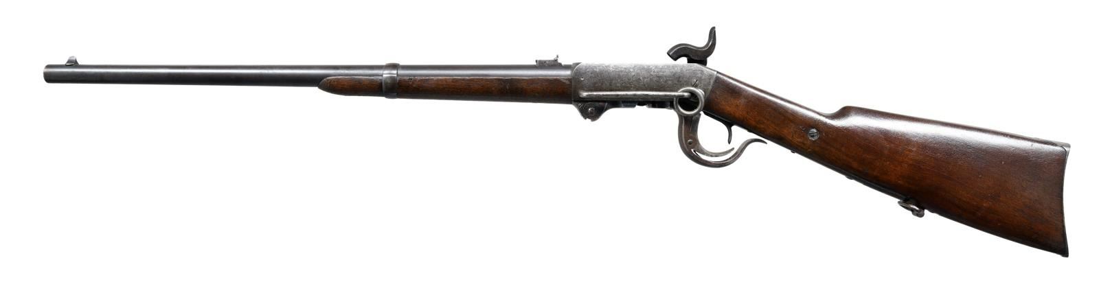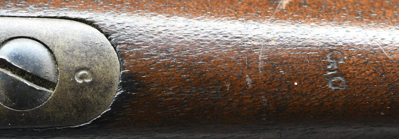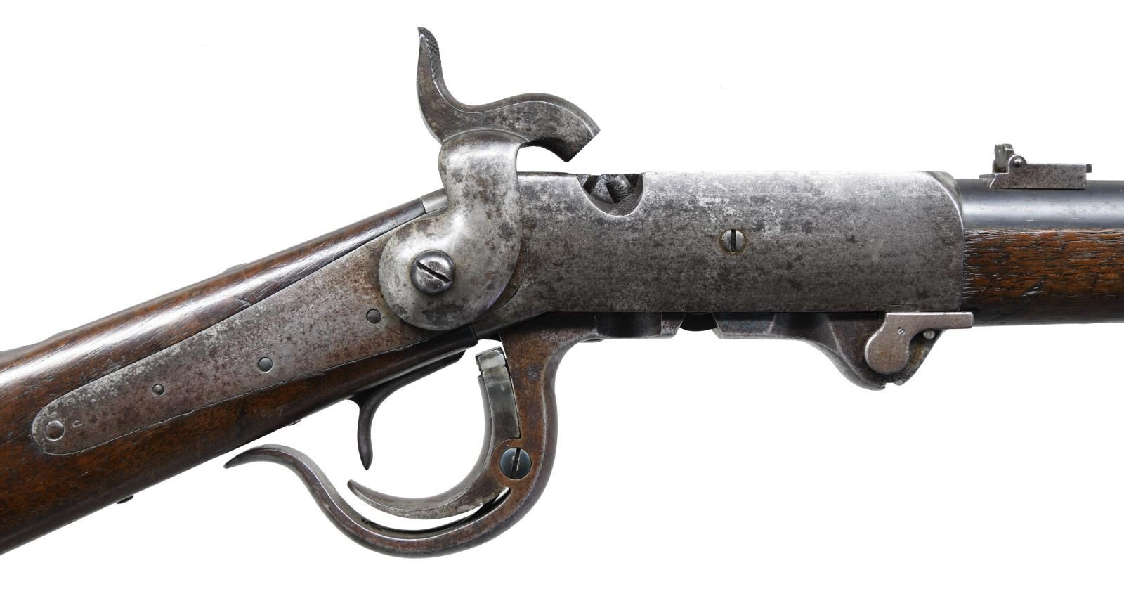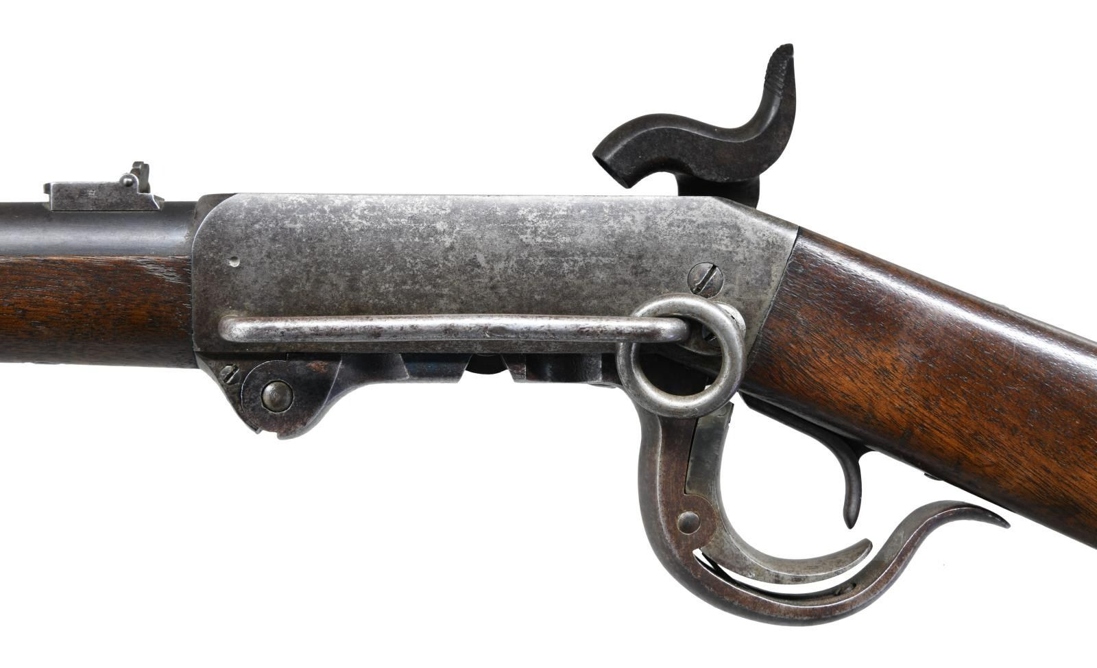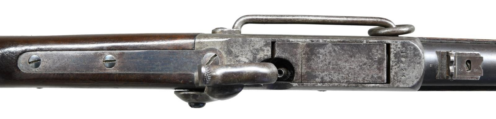1864 CARBINE. Cal. 54. S# 10824 (approx. 43,000 mfg. 1863-1865). Rnd. 21" bbl w/ blade front sight & 2 leaf rear sight. Percussion ignition using proprietary 54 cal. copper or tapered foil "cone" cartridge. Walnut stock set w/ sling swivel on toeline, crescent buttplate & "G.O" proof on comb in front of buttplate peak. "S" inspector stamp on various sm. parts. CONDITION: bbl. shows good blue mixed w/ brown patina throughout w/ light marks, pinprick oxidation & muzzle wear. Faint traces of case color lever w/ balance of action gray brown patina w/ worn markings, light pitting & peppery oxidation throughout. Original finish on wood has worn finish in carry areas along w/ scattered impressions, sm. gouges, scratches & minute cracks. Buttplate shows area of deep pitting balance gray patina. Bore shows distinct rifling w/ large area of pitting. (01-23669/MD). ANTIQUE. $1,000-1,500.
