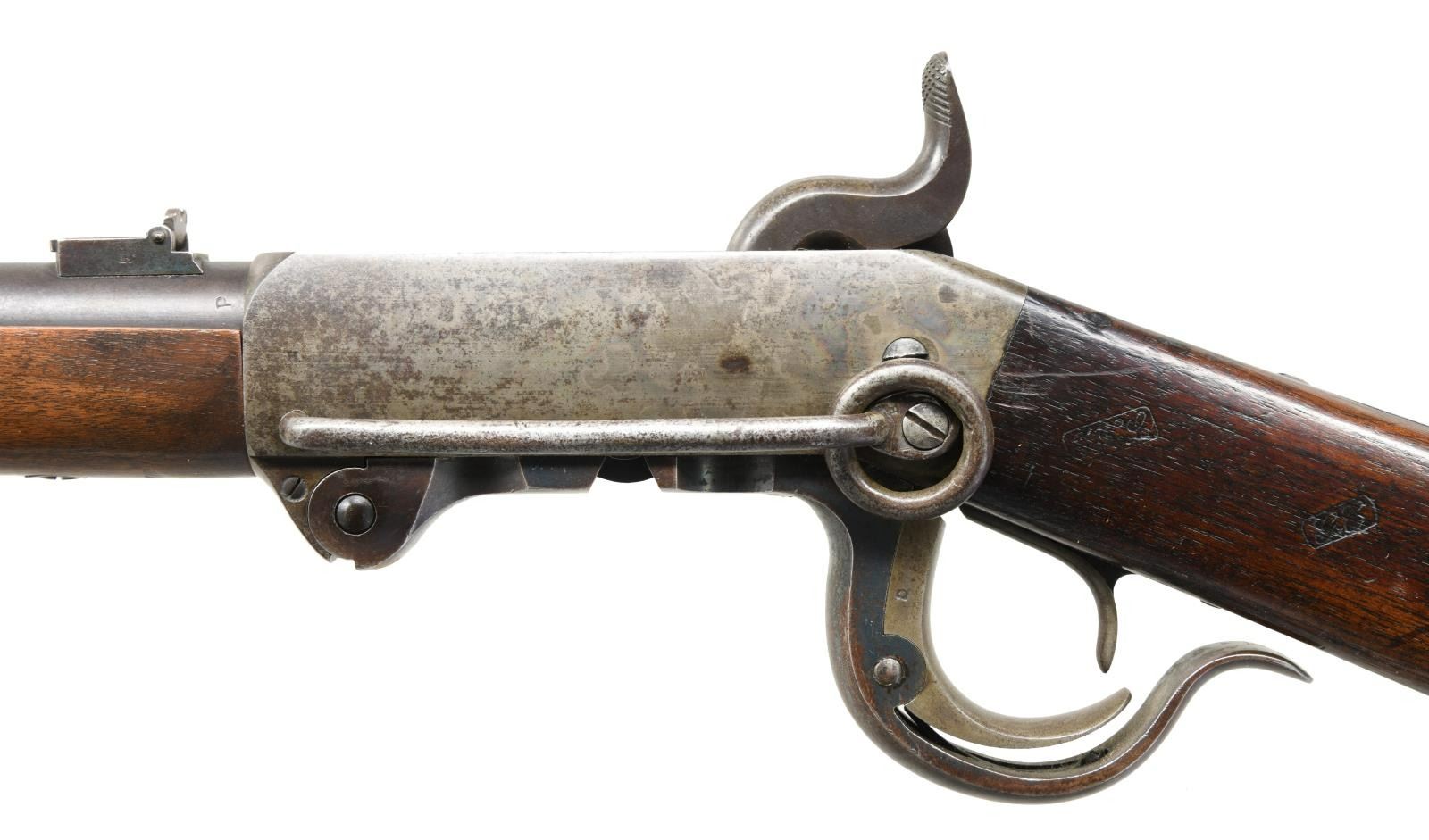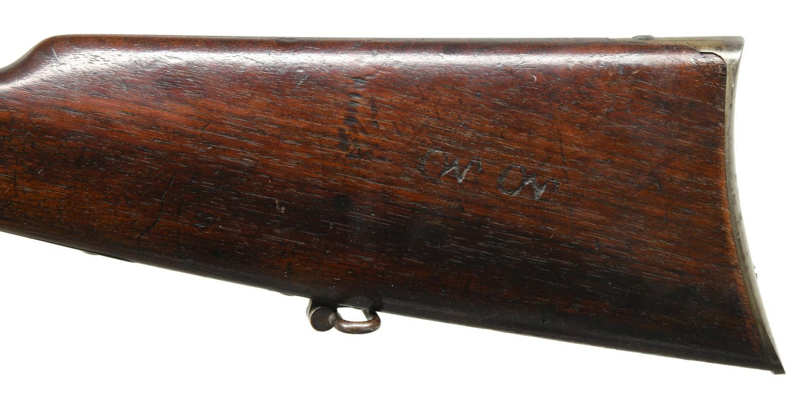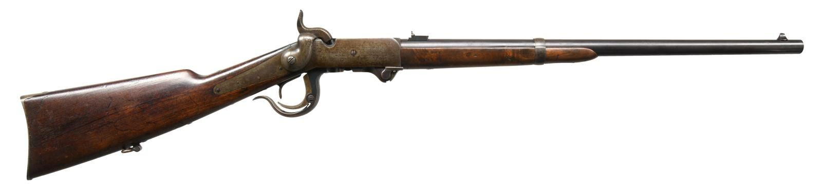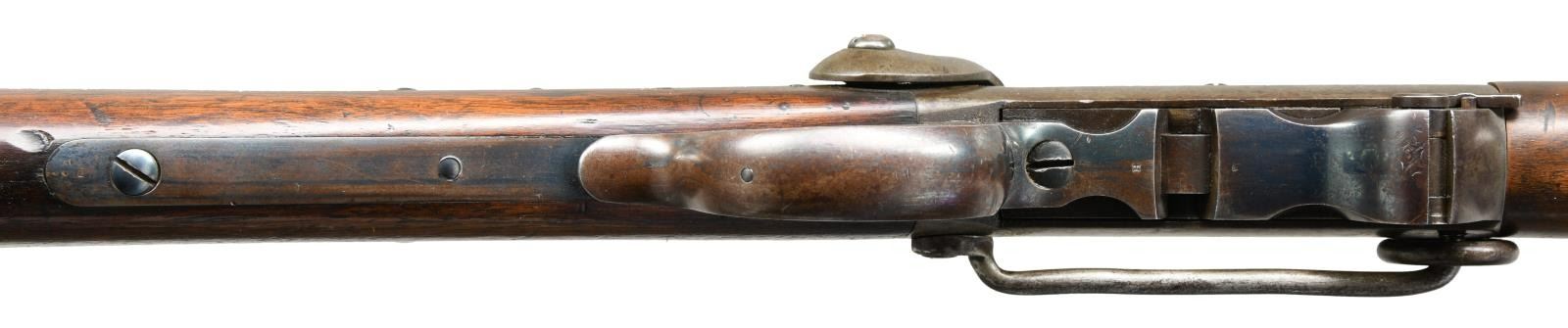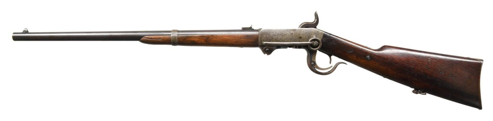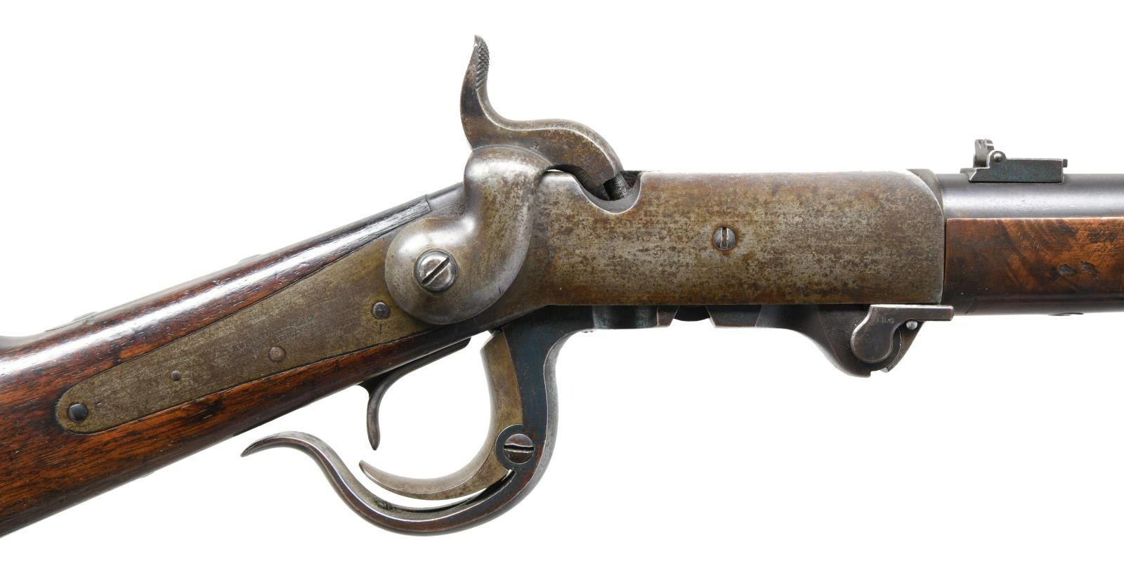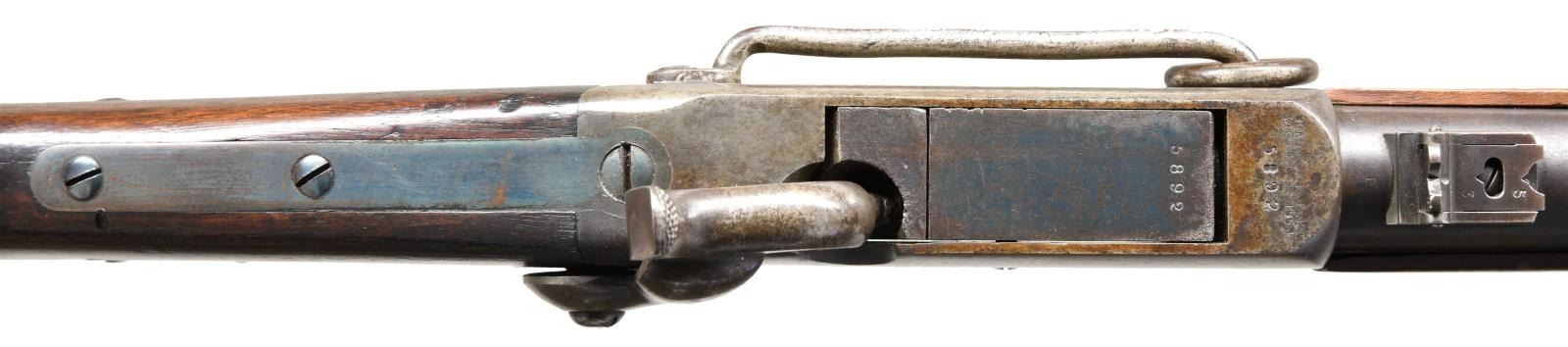 Cal. 54. S# 5892. Bbl. 21". Blade front sight. Folding leaf rear sight. Fifth model w/ left side receiver screw. Matching numbers on breechblock & receiver. Top of receiver marked "BURNSIDE PATENT MODEL OF 1864". Left side of reciever has saddle bar & ring. Walnut stock & forend w/ bottom mounted sling swivels. Left side of butt has two strong inspector's cartouches & two sets of carved initials that appear to read "CM". CONDITION: stock set has older added oil finish w/ a 1 1/2" chip at left front of forend, some scattered dings & handling wear. Action is a pleasing smoky gray patina w/ strong trace of original blue & case colors & some scattered oxidation. Bbl. retains a strong amount of original blue w/ scattered fading & oxidation. Pitted bore w/ evident rifling. PROVENANCE: From the Lifelong Collection of Glen E. Mattox. (01-22517/MJC). ANTIQUE. $2000-3000.
