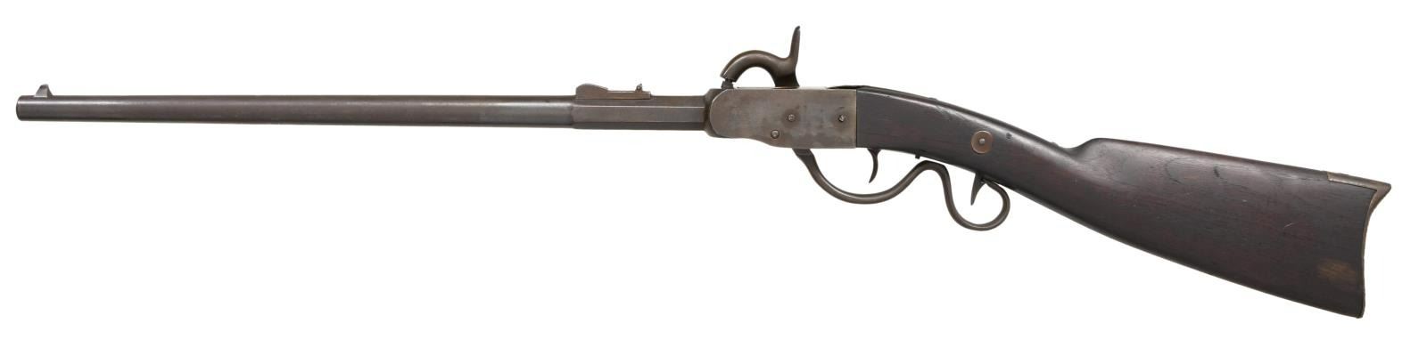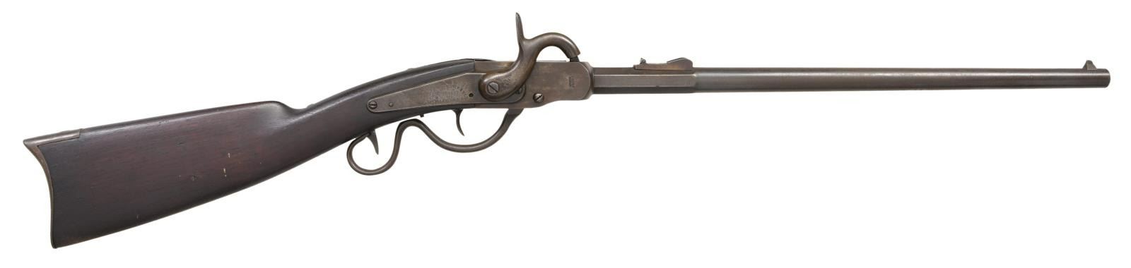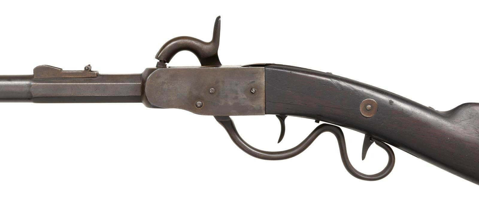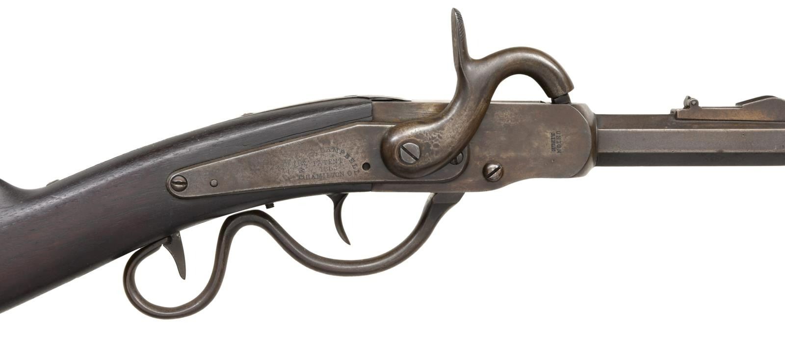 CARBINE. Cal. 52. S# 3094. Bbl. 20". Edward Gwyn and Abner Campbell of Hamilton, OH manufactured approx. 4,200 of the type 1 carbine, also known as the "grapevine", in the years 1863 & 1864. Octagon to round barrel with large, raised sight 1/2" from the muzzle, and a fixed folding rear sight. The bottom facet is stamped "20" & the serial number, "3094". The receiver is stamped "UNION RIFLE" on the right side with "20" & "3094" underneath. The lock plate is marked "GWYN & CAMPBELL PATENT 1863 HAMILTON O". Iron trigger guard & buttplate. Walnut stock with visible cartouche on the left side. CONDITION: barrel has an oxidized, blued finish. Case hardened frame shows traces of colors, as does the lock & hammer. Action seems to function well. Stock shows general dents & dings with no major flaws. Very good bore. (01-24121/BF). ANTIQUE. $1,500-2,250.