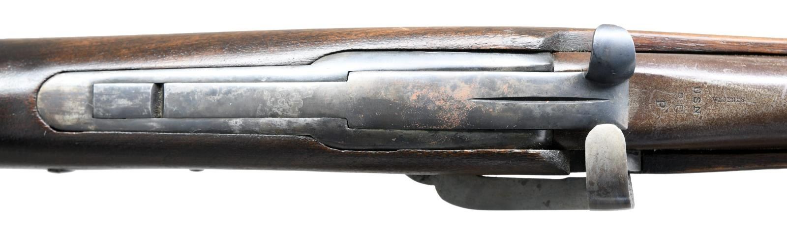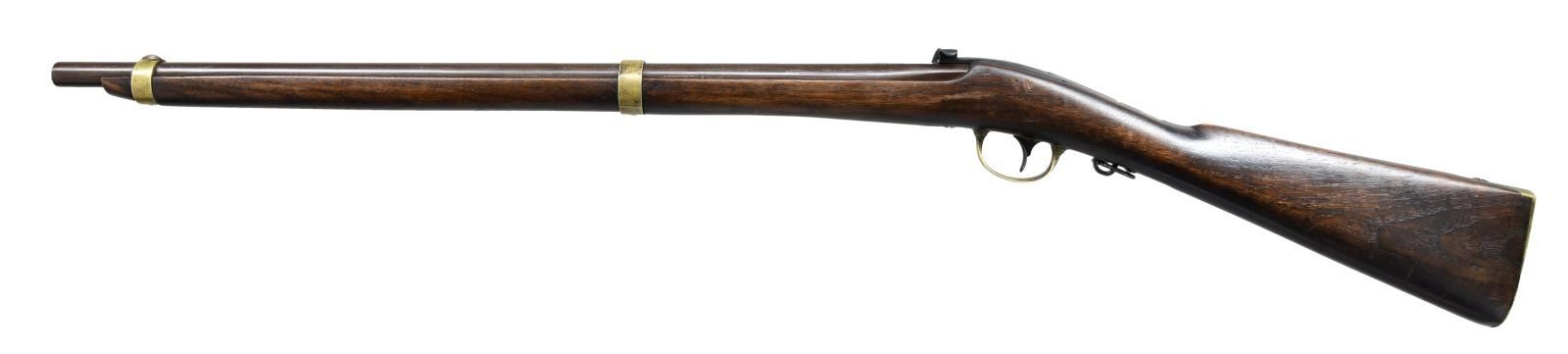 CAL. 54. S#. 1711. Mfg. 1843-46 with approx 4,250 produced. Bbl. 24 1/4" rd held with two brass bands the front band has an integral blade front sight. CONDITION: Metal components have a pleasing patina with good markings. Stock is a well made and fit modern replacement without any markings present showing only light handling marks. Very good bore with nice rifling and light frosting. (01-23179/ZAL) ANTIQUE $1500-2250