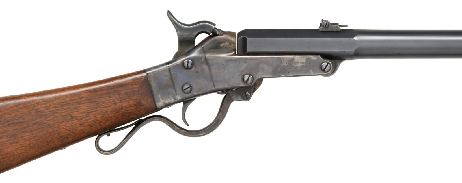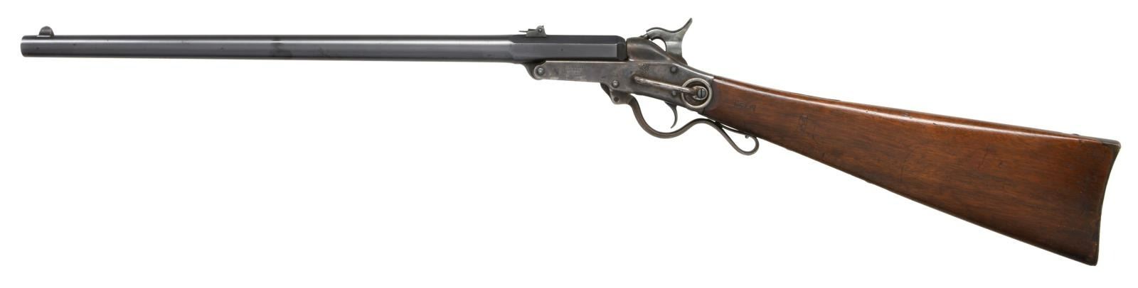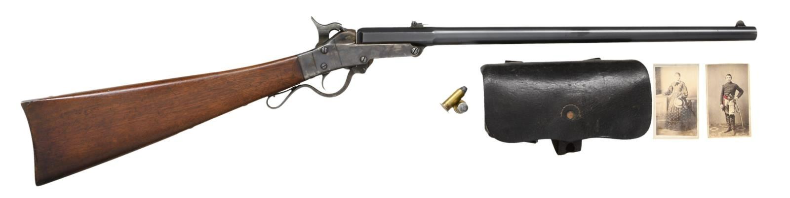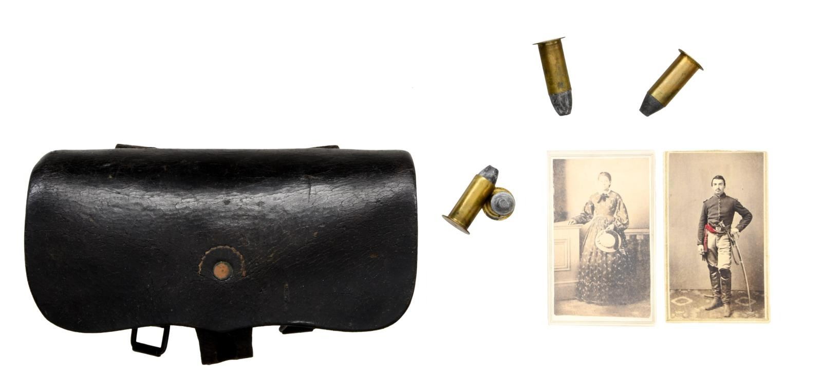 CARTRIDGES, CDV OF CAVALRYMAN FROM MAINE ESTATE. Cal. 50. S# 15479. Second model Maynard in standard configuration, 20” blued octagonal to round barrel, adjustable 2-leaf rear sight, case hardened frame with 4-line patent and 3-line manufacturer’s address on either side. Carbine cartridge box has 6 cartridges (plus an excavated example). CDV of cavalryman with sword belt, cavalry saber, and Colt army revolver, additional CDV of Bella Stuart, nee Doris Belle Isle, with OH backmark. We are told this image was from Portsmouth, OH at an underground railroad final “station”, where she was registered as a free person, photographed and married before travelling to Springvale, Maine. She had been “freed” from her enslavement in New Orleans, and processed through the Ohio depot; her freedom (and new life as a farm wife & mother in rural, southwestern Maine) was a direct result of the Union Victory. UNATTACHED ACCESSORIES: copy of email explaining family connection of CDVs. CONDITION: Carbine is fine retaining most of it original blue and muted case colors, stock shows minor wear with 2 bright inspector cartouches, mechanics are crisp, bright shiny rifled bore. Carbine cartridge box very good, sound & solid, cartridges look like issued. Cavalryman CDV is crisp with excellent detail, other is 2nd generation but good detail. (01-23973, 02-19984/JS). ANTIQUE. $2,500-3,000.