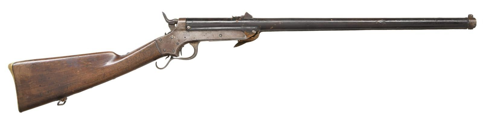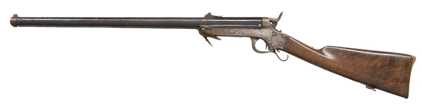 CAL. 52 RF. S#. 6935. Mfg. 1862-65 with approx 6,680 navy variants produced. This example has period added markings "P/G G" on the left side of the frame. Bbl 24" with leather protective covering secured by two screws at the breech and a band of steel at the muzzle with German silver blade front insert front sight. Original unmarked walnut buttstock that terminates with a brass buttplate. CONDITION: Overall very good with very nice leather covering showing some crazing and areas of some mild deterioration at the breech where action movement occur. Metal surfaces have a balanced grey patina and some spots of old surface oxidation. Good crisp markings. Stock has some scattered handling marks and a grain check crack at the butt. Good bore with frosting in the grooves and deep sharp rifling. PROVENANCE: From the Lifelong Collection of Glen E. Mattox. (01-22562/ZAL) ANTIQUE $1000-1500