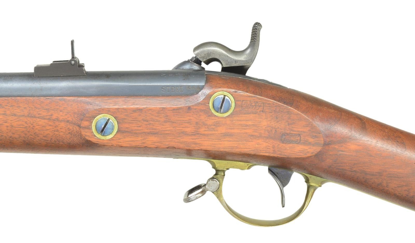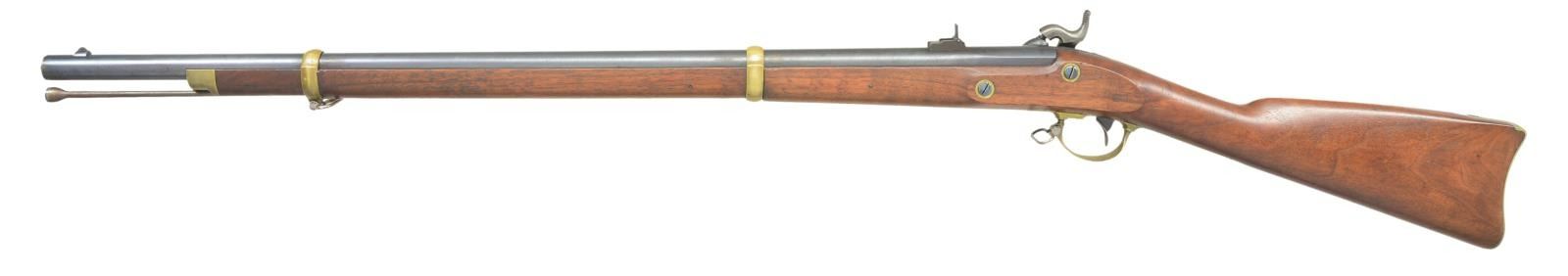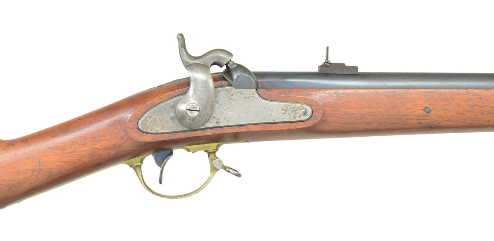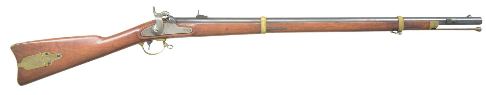 RIFLE. Cal. 58. NSN. Standard configuration of the popular brass mounted Civil War rifle, 33" blued barrel marked at breech "1863" & "V" / "P" & eaglehead proofs. "STEEL" & inspector "HSL" left side. 2-leaf 3-position rear sight and saber bayonet lug. Case colored lock stamped with eagle and "REMINGTON'S / ILION, NY" and "1863 at tail. Brass furniture and straight grain stock with 2 crisp inspector cartouches. Many are found in very fine condition like this one retaining most of its original finish. CONDITION: Fine to excellent overall, complete & matching, retains 90% plus original thinning blue, traces of case colors on lock and hammer toned to overall silver/gray. Brass toned to light mustard color. Stock is fine, crisp cartouches, scattered cosmetic blemishes. Mechanically fine with bright shiny rifled bore. PROVENANCE: From the Lifelong Collection of Glen E. Mattox. (01-22513/JS). ANTIQUE. $2,000-3,000.