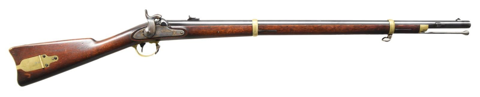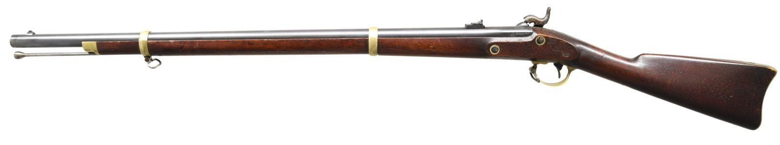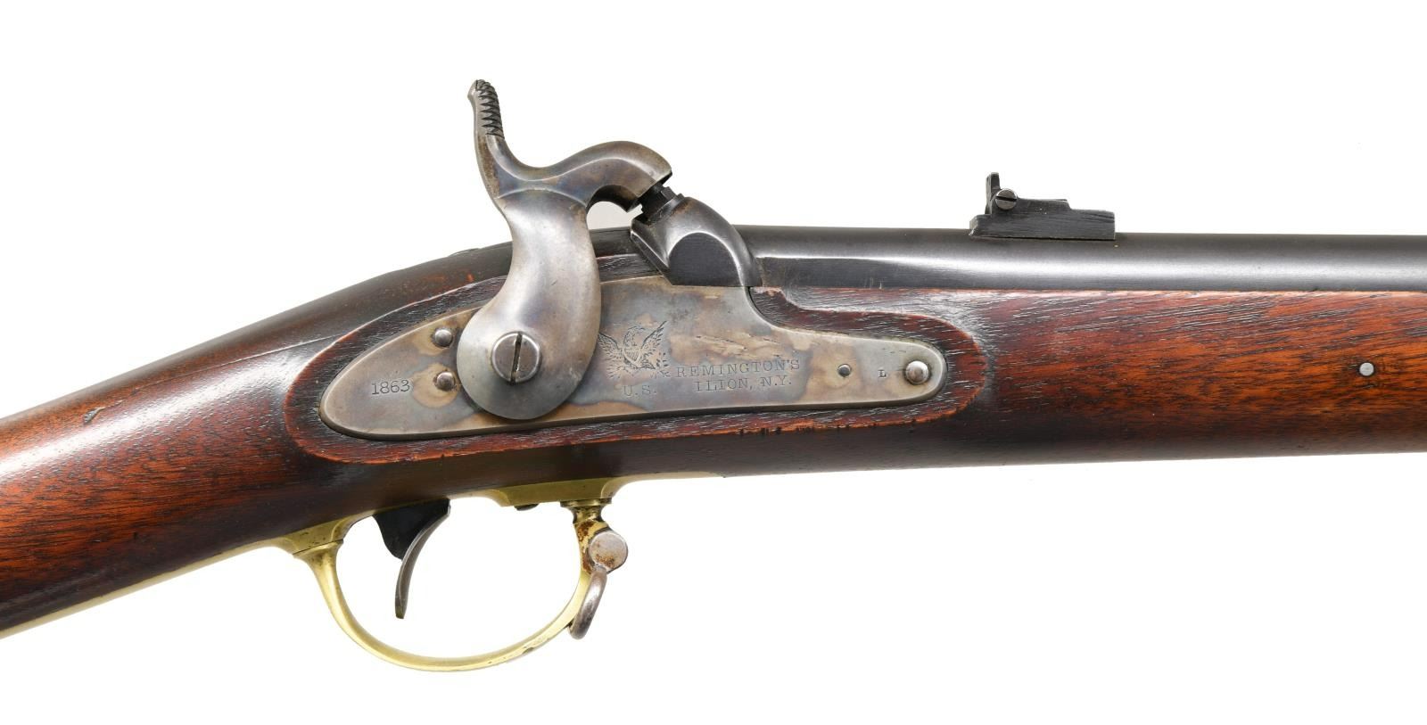 Cal. 58. NSN. Bbl. 33". The Remington M1863 contract rifle is commonly called a zouave rifle by collectors. Remington made a total of 12,501 of these attractive rifles between 1862 & 1865. Round barrel with flattened sides featuring a large, square bladed sight 1 1/4" from the muzzle. 4" from the muzzle on the right side is a large lug to accept the saber bayonet for this model. There is a fixed folding sight 3 1/2" up from the breech. The breech is marked on the left facet "STEEL R.K.A.", and on the top "1863 V / P / (eagle head)". The lock is marked "(eagle) U.S. REMINGTON'S ILION, N.Y." in front of the hammer, and to the rear of the hammer is "1863". Brass trigger guard, patchbox, "US" marked buttplate, lock plate screw washers, barrel bands, and nosecap. Steel sling swivels & ramrod. Fine walnut stock with 2 large, easily visible cartouches on the left side opposite the lock. CONDITION: barrel retains nearly all of its original blued finish. Case colors are on the lock. Brass has a light, pleasing patina. Stock shows very little wear. Excellent bore. (01-24220/BF). ANTIQUE. $2,800-3,500.