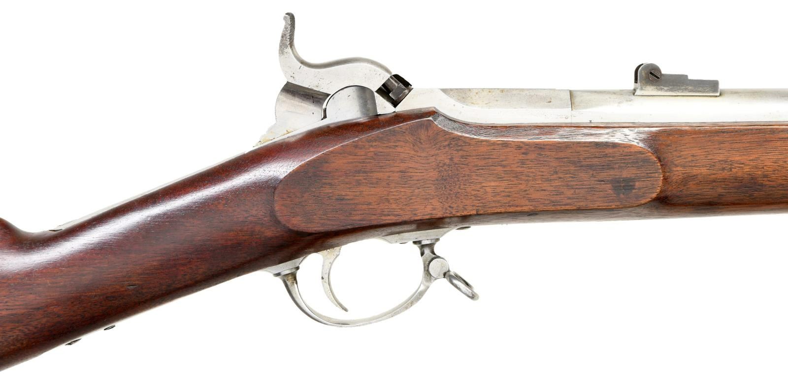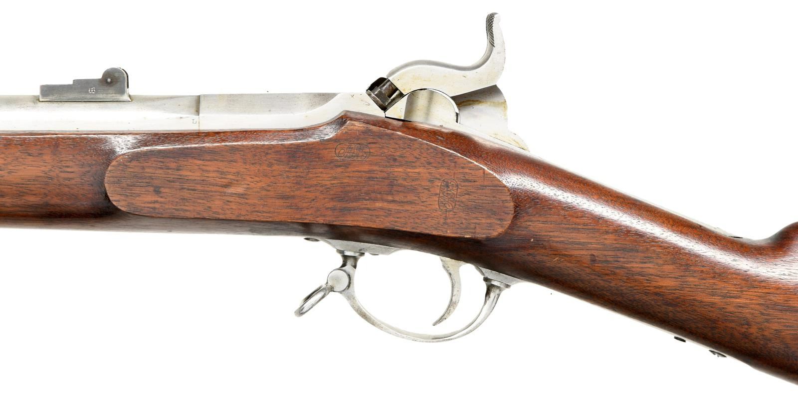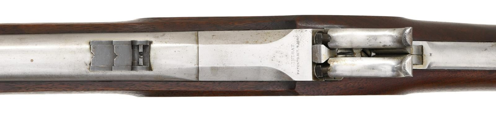 YORK. Cal. 58. NSN. Bbl. 41 1/8". One of the stranger muskets contracted for by the US Government was the double rifle musket produced by J.P. Lindsay of New York. About 1,000 of these strange weapons were produced between 1863 & 1864. Two full charges were loaded in the single barrel and were fired separately using double hammers and a single trigger. This design, of course, led to problems with both charges firing simultaneously, and the troops in the field were distrustful of the weapon. The gun has a slightly octagon to round barrel with a rectangular sight or bayonet lug near the muzzle. There is a blued folding rear sight. The top of the breech is marked "LINDSAY PATENT'D . OCT. 9. 1860". Blued nipples. Iron trigger guard, "US" marked butt plate, barrel bands, sling swivels, nose cap, and ramrod. Stock has 2 clearly visible cartouches on the left side. CONDITION: this rifle shows extremely light wear and was likely never issued. All iron parts seem to have their original bright finish. The blue on the rear sight & nipples is nearly 100%. The stock shows handling wear only. Mechanically, the gun functions perfectly. Excellent bore. (01-24148/BF). ANTIQUE. $4,500-6,000.