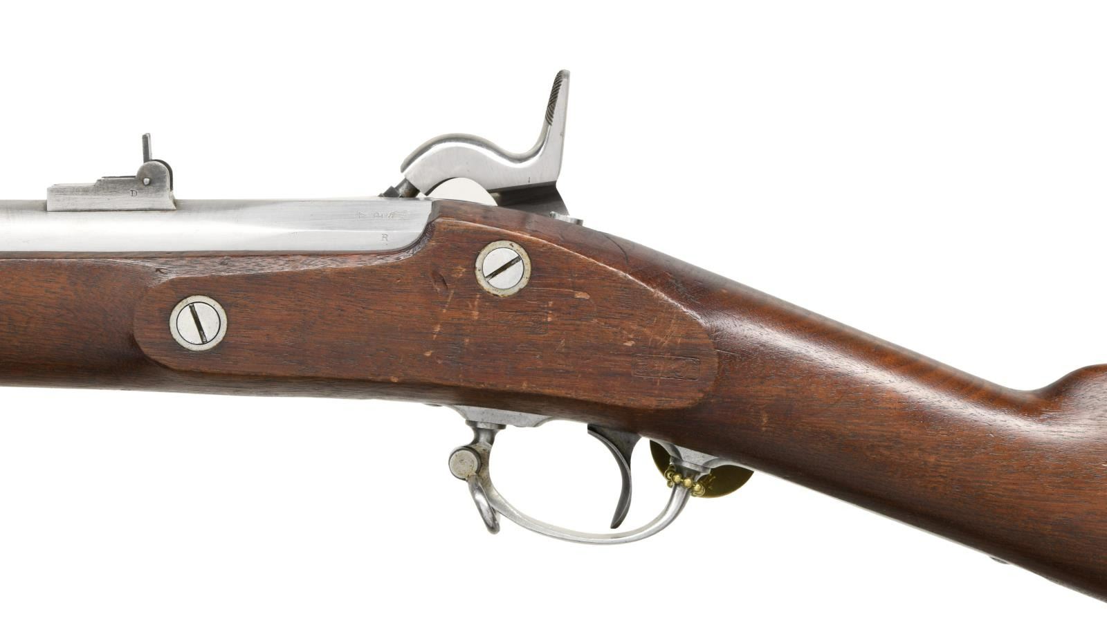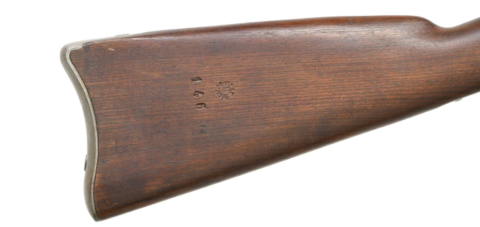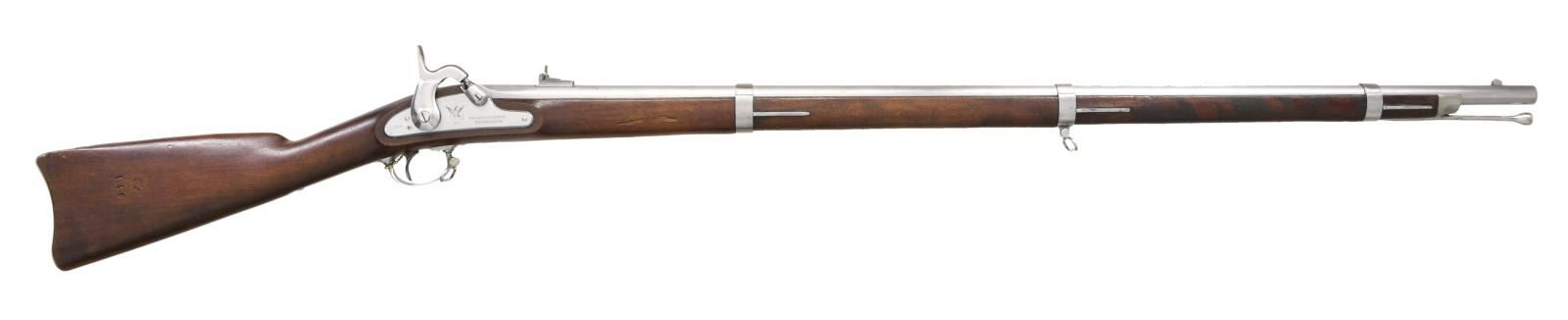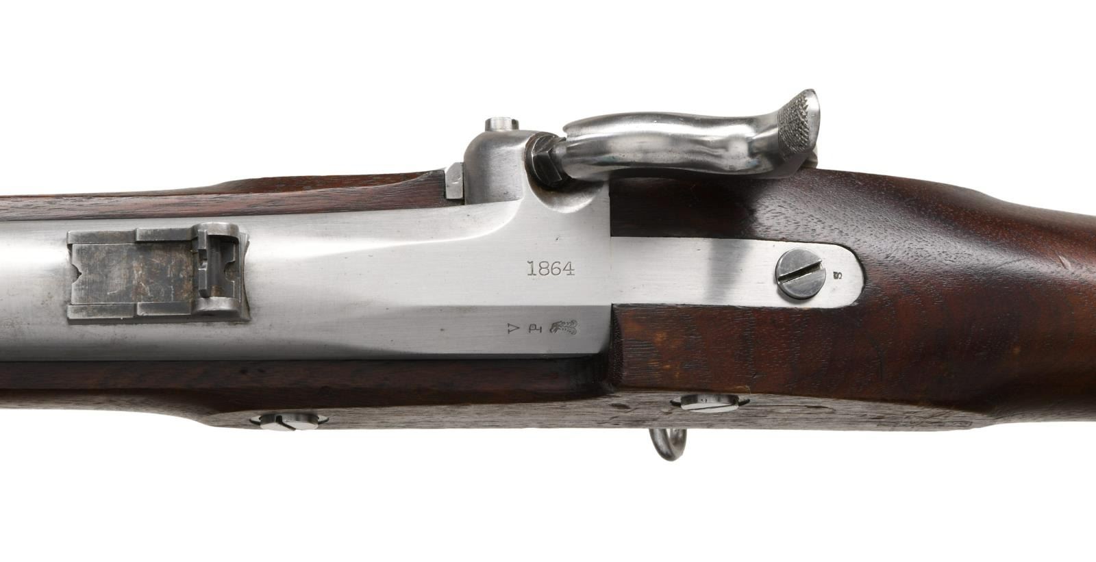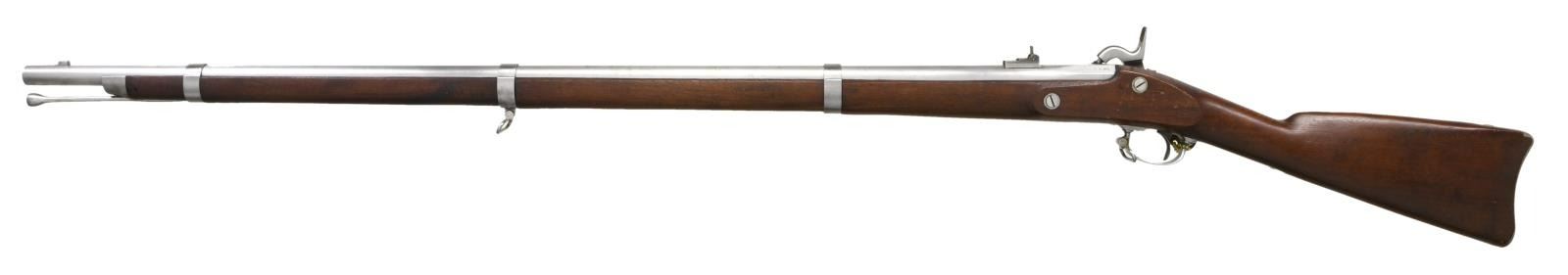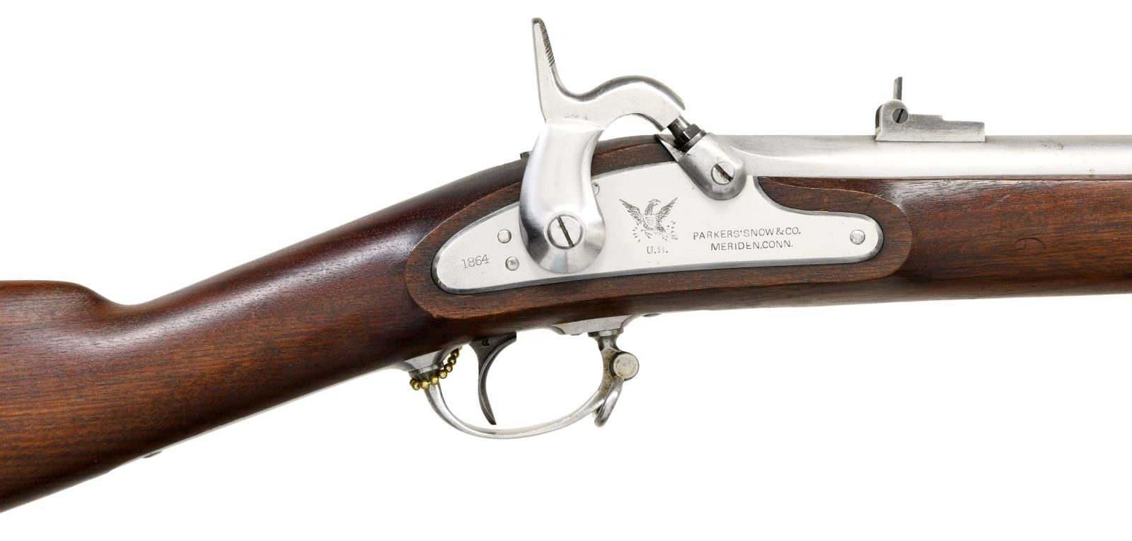 MODEL 1861 RIFLE MUSKET. Cal. 58. NSN. Standard configuration, 40"barrel, VP/eagle head proofs, "1864" dated, 3 position rear sight, 3 flat barrel bands. Lock is marked forward of hammer w/ eagle over "US" and "PARKER SNOW & CO / MERIDEN, CONN" & dated "1864"at tail. Parker Snow Company delivered a total of 15,000 1861 muskets between 1863 and 1864. This is a fine superior condition survivor of a scarce contract Civil War musket with bright metal, 2 crisp inspector cartouches, raised grain stock that shows little use. CONDITION: fine overall, bright metal, crisp markings, stock has sharp edges, 2 well defined inspector cartouches. Mechanics are crisp, bright shiny bore with small patches of pitting. There is an unusual stamp in right buttstock "VILLE DU HAVRE" in circle around "M" and "146". (01-24146/JS). ANTIQUE. $2,500-3,000.