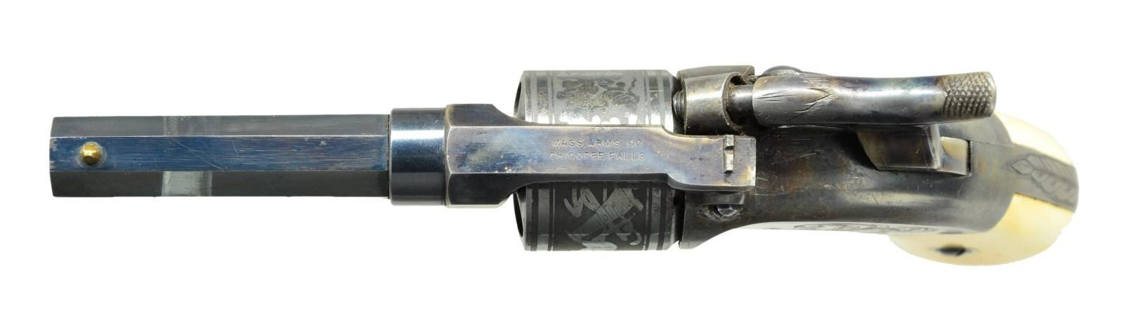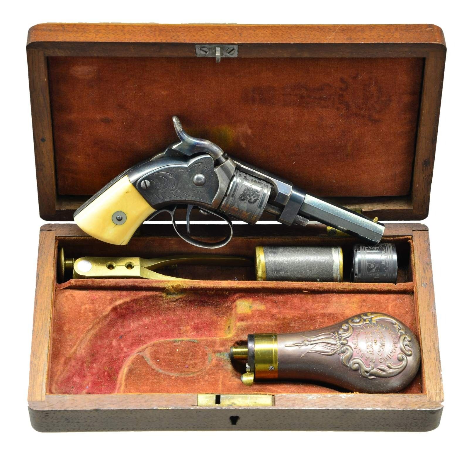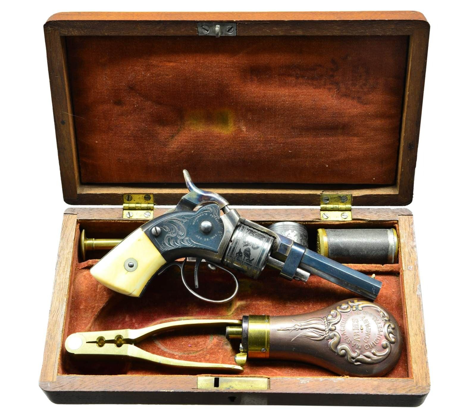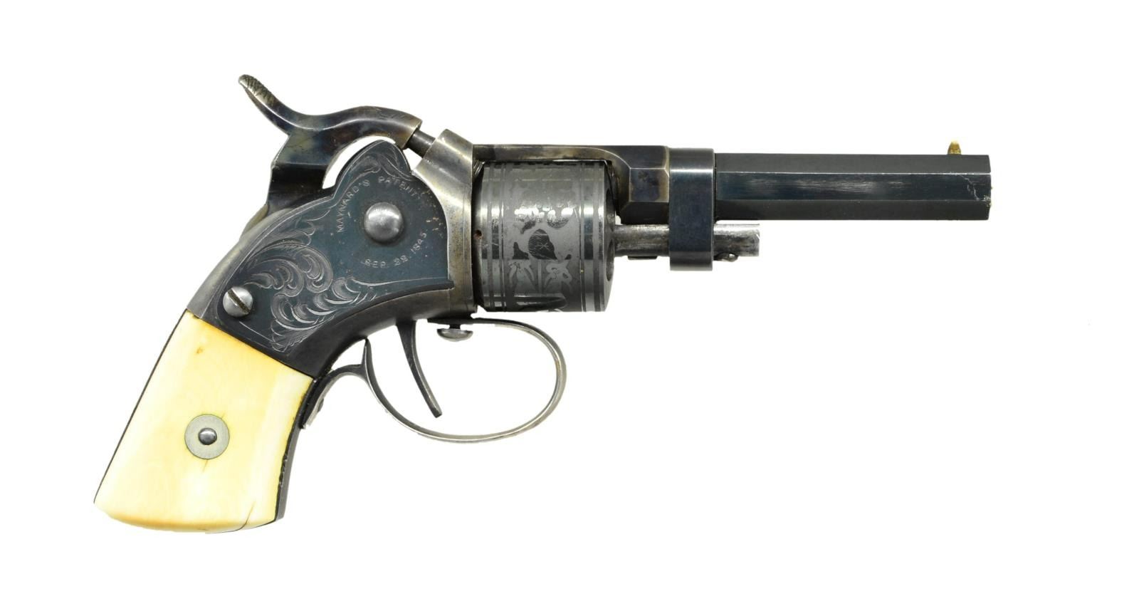 PERCUSSION POCKET REVOLVER IN SUPERB ORIGINAL CONDITION. Cal. 28. S# 190. It is estimated that fewer than 900 of these interesting early revolvers were produced. This example is of the first style with manually rotated cylinder. It has 2 1/2" blued octagon rifled barrel which is unmarked. Barrel unlatches from central spindle, it then hinges upward allowing 6 shot cylinder to be removed for loading. Top of barrel shank is marked "MASS ARMS CO" "CHICOPEE FALLS". Blued action with centrally hung case hardened hammer has Maynard tape priming system under sideplate on right side. Sideplate is marked "MAYNARD'S PATENT" "SEP. 22 1845". Large open scroll engraving is also on sideplate which matches the left side of action. Cylinder is etched with decorations of cannons, flags and floral scroll designs. In this early model, cylinder is unlatched by button at top of trigger guard bow and cylinder is rotated manually for the next shot. S# 190 is stamped on right side front grip strap under white bone grips that are inscribed in ink with matching numbers. S# also appears on right side of action under sideplate which is also correctly numbered. UNATTACHED ACCESSORIES: revolver is housed in its original walnut case with key lock which is lined in red velvet. Case contains a superb condition Mass Arms Co. copper bodied powder flask embossed with scrolls, flags and a mans arm firing a pistol. There is also a brass and tin container holding Maynard tape primers with Maynard and Mass Arms info on cover. Also included are two cavity brass bullet mould, brass loading rod and a spare cylinder. CONDTION: exceptionally fine. Pistol retaining nearly all original factory finishes with bright blue on barrel having one or two minor marks. Case hardening of barrel shank and hammer are excellent. Frame shows considerable flaking to around 40% blue. Trigger guard retains most of its silver plate. Cylinder retains nearly all of its bright blue. There are a number of scratches and marks on spindle from uneducated attempts to remove cylinder. Grips are excellent with slight shrinkage cracks at bottom. Bore is bright and shiny. There is some cleaned rusting evident on recoil shield. Mechanically good, tape priming system is working. Exterior of case retains most of its original varnish. Interior cloth is considerably faded and has compressions and marks. Accessories are exceptionally fine with brass remaining bright and shiny. (01-21940/MGM). ANTIQUE. $4,500-6,500.