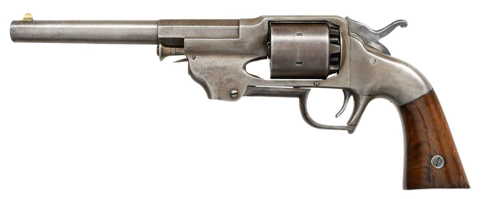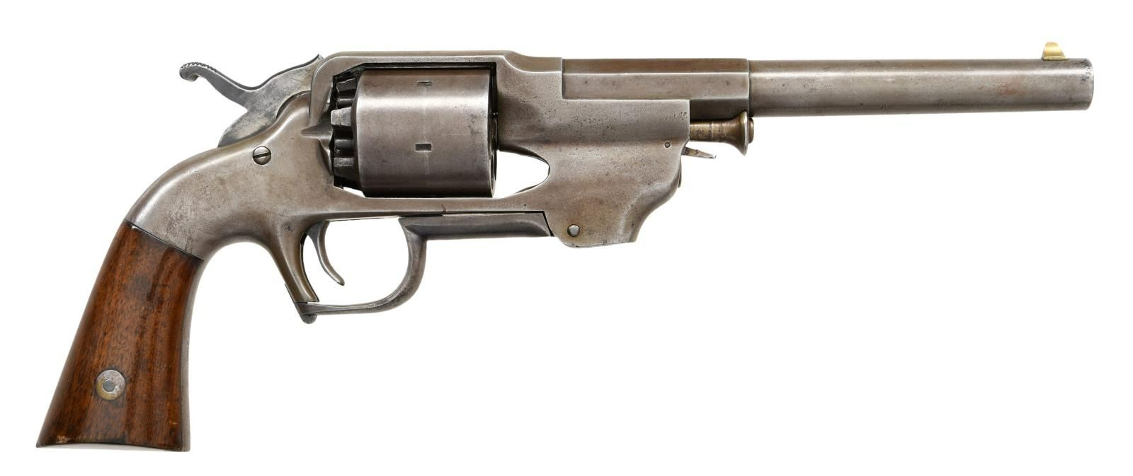 Cal. 44. S#. 367. Bbl. 7 1/2" round with octagon shank. 6 shot round cyl. Folding loading lever forms the trigger guard. 2 piece walnut grips. mfg. 1861-1862. CONDITION: Metal shows a smooth gray/brown indicating touch up finish. Sanded grips have gloss finish over handling marks with small chips & dents at butt. Functioning action. Pitted bore with worn rifling. PROVENANCE: From the Lifelong Collection of Glen E. Mattox. (01-22371/DS). ANTIQUE. $1500-2250.