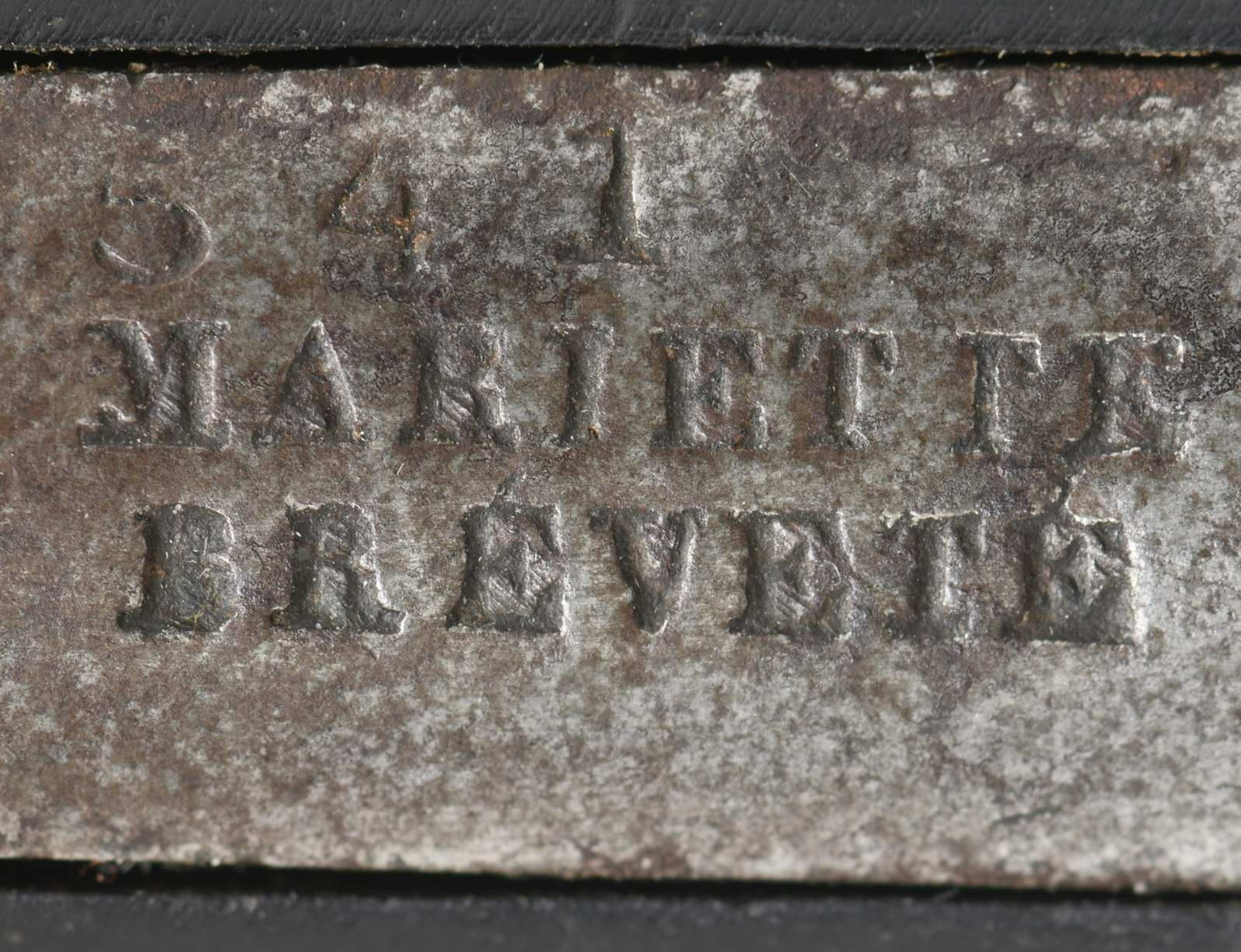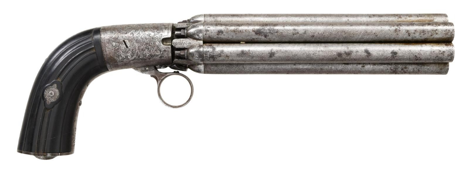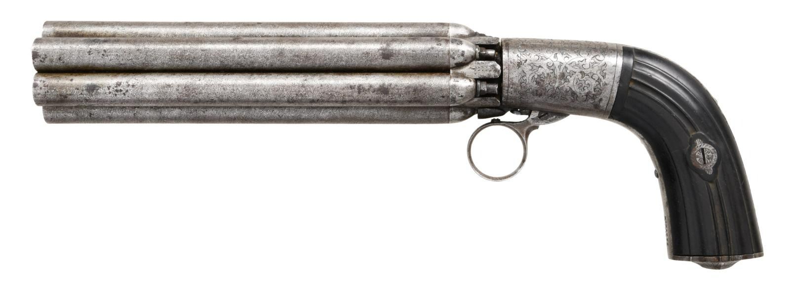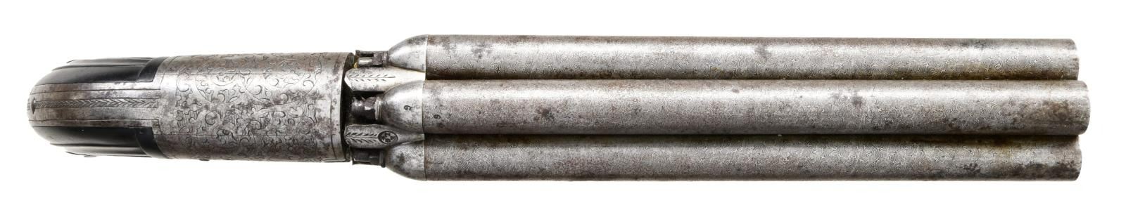 PISTOL. Cal. 36 S# 541. 11.5" overall, cluster of six 6.5" smoothbore Liege proofed barrels, ring trigger, marked with serial number & "MARIETTE / BREVETE" inside grip strap, engraved frame & butt cap, mounted with fluted Ebony grips. CONDITION: good overall, damascene pattern visible on barrels, sharp engraving, metal has mottled gray patina, grips well fit with few scratches. Mechanics need attention, clear smooth bores. (01-23156/JS). ANTIQUE. $2,500-3,500.