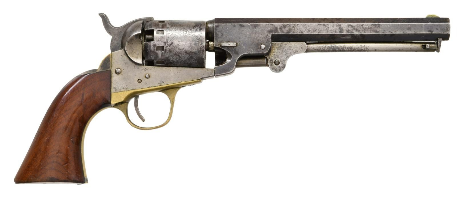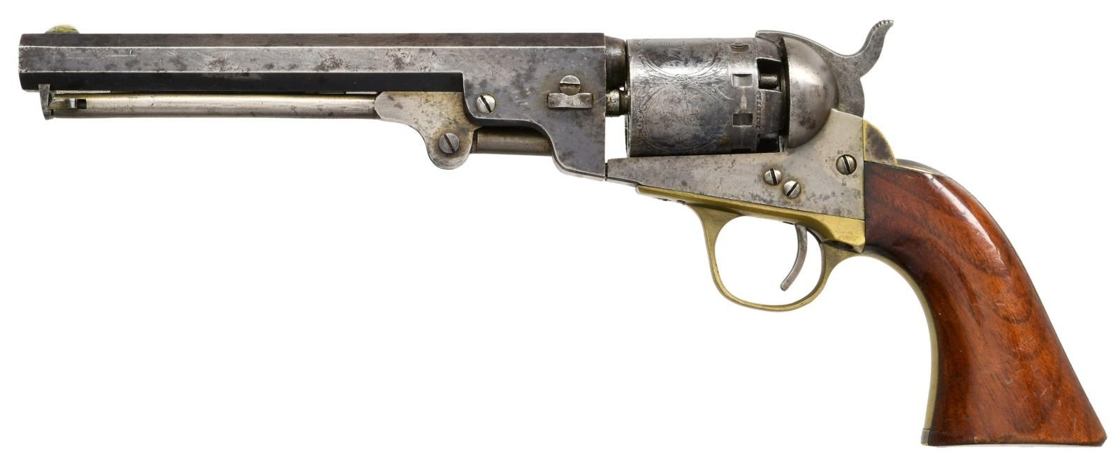 REVOLVER. Cal. 36. S#. 48519. bbl. 6 1/2" octagon with German silver blade sight. 5 shot round cyl. with oval panel roll engraving. Original finish was blue & case colored with silver finished brass grip straps. 1 piece walnut grip. Estimated production of 78,000, 1859-1868. CONDITION: Bbl. shows some faded blue with spots of pitting. Cyl retains good scene with 40% blue. Frame & loading lever have traces of case colors. Backstrap retains 50% silver showing a dark tarnish. Cleaned trigger guard is acquiring a mild tarnish. Grips show handling marks & light wear. Sound action. Bore has good rifling with areas of light pitting. PROVENANCE: Marshall "Brook" Davis Collection. (01-23541/DS). ANTIQUE. $1000-1500.
