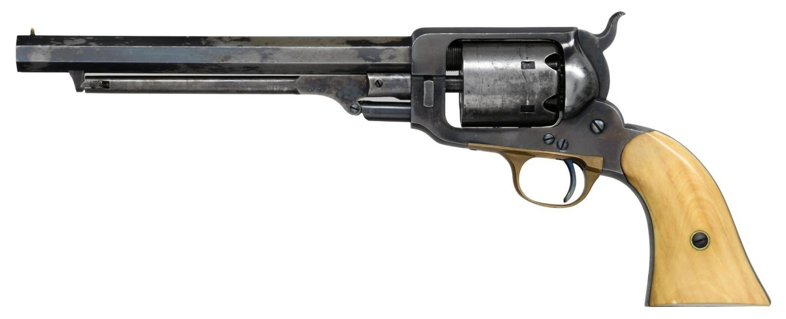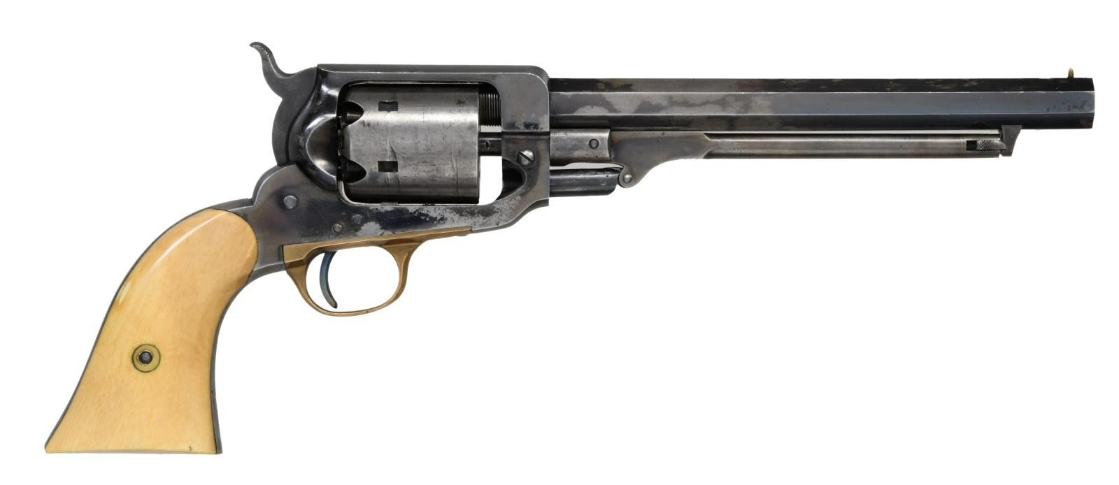 Cal. 36. S# 9925. Bbl. 7 1/2". A beautiful example of a Whitney revolver with certifiably antique ivory grips. The top of the octagon barrel is marked "E. WHITNEY N. HAVEN". The frame is unmarked. Lion cylinder scene. Case hardened loading lever. Brass trigger guard. Ivory grips. CONDITION: the entire gun has approx. 80% of the blued finish remaining. The loading lever has excellent case colors. Action seems tight and functions perfectly. Grips are undamaged. Excellent bore. (01-24217/BF). ANTIQUE. $2,750-3,750.