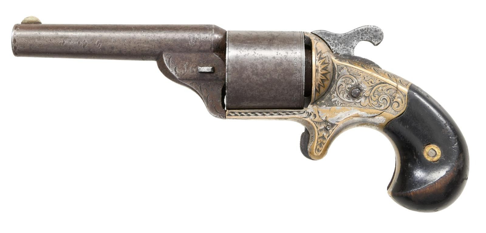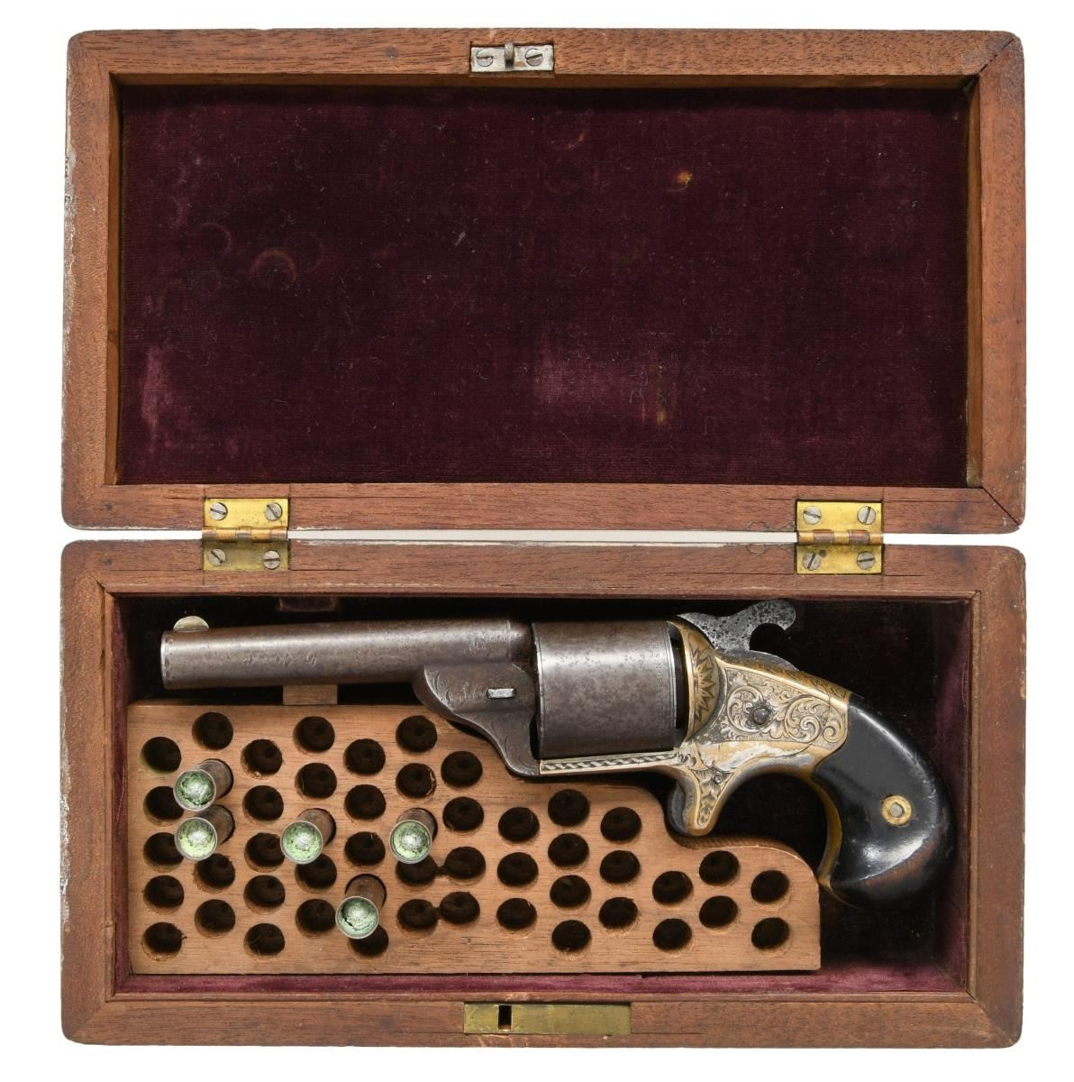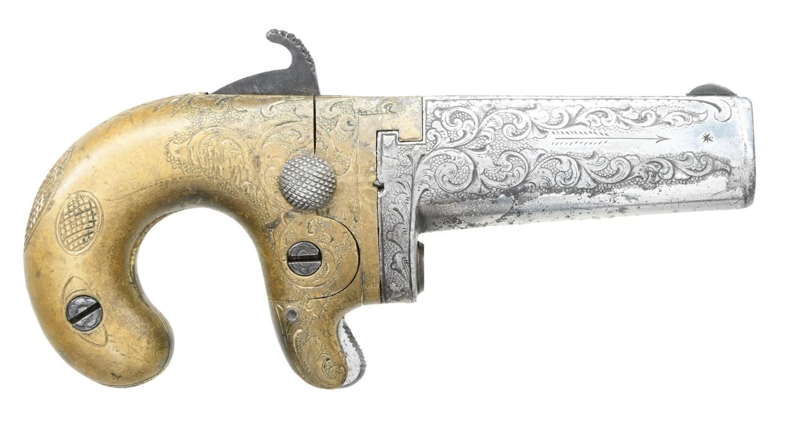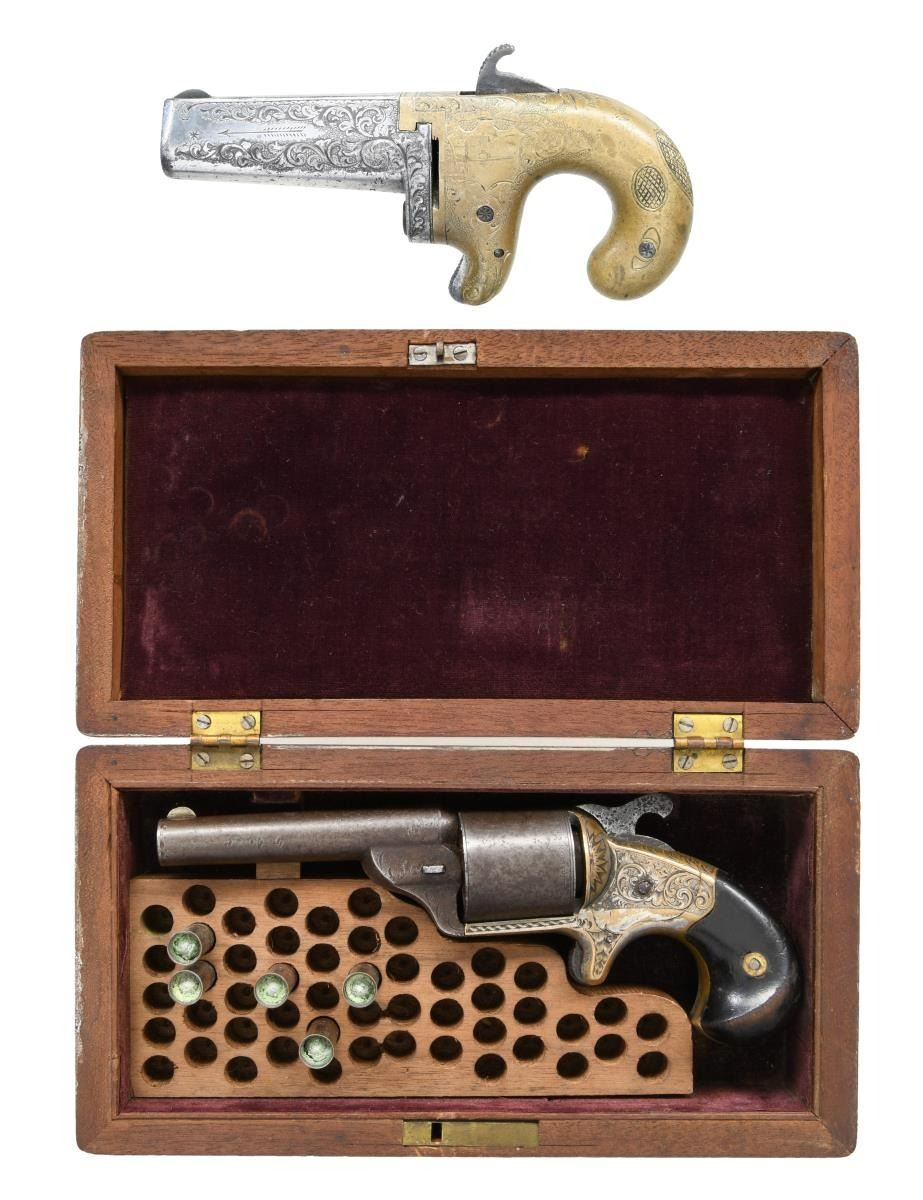 FRONT LOADING REVOLVER AND NO. 1 DERRINGER. GUN 1) FRONT LOADING REVOLVER. Cal. 32 Teat-fire. S# 16178. Bbl. 3 1/4". A total of about 30,000 of these pistols were manufactured from 1864-1870. This pistol has a round barrel w/ semi-circular German silver front sight. Right side of lug has a hooked extractor. Six shot round cyl. Silver finished brass frame w/ generous coverage of well executed, attractive hand engraving. There is also engraving on the front of the frame and at the base of the barrel. 2-piece bird's head wooden grips. Backstrap is inscribed "A. J. Bisel U.S.N.". Amos Bisel was initially in the Pennsylvania Volunteer Infantry before transferring to the United States Marine Corps. He served on the Ironclad, the USS Benton beginning w/ their service on the Mississippi in early 1862 for the duration of the war. The revolver is housed in a wooden case measuring 8 1/2" x 4 1/2" x 2" w/ burgundy velour fitted interior. An interior 50-hole cartridge block contains 5 original teat-fire cartridges for the revolver. UNATTACHED ACCESSORIES: a large folder containing photographs of Bisel & the USS Benton. Many pages of the history of the USS Benton are included. Also included is historical information about Mr. Bisel & copies of his letters from home describing the USS Benton's actions. CONDITION: bbl. & cyl. have faded to brown showing small dings & a few scattered spots of oxidation. Brass frame retains areas of original silver finish on the sides & protected areas. Grips have a worn finish attesting to the pistol's years of service. Action functions well. Good but dirty bore. Case shows light wear & handling marks w/ tight drying cracks in the lid. Cartridges have light oxidation to the lead. (01-24143/DS/BF). 2) NO. 1 DERRINGER. Cal. 41 RF. S# 1361. Bbl. 2 1/2". Approximately 6,000 of these classic derringers were manufactured by Moore & National brands between 1860-1870. This visually attractive example has an elliptical shaped, silvered barrel that is nearly completely covered with fine engraving. The engraving is a very scarce variation w/ large arrows engraved on each side of the bbl. Top flat is marked "MOORES PAT. F. A. CO. BROOKLYN N.Y.". Bottom of bbl. is marked "PAT. FEB. 2, 1863". This pistol has a 1-piece frame & grip w/ spur trigger & center mounted hammer. The entire frame originally had vivid gold plating and broad scroll decorative engraving. The top left of the frame is engraved in a ribbon "ROBT. L. MAY, U.S.N." above a shield depicting a monitor sailing past what appears to be Fort Sumter flying a flag. Robert L. May graduated from the United States Naval Academy in 1849. He initially served on the Steam Frigate Susquehanna in the East India Squadron. He served on numerous ships before being assigned to the USS Benton. UNATTACHED ACCESSORIES: large folder of printed & copied information pertaining to Lieutenant Robert L. May and the USS Benton, its crew & also many pages of documents regarding financial matters of the ship & crew. CONDITION: bbl. retains 50% of the original silver finish w/ some areas showing tarnish. The gilded brass frame has traces of gold plating remaining in the protected areas. The balance has acquired a pleasing mustard patina showing a few dings & expected handling marks. Good but dirty bore. (01-24144/DS/BF). BOTH ANTIQUES. $7,000-10,000.