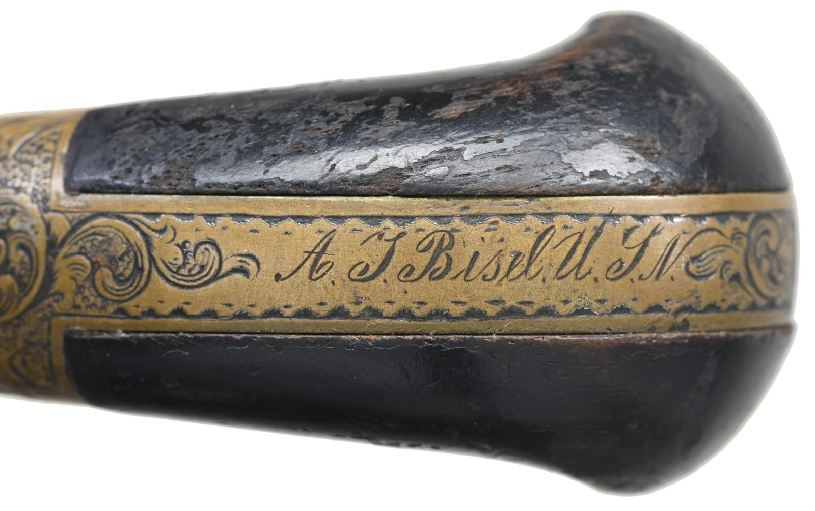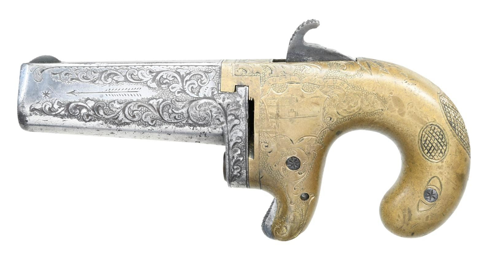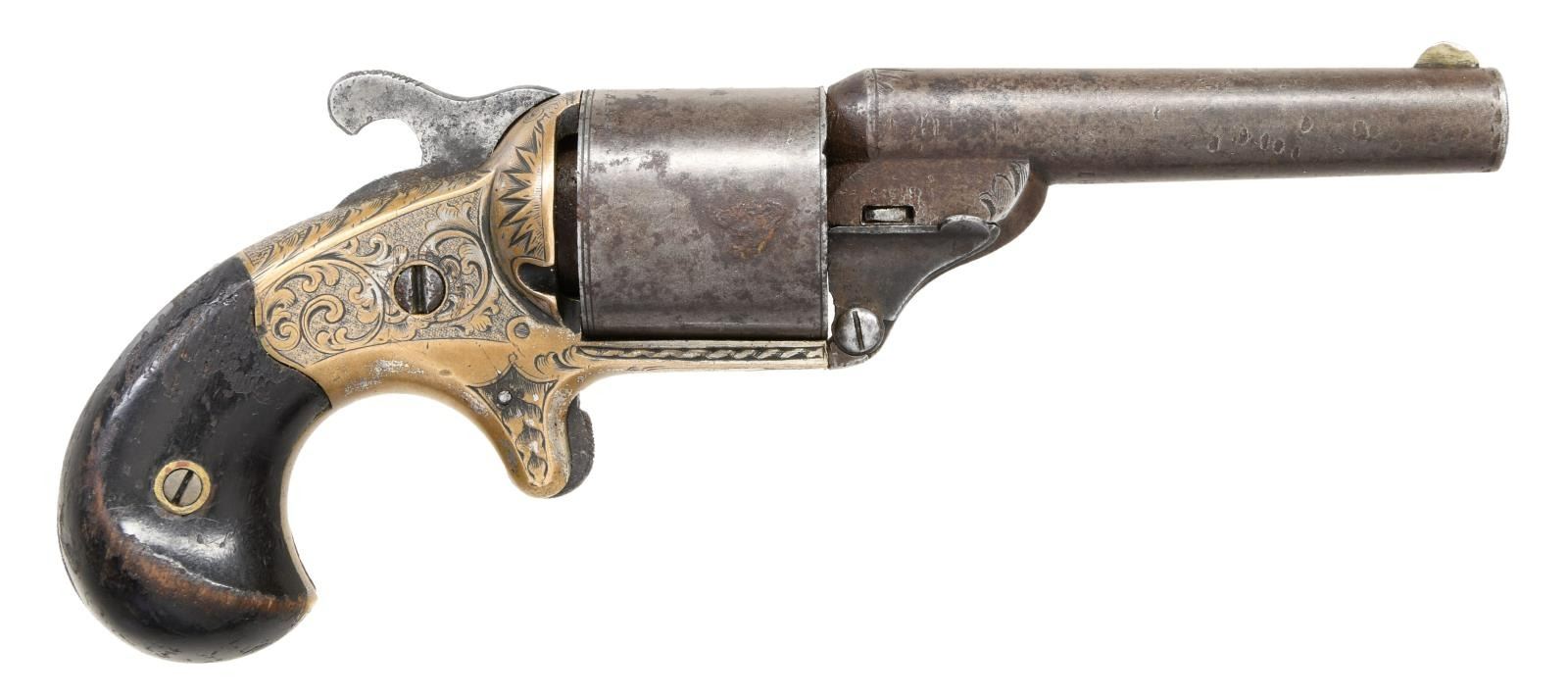 FRONT LOADING REVOLVER AND NO. 1 DERRINGER. GUN 1) FRONT LOADING REVOLVER. Cal. 32 Teat-fire. S# 16178. Bbl. 3 1/4". A total of about 30,000 of these pistols were manufactured from 1864-1870. This pistol has a round barrel w/ semi-circular German silver front sight. Right side of lug has a hooked extractor. Six shot round cyl. Silver finished brass frame w/ generous coverage of well executed, attractive hand engraving. There is also engraving on the front of the frame and at the base of the barrel. 2-piece bird's head wooden grips. Backstrap is inscribed "A. J. Bisel U.S.N.". Amos Bisel was initially in the Pennsylvania Volunteer Infantry before transferring to the United States Marine Corps. He served on the Ironclad, the USS Benton beginning w/ their service on the Mississippi in early 1862 for the duration of the war. The revolver is housed in a wooden case measuring 8 1/2" x 4 1/2" x 2" w/ burgundy velour fitted interior. An interior 50-hole cartridge block contains 5 original teat-fire cartridges for the revolver. UNATTACHED ACCESSORIES: a large folder containing photographs of Bisel & the USS Benton. Many pages of the history of the USS Benton are included. Also included is historical information about Mr. Bisel & copies of his letters from home describing the USS Benton's actions. CONDITION: bbl. & cyl. have faded to brown showing small dings & a few scattered spots of oxidation. Brass frame retains areas of original silver finish on the sides & protected areas. Grips have a worn finish attesting to the pistol's years of service. Action functions well. Good but dirty bore. Case shows light wear & handling marks w/ tight drying cracks in the lid. Cartridges have light oxidation to the lead. (01-24143/DS/BF). 2) NO. 1 DERRINGER. Cal. 41 RF. S# 1361. Bbl. 2 1/2". Approximately 6,000 of these classic derringers were manufactured by Moore & National brands between 1860-1870. This visually attractive example has an elliptical shaped, silvered barrel that is nearly completely covered with fine engraving. The engraving is a very scarce variation w/ large arrows engraved on each side of the bbl. Top flat is marked "MOORES PAT. F. A. CO. BROOKLYN N.Y.". Bottom of bbl. is marked "PAT. FEB. 2, 1863". This pistol has a 1-piece frame & grip w/ spur trigger & center mounted hammer. The entire frame originally had vivid gold plating and broad scroll decorative engraving. The top left of the frame is engraved in a ribbon "ROBT. L. MAY, U.S.N." above a shield depicting a monitor sailing past what appears to be Fort Sumter flying a flag. Robert L. May graduated from the United States Naval Academy in 1849. He initially served on the Steam Frigate Susquehanna in the East India Squadron. He served on numerous ships before being assigned to the USS Benton. UNATTACHED ACCESSORIES: large folder of printed & copied information pertaining to Lieutenant Robert L. May and the USS Benton, its crew & also many pages of documents regarding financial matters of the ship & crew. CONDITION: bbl. retains 50% of the original silver finish w/ some areas showing tarnish. The gilded brass frame has traces of gold plating remaining in the protected areas. The balance has acquired a pleasing mustard patina showing a few dings & expected handling marks. Good but dirty bore. (01-24144/DS/BF). BOTH ANTIQUES. $7,000-10,000.