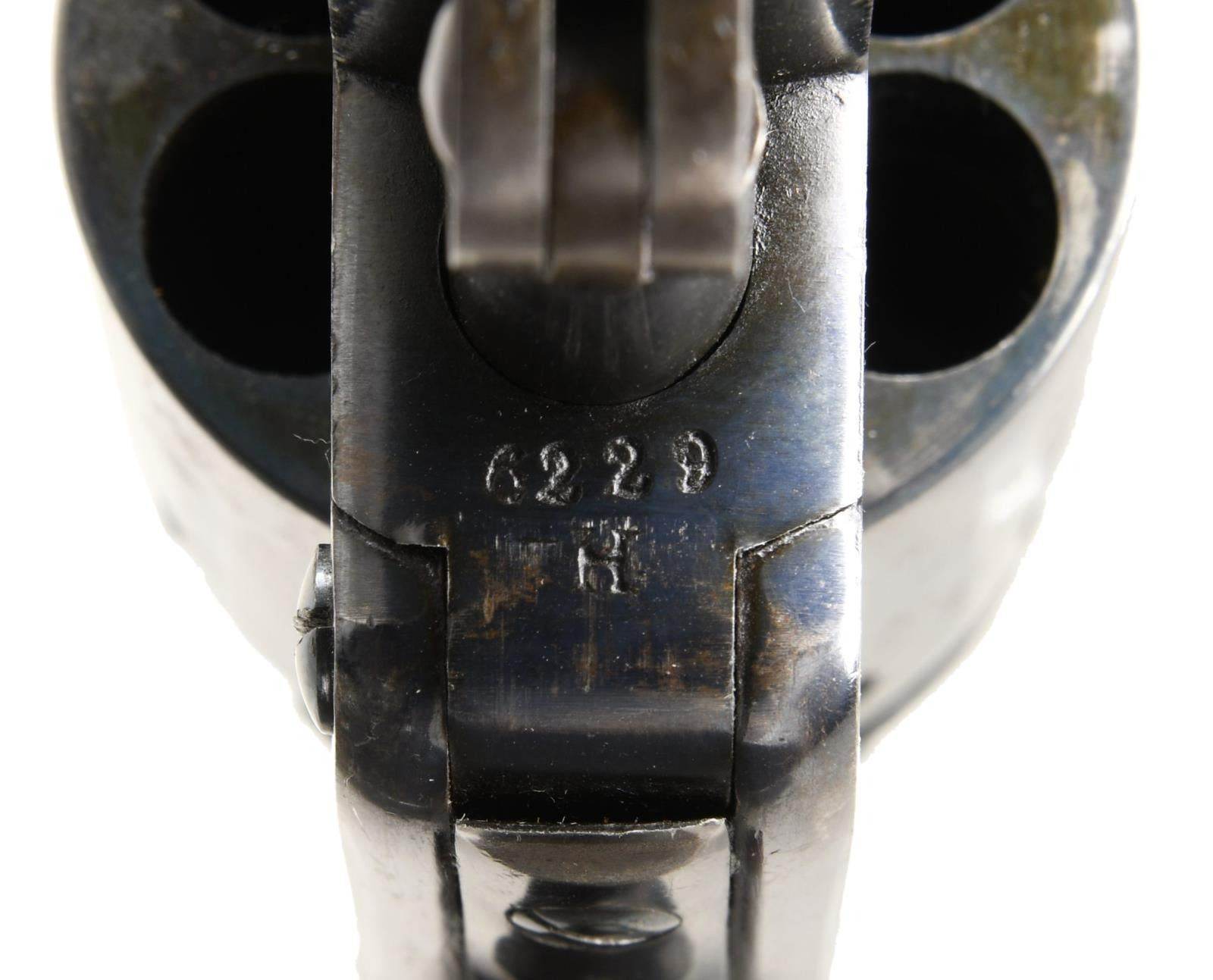 Cal. 44. S#. 6229. Bbl. 6" round with blade sight. Blue finish with case colored hammer, trigger & loading lever. 1 piece walnut grip has clear cartouches on both panels. Frame has "H" inspection mark. Approx. 23,000 mfg. late 1850's - early 1860's. CONDITON: Very fine retaining over 80% blue & 50% case colors. Grips show light wear. Strong mechanics. Surprisingly nice bright bore. PROVENANCE: From the Lifelong Collection of Glen E. Mattox. (01-22582/DS). ANTIQUE. $2000-3000.