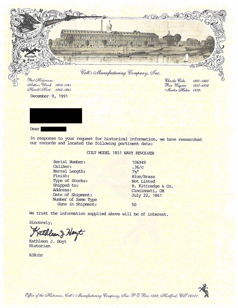 WAR REVOLVER. Cal. 44. S# 14085. Standard configuration, 6" barrel, blued finish, hinged frame, maker & patent marks on either side of frame. About 20,000 of these revolvers were issued by US cavalry during the Civil War & many saw service receiving good reviews by troops using them. This is a fine survivor, retaining much of its original finish with crisp inspection cartouches. UNATTACHED ACCESSORIES: 1990s auction receipt. CONDITION: fine overall, retaining about 50% blue finish, balance mottled gray/brown. Markings are crisp. Grips are well-fit w/ bright, crisp inspector cartouches, edge wear and denting in butt. Mechanically cocks, but cylinder does not rotate, bright shiny bore. (01-24157/JS). ANTIQUE. $2,000-3,000.