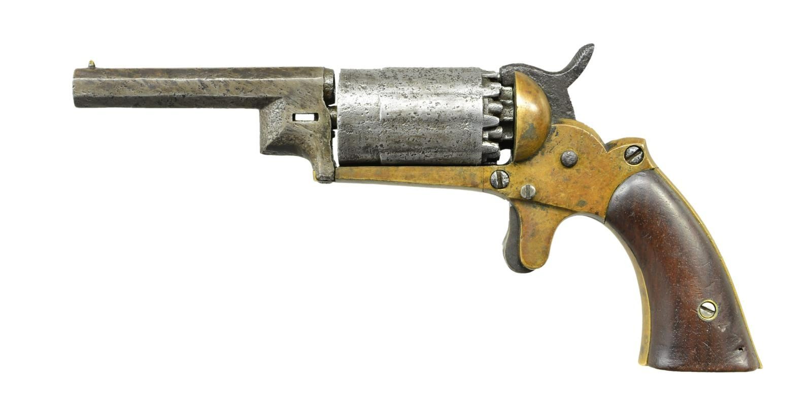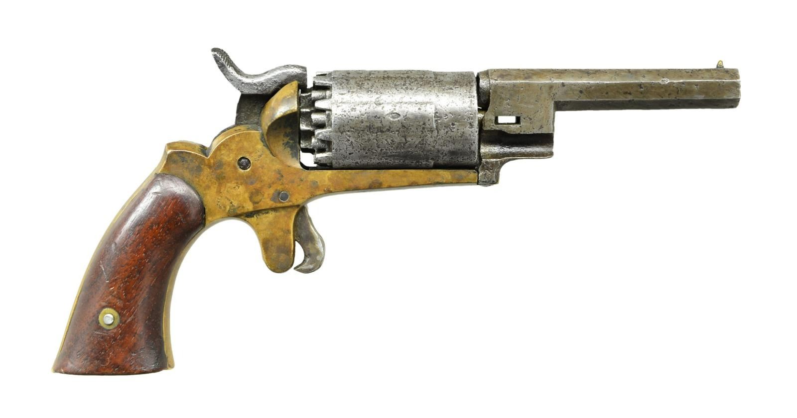 WALCH. Cal. 31. S# 496. Bbl. 3 1/4". Approx. 3,000 of the Walch 10 shot revolver were produced from 1860 to 1862. They were primarily purchased by many Civil War officers and enlisted men. Company I of the 9th Michigan were completely outfitted with the scarce revolver. The 10 shot cylinder had 5 chambers with each taking a double load. A total of 10 nipples were used to fire the gun. It is a brass frame example with 2 piece wood grips. CONDITION: this example has no visible markings on the top of the barrel. The gun has a cleaned finish that has toned back to medium gray on the iron and mustard on the brass. It is mechanically inoperable with missing parts and needs restoration. Bore is fair. (01-23911/BF). ANTIQUE. $600-900.