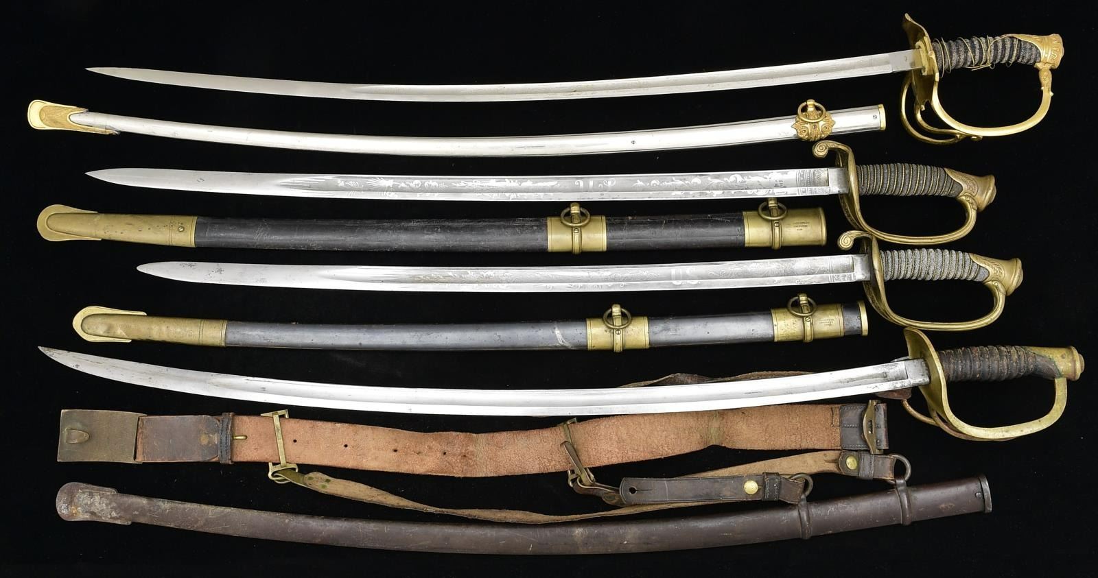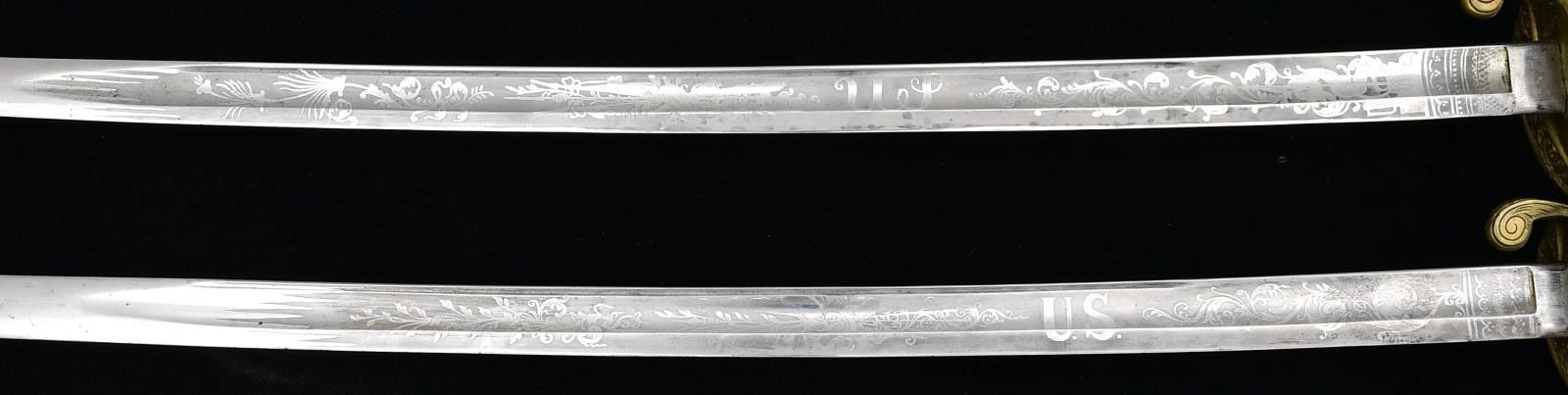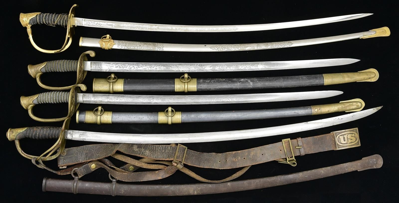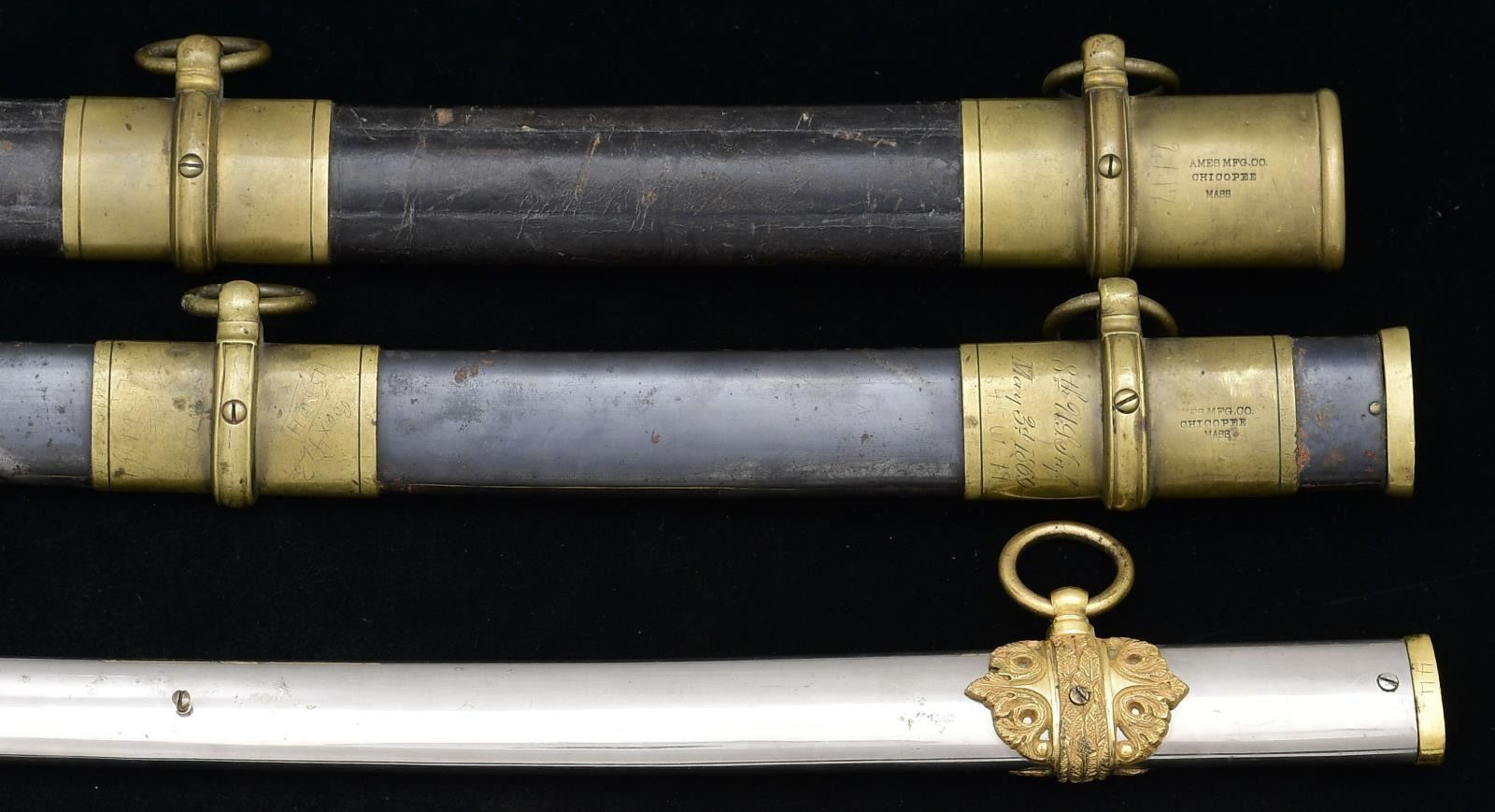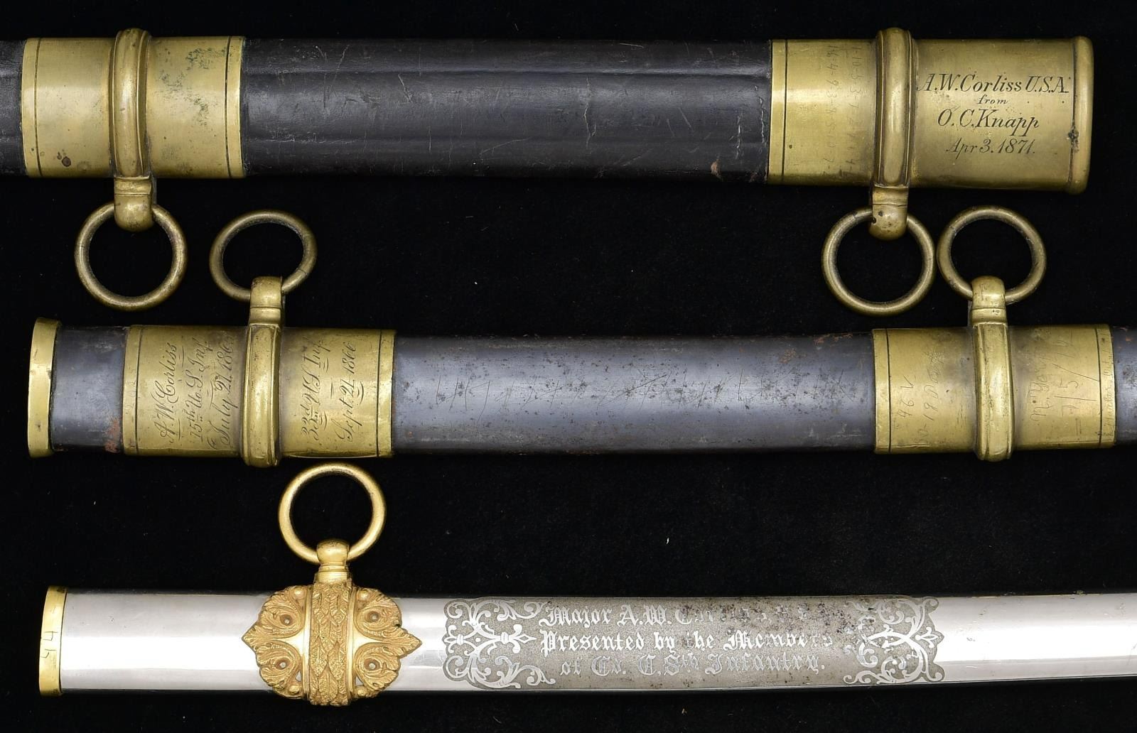 This is a most unusual grouping of a long time American military officer with service starting in the Civil War. Three swords are inscribed, two are Ames model 1850 foot officer swords. 1) Ames Civil War foot sword has brass mounted blued steel scabbard with three presentation panels and name finely engraved on pommel. "AW CORLISS / 15th US Inf / July 21, 1865", "33rd US Inf / Sept. 21, 1866", "8th US Inf / May 3, 1869". In addition to these finely engraved inscriptions are nicely scratched panels on other mounts including "New York Harbor / Oct 28, 1870", "Lookout Mountain, Tenn / Aug. 9, 1865", & "Yellowstone River, Montana T / Aug. 17 1872". 2) Ames Civil War 1850 foot officer's sword, standard configuration, shark skin wrap grip, 30.5" etched blade like other Ames here. Top mount is inscribed "A.W. CORLISS U.S.A. / from / O.C. Knapp [Adjutant] / April 3, 1871". The pommel cap face is finely engraved "A. W. C.". 3) fancy non-reg cavalry officer saber with name on etched blade and engraved scabbard "Major A. W. Corliss / presented by the members / of Co. C 8th Infantry". 4) the last sword is uninscribed 1865 dated Ames model 1860 US cavalry saber in 1906 scabbard still attached to sword belt with mismatched rectangular "US" sword belt plate and keeper, belt is marked "3 Cav". Augustus Whittemore Corliss (1837-1908) was an American soldier, author and historian. He published, amongst other works, Old Times in North Yarmouth, Maine across several volumes. He began writing it during his career in the military, which spanned forty years. A resident of Waltham, MA, he was appointed 2nd Lieutenant, First New England (later Rhode Island) Cavalry in December 1861 and was Adjutant. He was commissioned Major of Rhode Island Cavalry on June 24, 1862 and transferred to command the 7th Squadron. He led his squadron in the escape from Harpers Ferry and was engaged in battle of Antietam September 17, 1862. He mustered out on 2 October 1862 and was appointed Major of the 2nd Rhode Island Cavalry on December 24, 1862. He was promoted to Lieutenant Colonel on January 19, 1863, but resigned his commission on 11 July 1863. He enlisted March 15, 1865 in Company H, 2nd Battalion, 15th United States Infantry & was commissioned 2nd Lieutenant then 1st Lieutenant July 21, 1865. He transferred to the 33rd US Infantry on September 21, 1866 and was regimental Quartermaster from January 1867 to May 1869. He transferred to the 8th US Infantry on May 3, 1869 and was promoted to Captain on May 29, 1873. He was appointed Major of the 17th US Infantry on February 4, 1897, transferred to the 7th US Infantry 3 weeks later, and was promoted to Lieutenant Colonel of the 2nd US Infantry on February 6, 1899. He was made Colonel of the regiment February 2, 1901 and retired on March 25, 1901. He was promoted, on the retired list, to Brigadier General in 1904. He published his History of the Seventh Squadron, Rhode Island Cavalry in 1879. CONDITION: both Ames foot officer swords are very good to fine, blades retaining most of their frost and luster, traces of gold plate on hilts and scabbard mounts, both scabbard bodies are very good, grips both very good and complete. Presentation cavalry officer saber is very good retaining most of blade's polish and luster, scabbard is missing middle mount, most of the gold plate on hilt and mounts is present, sharkskin grip is sound and complete, gold plated brass wire wrap is sprung and broken. The Ames cavalry saber is very good, blade markings are all discernible, the Ames mark is weak, grip is missing wire wrap but most of the original leather is present though scuffed, dry, and soiled, mottled brass patina. Sword belt is sound with both patent hangers. (02-20892/JS). $2,000-4,000.