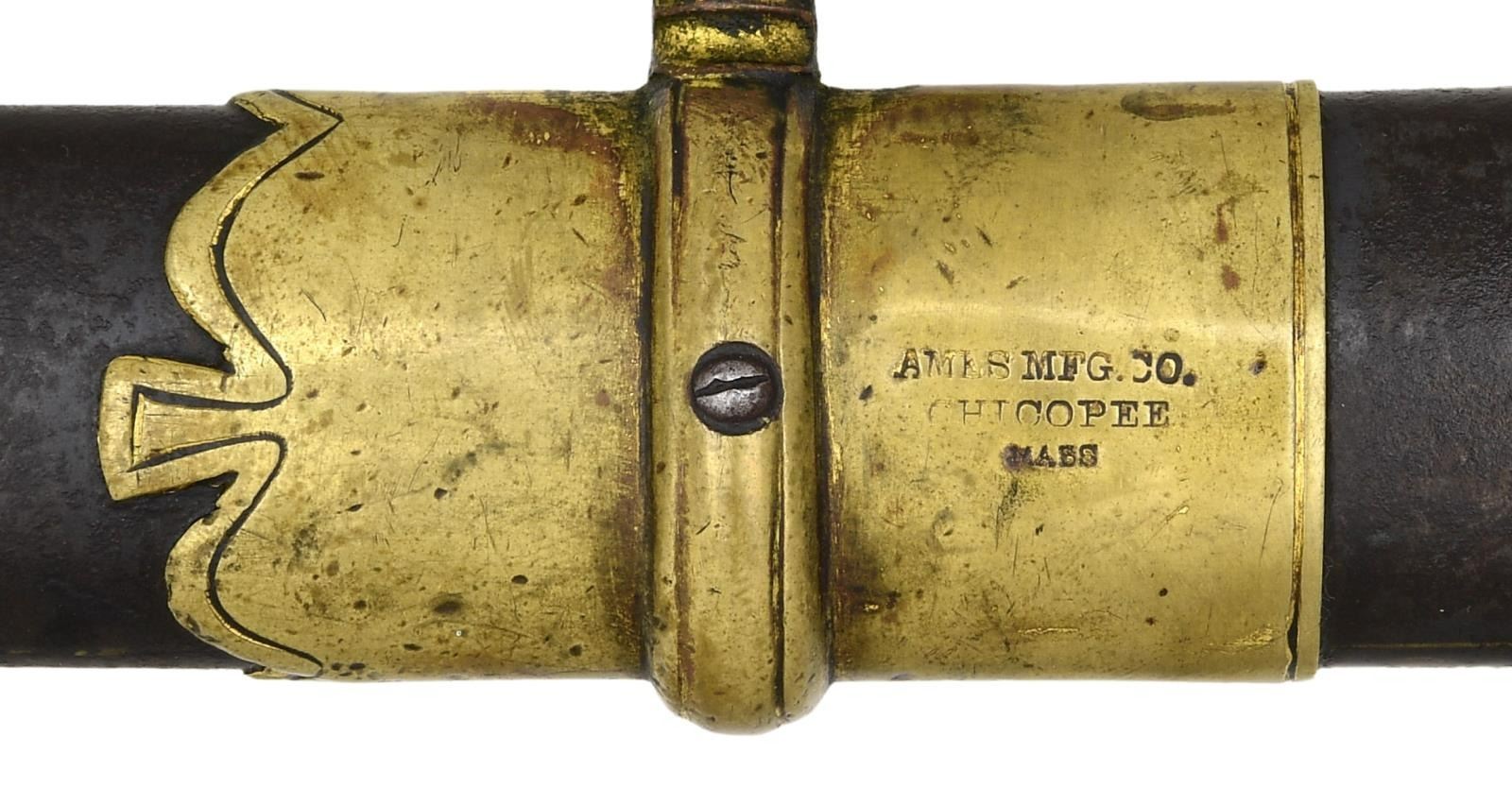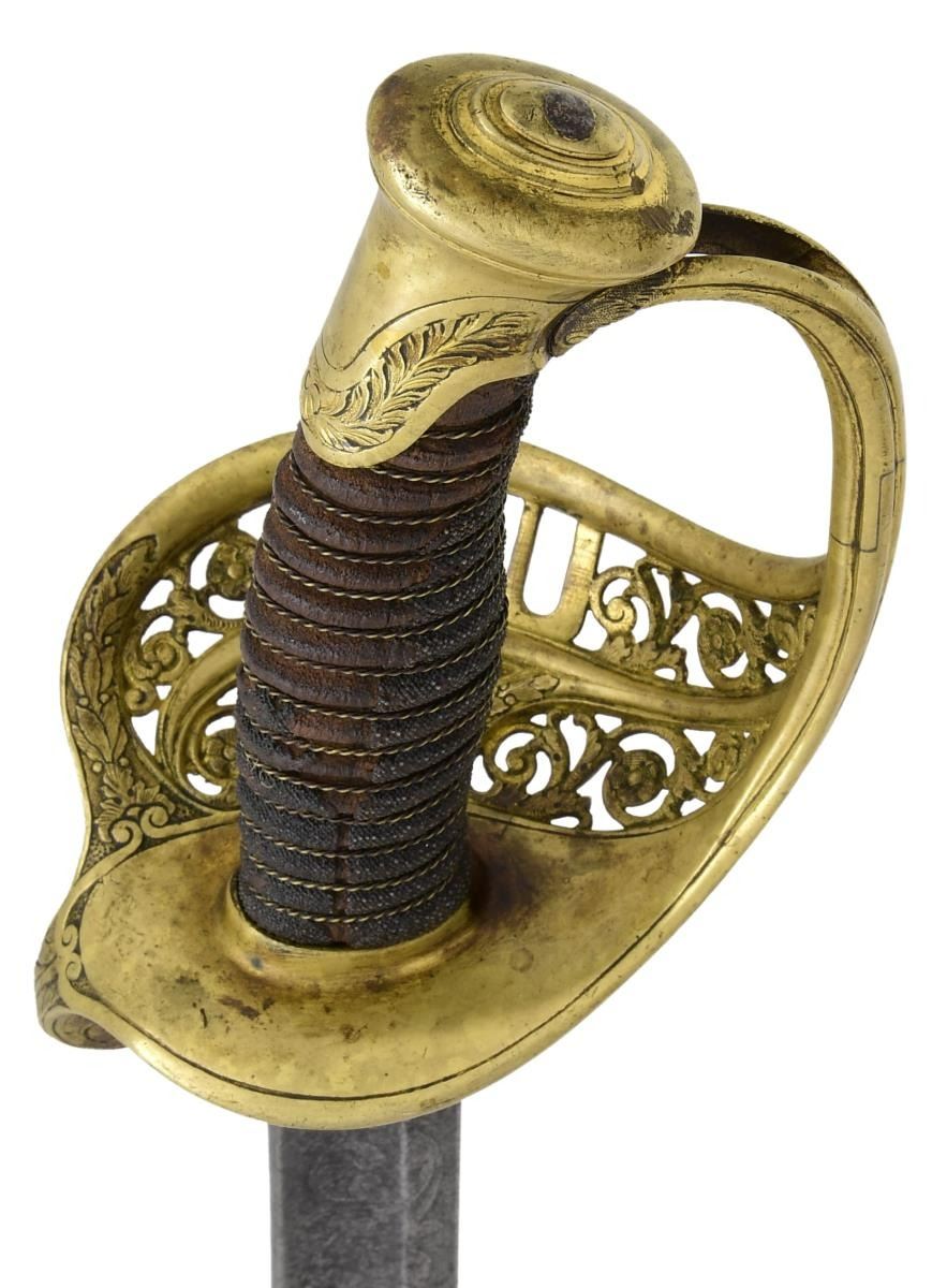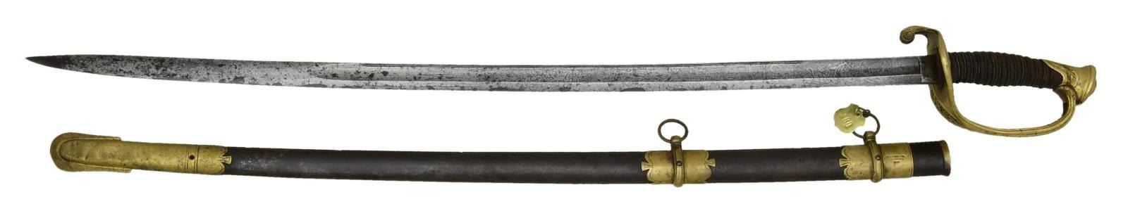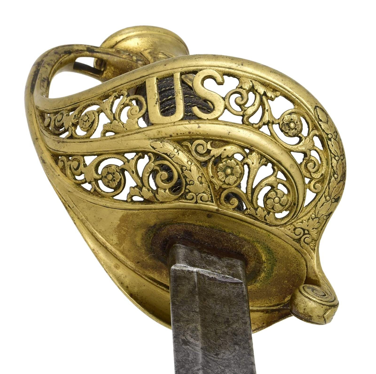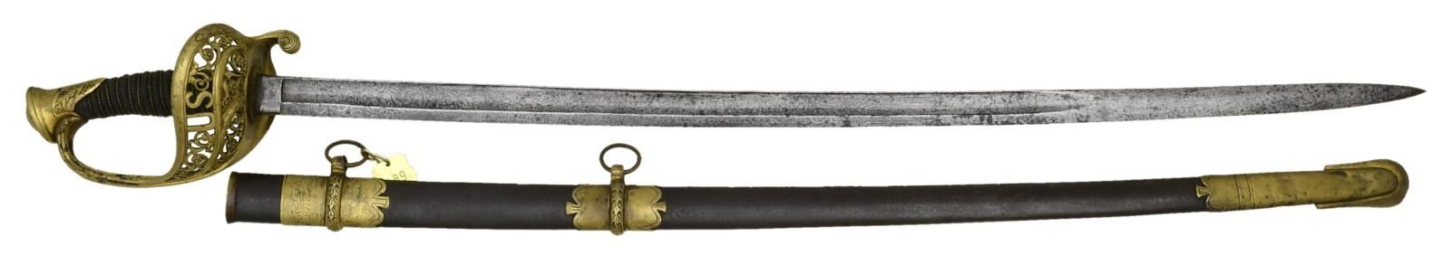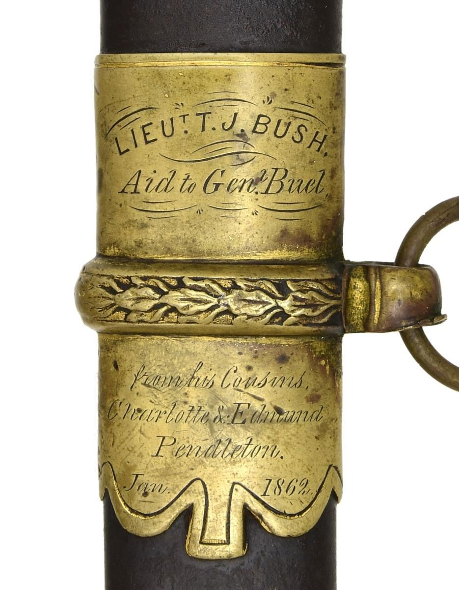 SWORD, LT THOMAS J. BUSH, 24TH KENTUCKY INFANTRY. Ames model 1850 staff and field officer sword, steel scabbard brass mounts, sharkskin grip, pierced floral decorated hilt with large "US". Scabbard mount inscribed: "LIEUT T. J. BUSH / Aid to Genl Buel[l] / from his cousins / Charlotte & Edmund / Pendleton / Jan. 1862". Thomas Bush (1840-1920) entered service with the 24th Kentucky in Louisville KY. He was Don Carlos Buell's Aide de Camp at Shiloh and Corinth, appointed captain September 2nd 1863, resigned commission late 1964. UNATTACHED ACCESSORIES: large file of research and records of Lt. Bush. CONDITION: very good overall, blade is gray with all patriotic etching discernable, breast helped and scabbard mounts have traces of gold wash in protected areas, sharkskin is 75% intact, twisted wire wrap just complete and tight. (02-20573/JS). $2,500-3,500.