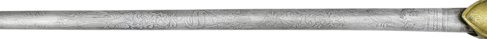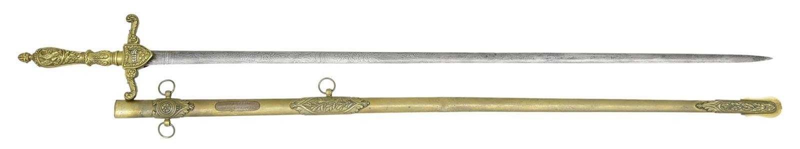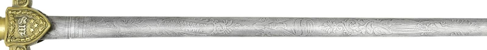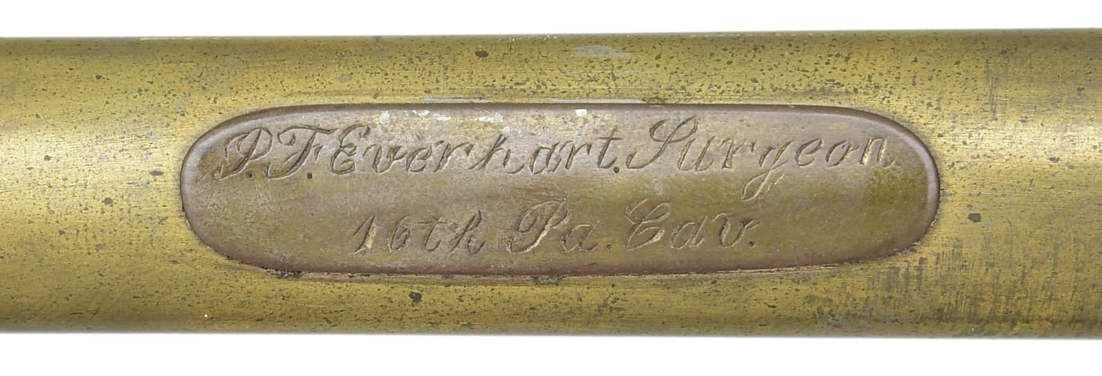 PERSONALIZED TO ISAAC F. EVERHART OF THE 16th PENNSYLVANIA CAVALRY. Overall length: 34 1/2". Blade length: 28 1/2". Blade is elliptical cross section and is etched over 13" of its length with various patriotic, military, & foliate motifs, including 2 large American eagles. There is a small panel 4" from the ricasso that reads "W.H. HORSTMANN & SONS PHILADELPHIA". Gilded brass hilt with curled acanthus leaf decorated crossguard & shield languets. One languet has the initials "MS" for Medical Service. The solid brass grip has a large eagle on each side with foliate decoration. There is a large "pineapple" shaped finial at the top. Gilded brass scabbard with foliate embellished mounts. There is a 2" plaque that is engraved "I.F. Everhart. Surgeon 16th Pa. Cav.". Isaac Everhart joined the 16th Pennsylvania Cavalry as a surgeon on June 12, 1863 and served until August 11th of 1865. The 16th Pennsylvania Cavalry was involved in several major engagements, including the Battle of Gettysburg, the Battle of Cold Harbor, Siege of Petersburg, Battle of Five Forks, and was present at Appomattox Courthouse. CONDITION: blade has a light gray patina and the etching remains quite vivid. Hilt retains traces of original gilding and is quite solid. Scabbard also retains traces of original gilding with a couple of tiny shallow dents. (02-20984/BF). $2,500-3,500.