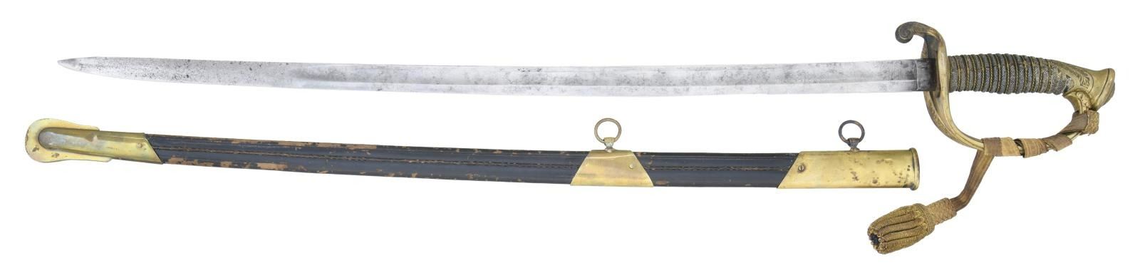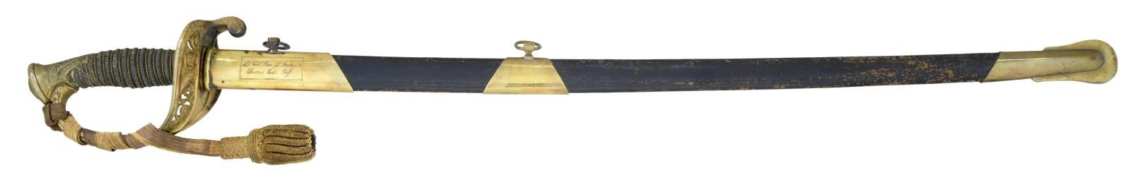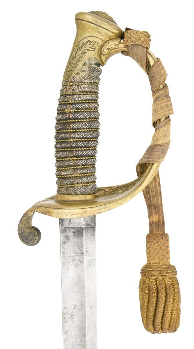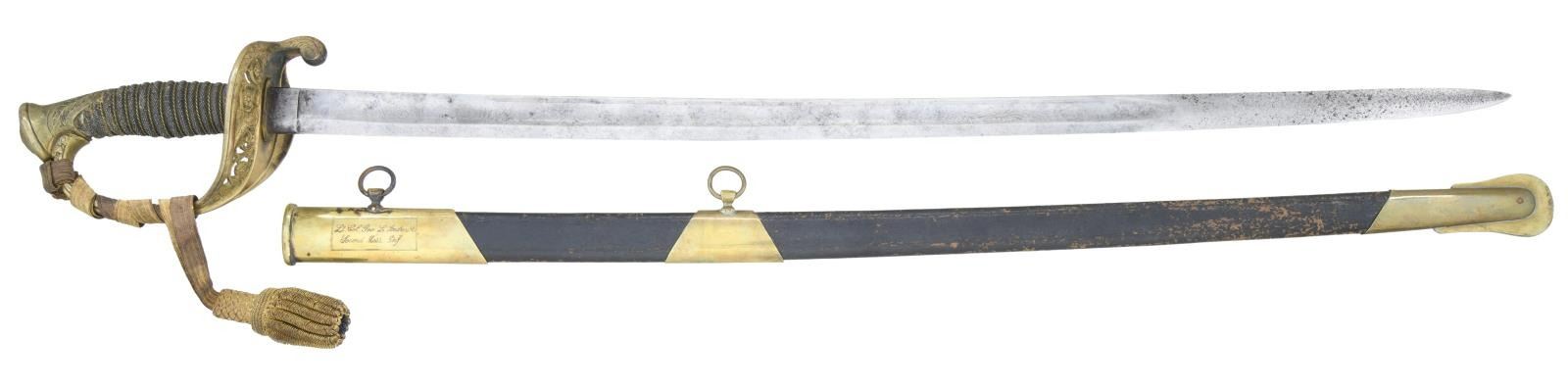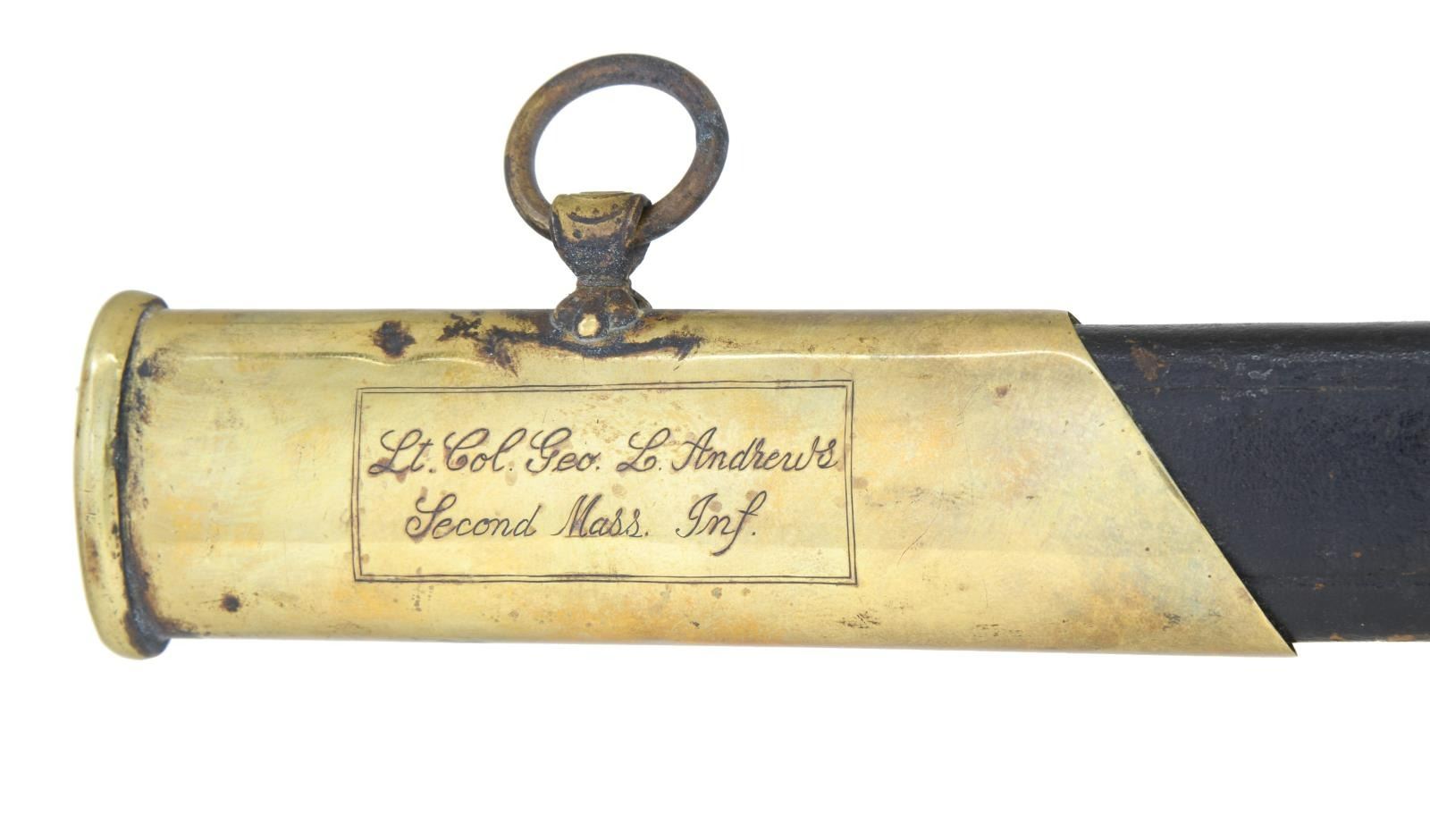 COL. GEORGE ANDREWS, 2nd MASS INF". Standard configuration model 1850 foot officer sword, unusual slanted scabbard mounts, with throat inscribed "Lt. Col. Geo L. Andrews / Second Mass Inf." George L. Andrews (1828-1899) USMA graduate, later brigadier general, was appointed lt. colonel 2nd Mass in 1861, later colonel and led 2nd Mass at Antietam & Cedar Mountain, his later commands were in Dept. of Gulf under Maj. General Nathaniel Banks in Louisiana. CONDITION: Very good overall, blade is gray with discernible light etched patriotic panels, complete shark skin and twisted wire wrapped grip. Bullion sword knot is very good. (02-19278/JS). $1,500-2,500.