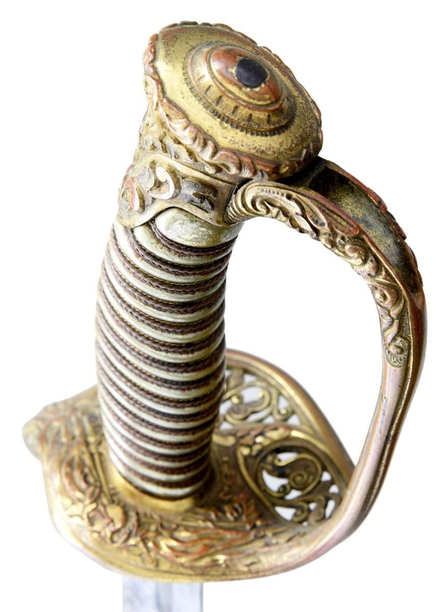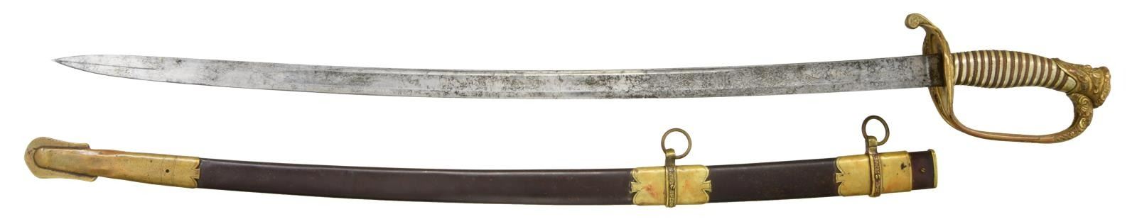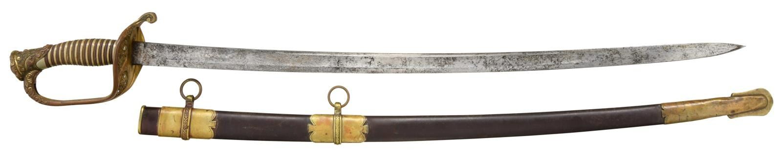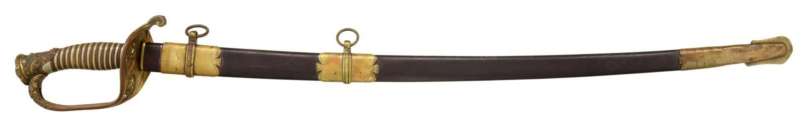 HORSTMANN. Overall length: 39 1/4". Blade length: 32 1/4". Blade has a single wide fuller with a single narrow fuller near the spine. Blade is etched over 1/3 of its length with geometric motifs and a large American eagle surrounded by a starburst on one side, and a large "U.S." on the other side. The blade is etched near the ricasso, "W.H. HORSTMANN & SONS PHILADELPHIA" & "IRON PROOF". Gilded brass hilt with pierced guard showing foliate decoration and an embellished downturned quillon. Knuckle bow is highly decorated near the pommel. The pommel is in extremely high relief, showing foliate & geometric decoration. Wire-wrapped silver grip. Gilded brass mounted iron scabbard with a plum brown body. CONDITION: blade has a medium gray mottled patina with scattered staining. The hilt is quite tight and retains a significant amount of original gilded finish. The visually attractive silver grip is undamaged and boasts complete wiring. The scabbard has traces of original gilded finish on the mounts, and the plum brown finish is nearly completely intact. There are a few tiny shallow dents to the scabbard body. (02-19249/BF). $1,200-1,500.