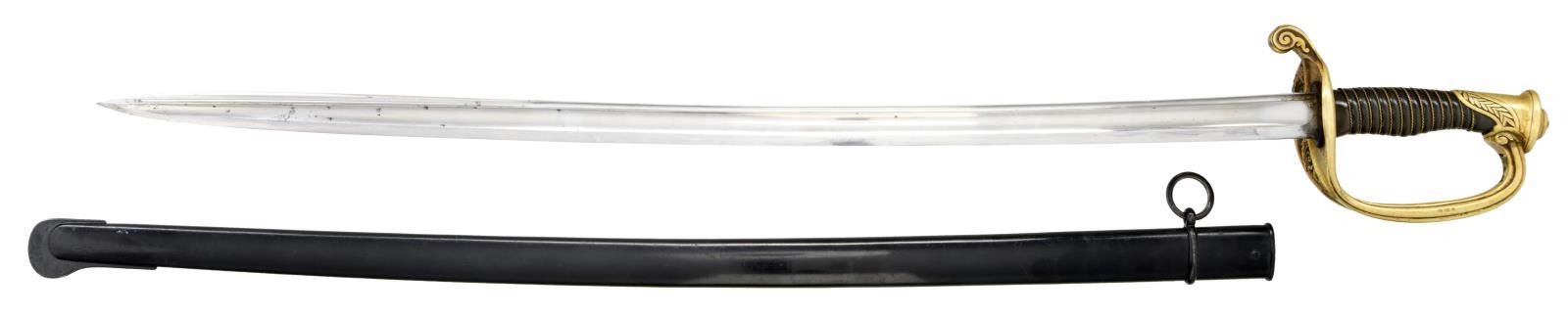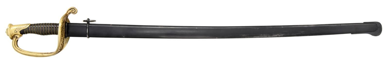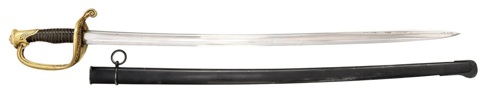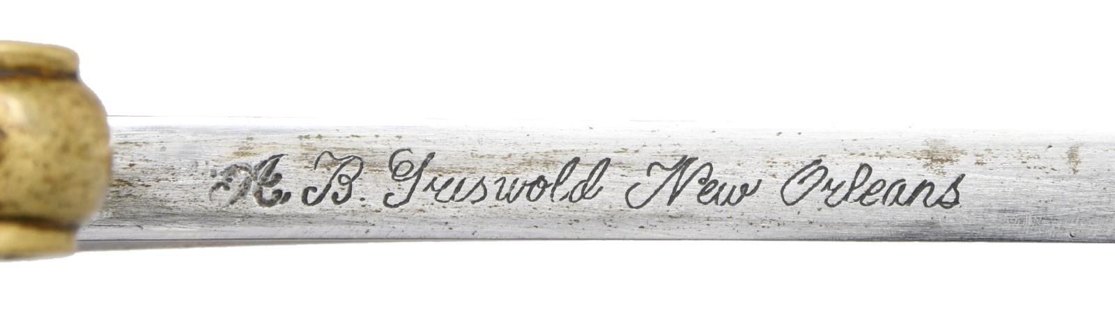 Overall length: 37". Blade length: 30 1/2". This interesting sword appears to be of French manufacture and was subsequently imported to the United States. The plain blade has a single wide fuller and a secondary fuller near the spine. The spine is stamped, "A.B. Griswold New Orleans." Heavy gilded brass hilt with pierced floral & foliate decorated guard. The relatively plain knuckle bow has 3 touch marks that read, "L", "B" & "S". Pommel also has floral & foliate embellishments. Wire-wrapped horn grip. Black enameled iron scabbard. A.B. Griswold commenced business operations in 1865 as successors to the firm Hyde & Goodrich. This sword likely dates to the post-reconstruction era when the south was initially allowed to rearm. CONDITION: the blade has a light gray finish with evidence of sharpening & subsequent buffing. The hilt shows traces of original gilding, and the grip shows light wear. The scabbard retains nearly all of its black painted finish. (02-19745/BF). $1,000-1,500.