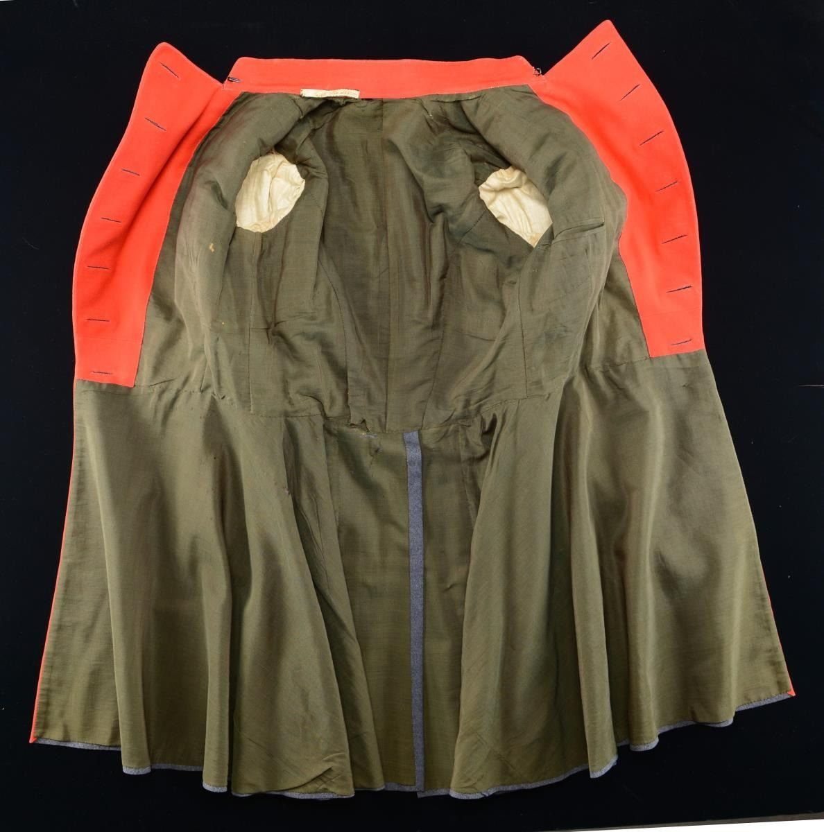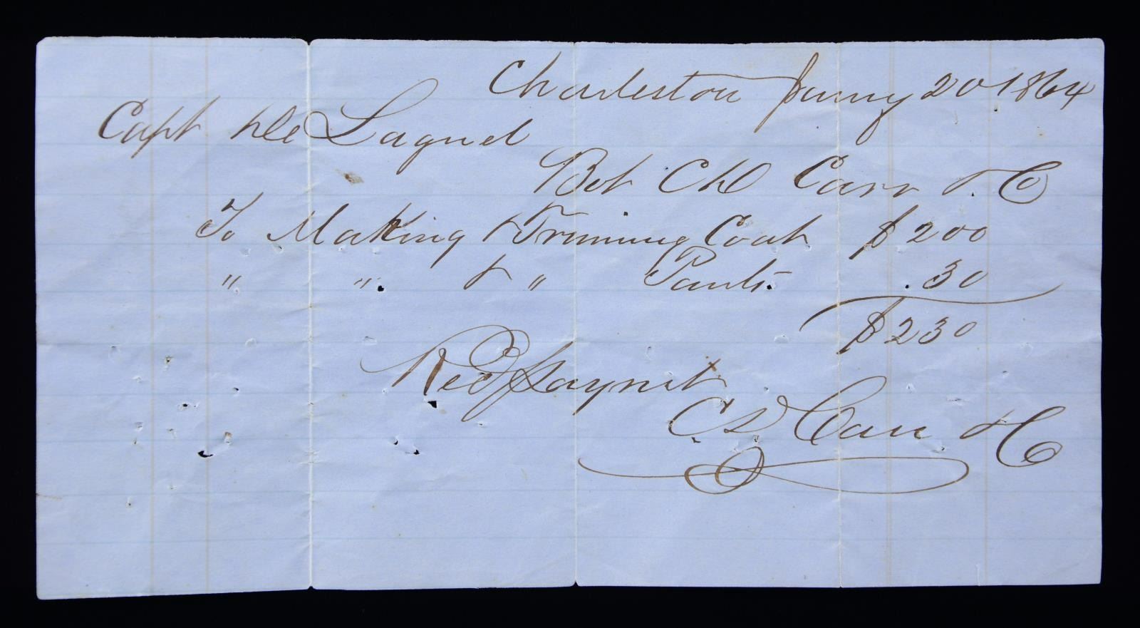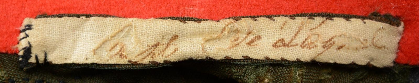 JOHNSTON DE LAGNEL, PACS & ACTING MAJOR OF 20TH BATTALION VIRGINIA HEAVY ARTILLERY TO OUR KNOWLEDGE THE FINEST OF ITS TYPE IN EXISTENCE. You will not find a finer regulation Confederate Captain's frock coat and matching trousers, both with Captain De Lagnel's name nicely inked. Most amazing is that the original receipt for the uniform from the premier wartime Charleston tailor Charles. D Carr was found in the pants pocket. Carr is known for high quality imported fabric and best quality imported Confederate buttons which he constantly advertised during war. De Lagnel paid $230 January 20th 1864 for coat & pants detailed on receipt. Apparently, he kept the receipt as on the verso, he lists ordnance for his command: "50 10in mortar shells, box 100 fuses, 100 pounds gunpowder, etc.". Johnston would die within 3 months of his last uniform being made April 7, 1864. Other de Lagnel Confederate artifacts were donated by his family to the Museum of the Confederacy including his brother Julius' sword. Johnston's uniform was donated to the Valentine Museum in Richmond in 1945 along with other uniforms of de Lagnel's father. While on display 16 of the rare blockade run English Confederate staff buttons were stolen, only 6 buttons are original to coat. We were able to find original period replacements to replace the missing Civil War ones, which now have been professionally reattached. The buttons have all been restored with identical manufacturer and type (Albert #36). It was not easy finding 16 perfect HT&B Confederate staff officer buttons, but Robert French, specialist rare button dealer and Poulin specialist gleaned the country and eventually found them all; dealers are asking as much as $1000 each for them. It was worth the effort as the final product is really breathtaking as you can see in photos. There are very few identified Confederate coats & matching trousers in high condition extant including museum & institutional collections. But this is believed to be the finest known, it is virtually breathtaking. Johnston de Lagnel (1831-1864) was commissioned in his older brother's unit 20th Battalion Virginia Heavy Artillery also known as "de Lagnel Artillery" July 1862. Major Julius de Lagnel II commanded the 20th VA HA protecting the approaches to Richmond with batteries along the James River. When Julius was promoted to Colonel, he left the 20th VA Heavy Artillery command to his brother Johnston, a captain but acting major. Johnston was acting major for several months, and when his promotion to major was disapproved, he was transferred to the Charleston defenses under General Beauregard, October 23, 1863. Johnston was in command of Fort Johnson on James Island till his death April 7th 1864; according to his National Archives compiled service record he was on duty signing reports a week before he died in the field at Fort Johnson. His body was sent by steamer back home to Virginia where he is interred along with his father, West Point Graduate Julius A. de Lagnel (1798-1840) and long career in US Artillery & Ordnance. Both his sons followed in his footsteps both being Confederate Artillery & Ordnance officers. Captain Johnson was a member of the Provisional Army of Confederate States or PACS. He was not a member of the standard state troop which consisted of the majority of the Confederate Army. The Confederate government actually paid for his expensive uniform. UNATTACHED ACCESSORIES: invoice from textile restorer Henry Cooke of Historical Costume Services with details of the minor restoration and reattaching missing buttons. Large file of research on Capt. De Lagnel and provenance. 164 page National Archives Confederate service file on Johnston. Transcriptions of correspondence from the 1945 donation to the Valentine museum of this uniform. CONDITION: fine overall, bright red trim matches on coat & pants, grey wool broadcloth is excellent with only 2 tiny holes, buttons retain virtually all their gold wash, quatrefoil and collar insignia are fine. Frock coat lining is excellent, pants lining has fraying and tearing that has been stabilized. Ink inscriptions on pants pocket and collar tab of frock are easily read. PROVENANCE: Capt. Johnston de Lagnel 1864 Donated to Valentine Museum, Richmond 1945 Deaccessioned by the Valentine Museum to benefit collections care, preservation and future acquisitions. (02-21025/JS). $60,000-70,000.