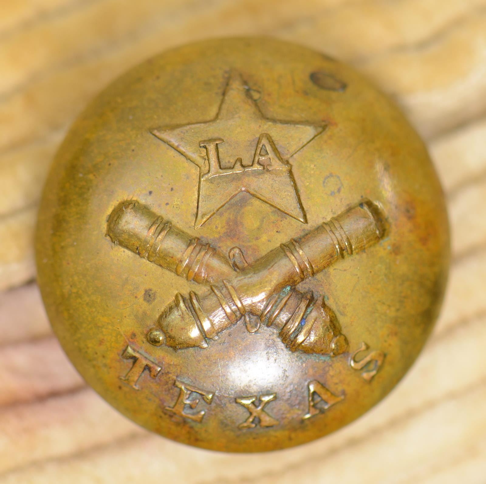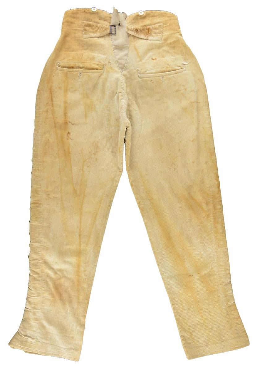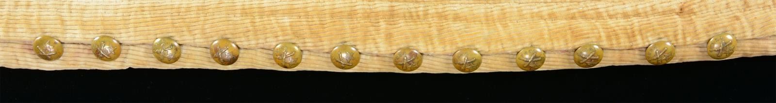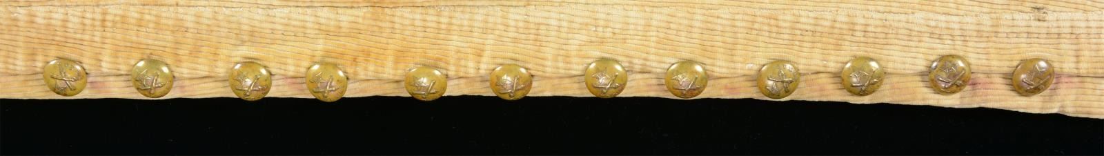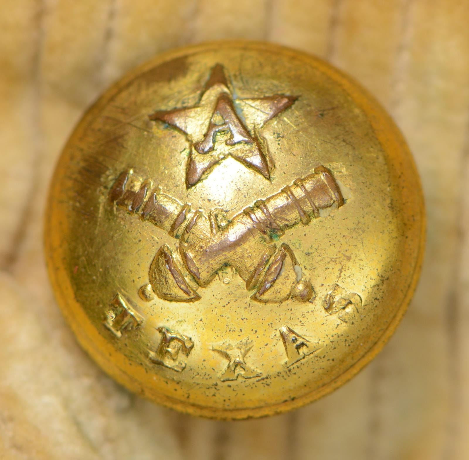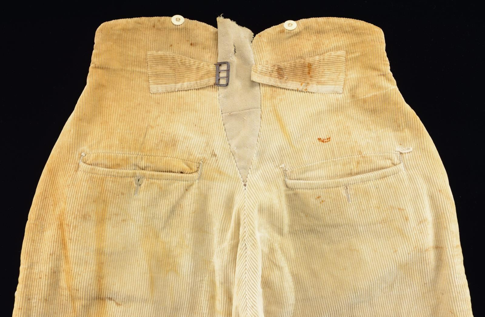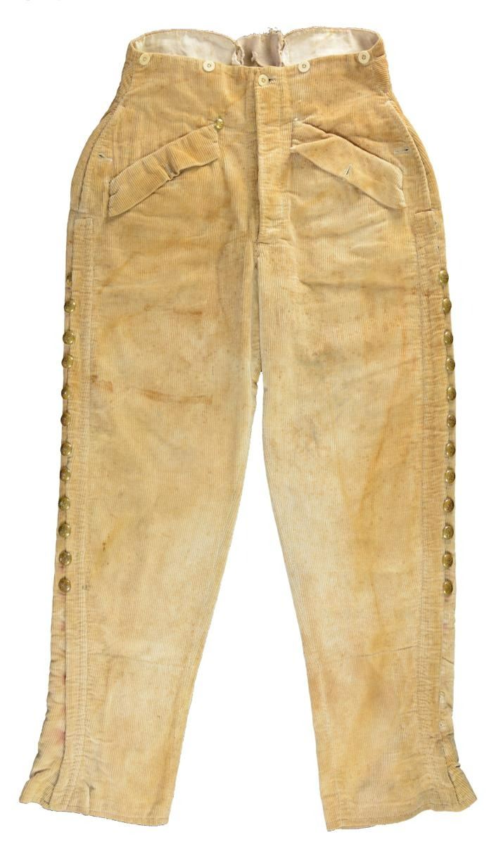 PANTS WITH 25 REPUBLIC OF TEXAS BUTTONS ATTACHED. This pair of Republic of Texas pants could arguably be the finest and rarest uniform pants, with an American history, known to exist today. According to a textile museum in Washington, DC, the cloth is a silk corduroy likely manufactured in the late 1820's or early 1830's by one of two textile mills in New England. The most important defining feature of the pants is the 24 Republic of Texas coat-size Light Artillery buttons that are sewn approximately every 2" down the outside seams of the pants. Originally, there were 20 buttons down each seam; however, 8 buttons have been removed from each side at some point during the long history of the pants. The buttons are commonly referred to as TX-11-A and can be found in the "Record of American Uniform And Historical Buttons" by Alphaeus Albert. The backmark on the 19mm buttons reads "SCOVILLS . WATERBURY . ". There are 2 slash pockets with flaps on the front of the pants that likely originally had one Republic of Texas Artillery cuff-sized button at each corner. Only one of these buttons remains and it is referred to as TX-8-Av, and the backmark is RMDC "SCOVILLS . EXTRA .". The buttons at the waist and the fly are 4-hole, sew-through bone buttons. Although missing, the buttons that closed the side pockets, front pockets, and rear pockets were likely also 4-hole, sew-through bone buttons. The waist of the pants is approximately 31". The length from waist to cuff is about 42", and the inseam is approximately 31". There is an interesting flap of corduroy cloth added in the front of each row of buttons, likely to protect the buttons from being snagged while riding or marching. There is a cinching strap at the back of the waist with a 2-prong iron buckle. The pants are entirely lined in a cotton/muslin-like material. There is a 2 1/2" x 8" piece of coarse cloth, likely made of a linsey-woolsey material, that expands the waist in the rear of the pants. The pocket bags are created from the same material that lines the pants. It is quite extraordinary indeed that these silk corduroy pants survive, and even more extraordinary that they survive with 25 Republic of Texas buttons, dating from 1836 to 1846, intact. CONDITION: the pants are remarkably solid and stable. The corduroy material is soft and pliable, as is the cotton lining. The staining and soil on the pants should be considered minimal for their age. None of the buttons appear to be damaged in any way, and all have a pleasing patina. The linsey-woolsey extension at the waist appears to have been accomplished by a skilled seamstress and could easily be reversed, if that were deemed necessary. (02-20192/BF). $35,000-45,000.