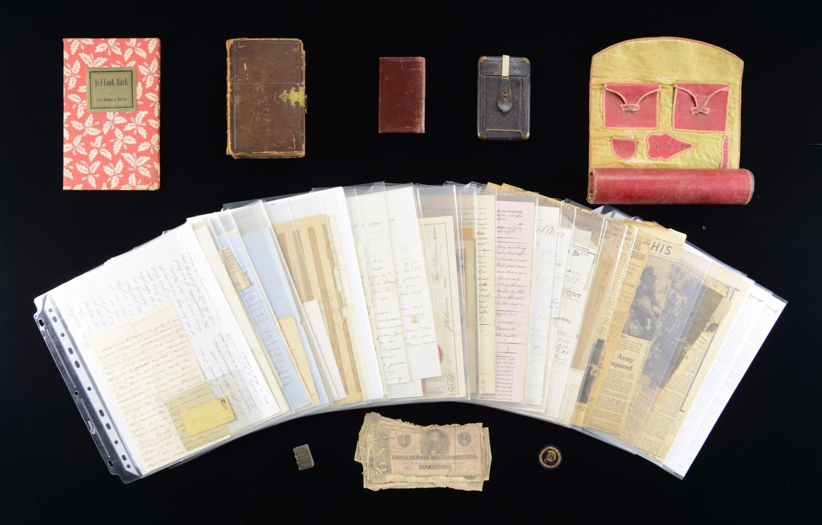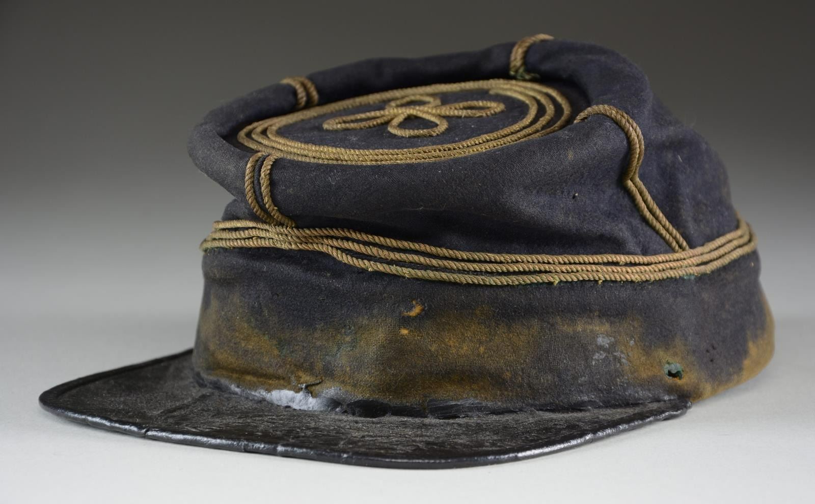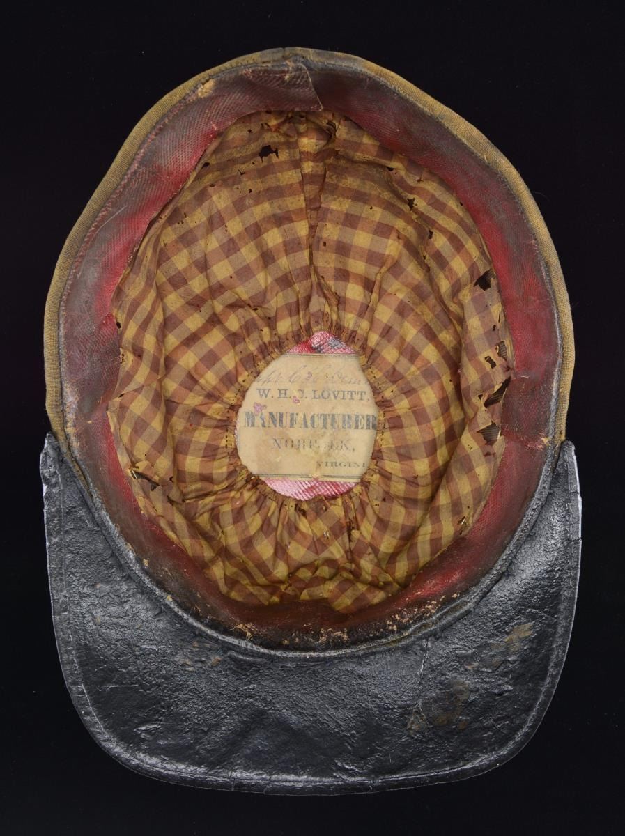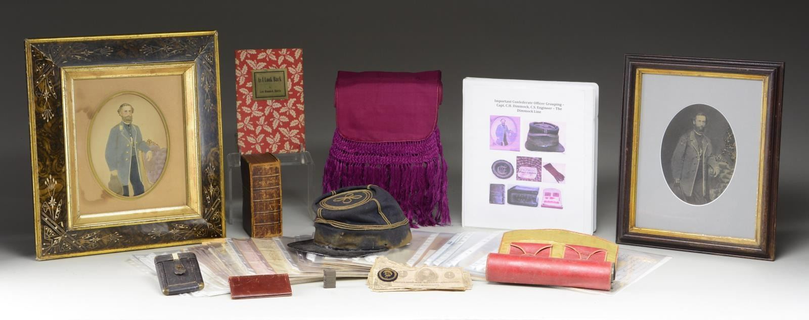 BELONGING TO CAPTAIN CHARLES H. DIMMOCK INCLUDING HIS CONFEDERATE ENGINEER'S KEPI. This extensive group belonged to Captain Charles H. Dimmock of the Confederate States Engineer Corps. Dimmock is most famous for designing and implementing the construction of the famed "Dimmock Line", a long and robust series entrenchments and fortifications that encircled the city of Petersburg, Virginia. Petersburg was a vitally important rail hub for the Confederacy, and a focal point for the transport of desperately needed military supplies for the Confederacy. Dimmock's diligent work was so appreciated by the citizens of Petersburg that, in 1864, they presented him with a horse accompanied by finely appointed, custom-made English horse tack and a saddle valise. Dimmock's work was praised by innumerable Confederate Officers, including General William Mahone, famous for retaking the crater after the federal mine explosion on July 30, 1864. Dimmock was instrumental in maintaining the forts and earth works around Petersburg during the 9-month siege. When the city fell, Dimmock retreated with General Lee's Army and was ultimately paroled at Appomattox on April 10, 1865. Of the many items included in this lot, the most important is Captain Dimmock's Officer's kepi. The kepi is constructed of extremely fine black wool, likely of British manufacture. It measures approximately 3 1/2" in the front, including the roll, and 6 1/4" in the rear, also including the roll. There are 3 rows of rope-like gold bullion encircling the hat with 2 rows of the same bullion rising at the front, back, and both sides. The crown also has 3 rows of the rope-like gold bullion encircling the top around a central quatrefoil. There is a gold bullion "E" for Engineer round hat insignia that is now detached from the hat, but present, and its ghost may be seen on the front of the hat. This insignia is a great rarity in itself and few, if any, are known to survive. There is no chinstrap or side buttons present. The tarred visor has a bound edge and is sewn to the body of the kepi. The sweatband is fine, red Moroccan leather. The lining of the broadcloth appears to be black polished cotton, and the kepi liner appears to be red and white cotton gingham. The crown has a red stiffener with a paper label attached that reads "W. H. C. LOVITT MANUFACTURER, NORFOLK, VIRGINIA." Lovitt had a wartime contract with the state of North Carolina to make hats for their troops. The name "C.H. Dimmock" is penned at the top of the label. Also included in this lot are several other items belonging to Captain Dimmock. They include: 1) A wide, maroon silk Officer's sash measuring approximately 100", including the fringe. 2) A housewife in red Moroccan leather with green silk and red leather interior. The housewife contains a few needles and a pin cushion. 3) A small grooming kit in a leather holder containing scissors, a combination toothpick/ear scoop, a combination tweezers/ear scoop, and a nail file with cuticle point. The interior of the flap contains a small mirror. 4) A framed albumen image of Captain Dimmock in his Confederate uniform holding a slouch hat, professionally colored by an accomplished artist. The frame measures 13 3/4" x 15 3/4", and the exposed oval image measures 5 1/2" x 7 1/2". The back of the image has a Petersburg label from 1863 with the name "Captain Dimmock" from J.R. Rockwell Petersburg, Va. Dimmock mentions the image in a wartime letter to his wife, and notes that his draughtsman tinted the image. 5) An uncolored albumen image of the same pose as above. 6) A wonderful miniature book fashioned from clay taken from the Crater that reads on the spine "GRANT ON MINES. SIC SEMPER TYRANNIS VOL. 1." On the covers it reads "PETERSBURG JULY 30th 1864" & "EXPLOSIONS PRACTICALLY TREATED BY U.S. GRANT". On the page edges it reads "MARY M.L. DIMMOCK. CRATER CLAY". 7) 6 Confederate $1 bills that have been very heavily circulated. 8) A small book titled "AS I LOOK BACK" by Lew Dimmock Harris. 9) A Dimmock family bible. 10) A small red leather and red silk wallet. 11) An oval photograph, presumed to be Mrs. Dimmock. 12) An appointment certificate naming Dimmock Captain of Engineers. Appointment is signed by Confederate Cabinet officer Judah Benjamin. 13) An official Confederate States Engineer Bureau envelope with stamp addressed to Captain Dimmock. 14) A blank Oath of Allegiance to the Confederate States of America. 15) A handwritten official report from Major General William Mahone with envelope postmarked "Richmond". 16) Several letters, both private and professional, from Dimmock and to Dimmock, discussing war matters. 17) A variety of handwritten poems by Dimmock. 18) A complete map of Hollywood Cemetery. 19) A hand composed musical work by Dimmock. 20) A pamphlet titled "THE MODERN A FRAGMENT." By Charles H. Dimmock published in Richmond in 1866. 21)A stock certificate to the Literary and Social Society of Richmond for 5 shares at $25 per share. 22) A CDV of Robert E. Lee by Jones and Vanerson of Richmond. 23) A printed CDV of Jeb Stewart with no back mark. 24) 3 Post-war CDVs of Charles Dimmock with Richmond and Baltimore back marks. 25) 3 CDVs depicting Dimmock's wife and children. 26) A $1,120 promissory note from Dimmock dated 1866. 27) 2 Deeds from Charles Dimmock for Richmond property. 28) A receipt for purchases by Captain Charles Dimmock. 29) A receipt for a stove, along with several other receipts from the Richmond area. 30) British saddle valise given to Capt. Dimmock by the grateful citizens of Petersburg, VA. 31) A variety of other papers relating to Captain Charles Dimmock and the Dimmock family, along with related newspaper clippings. UNATTACHED ACCESSORIES: a looseleaf binder with photocopied information on Captain Charles Dimmock, his family, and his service to the Confederacy. CONDITION: the kepi is soiled but remains quite solid. There is minor moth damage scattered throughout. The bullion trim is complete and undamaged.