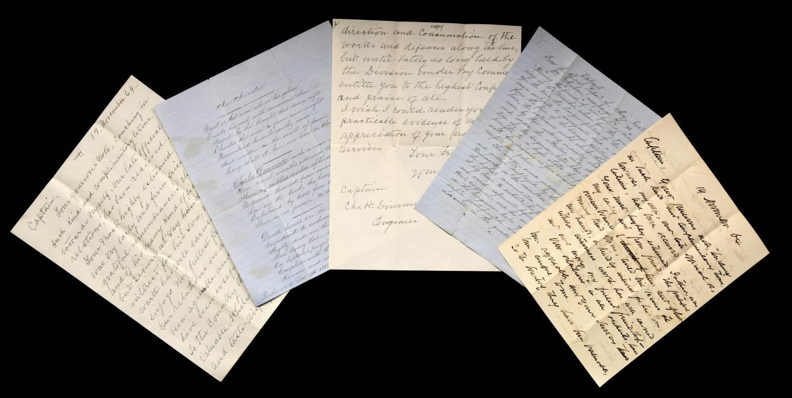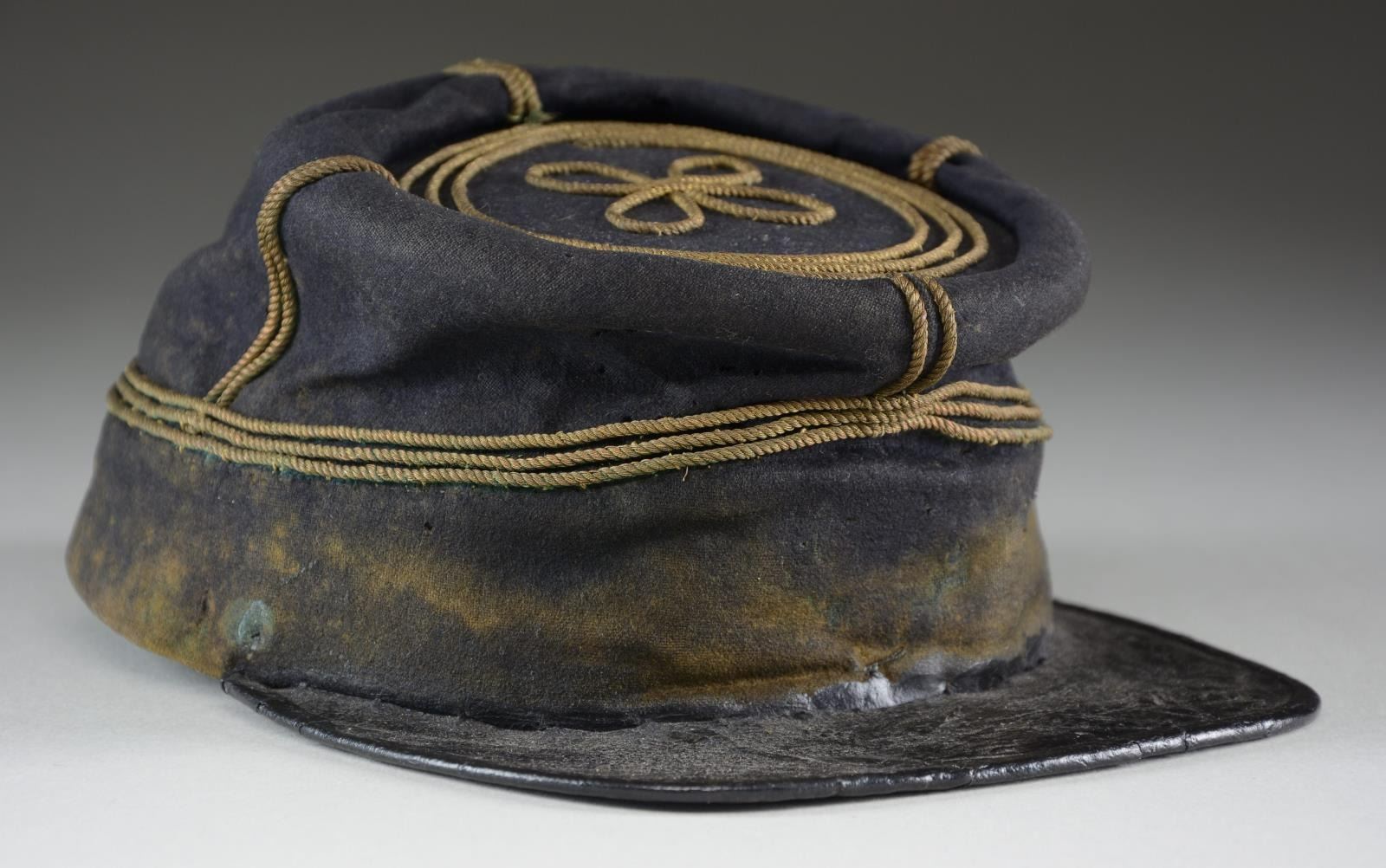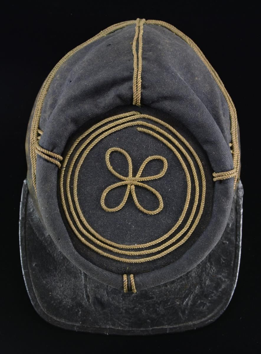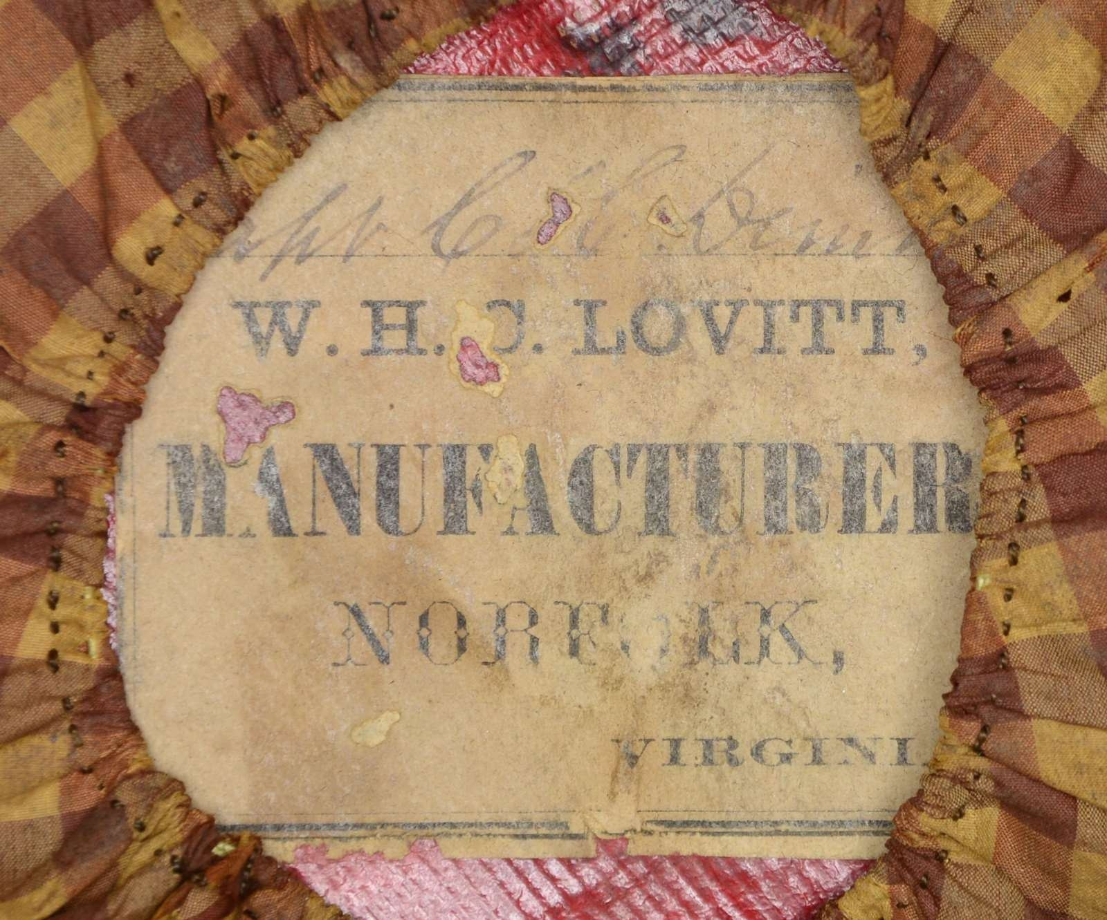 BELONGING TO CAPTAIN CHARLES H. DIMMOCK INCLUDING HIS CONFEDERATE ENGINEER'S KEPI. This extensive group belonged to Captain Charles H. Dimmock of the Confederate States Engineer Corps. Dimmock is most famous for designing and implementing the construction of the famed "Dimmock Line", a long and robust series entrenchments and fortifications that encircled the city of Petersburg, Virginia. Petersburg was a vitally important rail hub for the Confederacy, and a focal point for the transport of desperately needed military supplies for the Confederacy. Dimmock's diligent work was so appreciated by the citizens of Petersburg that, in 1864, they presented him with a horse accompanied by finely appointed, custom-made English horse tack and a saddle valise. Dimmock's work was praised by innumerable Confederate Officers, including General William Mahone, famous for retaking the crater after the federal mine explosion on July 30, 1864. Dimmock was instrumental in maintaining the forts and earth works around Petersburg during the 9-month siege. When the city fell, Dimmock retreated with General Lee's Army and was ultimately paroled at Appomattox on April 10, 1865. Of the many items included in this lot, the most important is Captain Dimmock's Officer's kepi. The kepi is constructed of extremely fine black wool, likely of British manufacture. It measures approximately 3 1/2" in the front, including the roll, and 6 1/4" in the rear, also including the roll. There are 3 rows of rope-like gold bullion encircling the hat with 2 rows of the same bullion rising at the front, back, and both sides. The crown also has 3 rows of the rope-like gold bullion encircling the top around a central quatrefoil. There is a gold bullion "E" for Engineer round hat insignia that is now detached from the hat, but present, and its ghost may be seen on the front of the hat. This insignia is a great rarity in itself and few, if any, are known to survive. There is no chinstrap or side buttons present. The tarred visor has a bound edge and is sewn to the body of the kepi. The sweatband is fine, red Moroccan leather. The lining of the broadcloth appears to be black polished cotton, and the kepi liner appears to be red and white cotton gingham. The crown has a red stiffener with a paper label attached that reads "W. H. C. LOVITT MANUFACTURER, NORFOLK, VIRGINIA." Lovitt had a wartime contract with the state of North Carolina to make hats for their troops. The name "C.H. Dimmock" is penned at the top of the label. Also included in this lot are several other items belonging to Captain Dimmock. They include: 1) A wide, maroon silk Officer's sash measuring approximately 100", including the fringe. 2) A housewife in red Moroccan leather with green silk and red leather interior. The housewife contains a few needles and a pin cushion. 3) A small grooming kit in a leather holder containing scissors, a combination toothpick/ear scoop, a combination tweezers/ear scoop, and a nail file with cuticle point. The interior of the flap contains a small mirror. 4) A framed albumen image of Captain Dimmock in his Confederate uniform holding a slouch hat, professionally colored by an accomplished artist. The frame measures 13 3/4" x 15 3/4", and the exposed oval image measures 5 1/2" x 7 1/2". The back of the image has a Petersburg label from 1863 with the name "Captain Dimmock" from J.R. Rockwell Petersburg, Va. Dimmock mentions the image in a wartime letter to his wife, and notes that his draughtsman tinted the image. 5) An uncolored albumen image of the same pose as above. 6) A wonderful miniature book fashioned from clay taken from the Crater that reads on the spine "GRANT ON MINES. SIC SEMPER TYRANNIS VOL. 1." On the covers it reads "PETERSBURG JULY 30th 1864" & "EXPLOSIONS PRACTICALLY TREATED BY U.S. GRANT". On the page edges it reads "MARY M.L. DIMMOCK. CRATER CLAY". 7) 6 Confederate $1 bills that have been very heavily circulated. 8) A small book titled "AS I LOOK BACK" by Lew Dimmock Harris. 9) A Dimmock family bible. 10) A small red leather and red silk wallet. 11) An oval photograph, presumed to be Mrs. Dimmock. 12) An appointment certificate naming Dimmock Captain of Engineers. Appointment is signed by Confederate Cabinet officer Judah Benjamin. 13) An official Confederate States Engineer Bureau envelope with stamp addressed to Captain Dimmock. 14) A blank Oath of Allegiance to the Confederate States of America. 15) A handwritten official report from Major General William Mahone with envelope postmarked "Richmond". 16) Several letters, both private and professional, from Dimmock and to Dimmock, discussing war matters. 17) A variety of handwritten poems by Dimmock. 18) A complete map of Hollywood Cemetery. 19) A hand composed musical work by Dimmock. 20) A pamphlet titled "THE MODERN A FRAGMENT." By Charles H. Dimmock published in Richmond in 1866. 21)A stock certificate to the Literary and Social Society of Richmond for 5 shares at $25 per share. 22) A CDV of Robert E. Lee by Jones and Vanerson of Richmond. 23) A printed CDV of Jeb Stewart with no back mark. 24) 3 Post-war CDVs of Charles Dimmock with Richmond and Baltimore back marks. 25) 3 CDVs depicting Dimmock's wife and children. 26) A $1,120 promissory note from Dimmock dated 1866. 27) 2 Deeds from Charles Dimmock for Richmond property. 28) A receipt for purchases by Captain Charles Dimmock. 29) A receipt for a stove, along with several other receipts from the Richmond area. 30) British saddle valise given to Capt. Dimmock by the grateful citizens of Petersburg, VA. 31) A variety of other papers relating to Captain Charles Dimmock and the Dimmock family, along with related newspaper clippings. UNATTACHED ACCESSORIES: a looseleaf binder with photocopied information on Captain Charles Dimmock, his family, and his service to the Confederacy. CONDITION: the kepi is soiled but remains quite solid. There is minor moth damage scattered throughout. The bullion trim is complete and undamaged.
