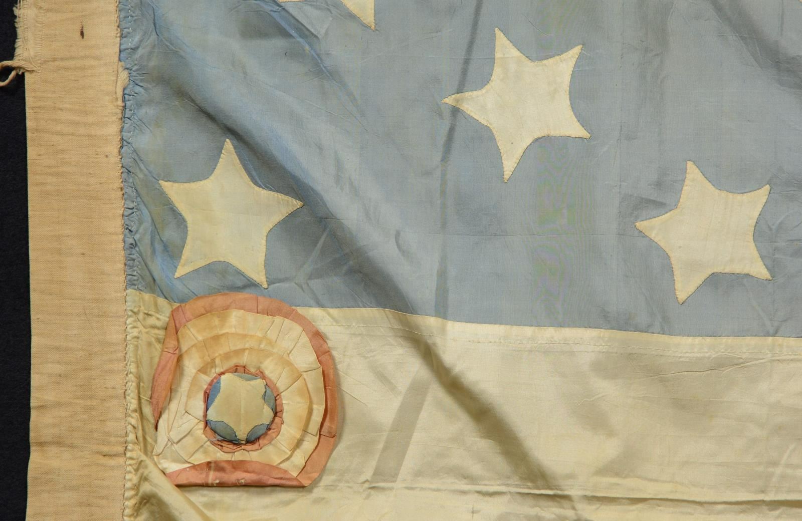 OF LT. RUSSELL CAPLES,SEARCY SHARPSHOOTERS, 16TH MISSOURI INFANTRY. Russell B. Caples: Paper files included with this lot include a statement by Russell B. Caples stating "APRIL of 1865 a tough remnant of our old regiment fought under General Kirby Smith….Returning home to Glasgow, I kept my sash and the flag under which I had fought so many battles. Mother had died and father [Confederate chaplain] was mortally wounded by a cannon shell during the battle of Glasgow [October 15, 1864]. I arrived home with no job and two half sisters to support." Russell Bigelow Caples (1841-1915) entered service as private in Searcy Sharpshooters in 1862 was promoted to Lieutenant serving till June 7, 1865 when he was given his parole of honor at Shreveport, Louisiana. The Searcy Sharpshooter's served in western theatre under Generals Earl Van Dorn & Sterling Price. Upon his return home finding such devastation, he turned to law, becoming attorney and later well-respected judge till his death in 1915. His retained flag this wonderful early war manufactured flag, characteristic of Missouri having unusual arranged canton of 14 stars. Flag is constructed of light weight silk and in remarkable condition considering its age and use. Flag is classic "stars & bars" or Confederate first national all hand sewn with 2 attached patriotic rosettes also of silk. Flag measures 41" hoist, 2" cotton sleeve, 62" on fly, canton is 19" x 17.5" with double applique 3" silk stars. UNATTACHED ASSESSORIES: Research letter by Confederate flag authority Greg Biggs & file of research on RB Caples and his regiment. CONDITION: very good overall, flag is solid and easily handled though fragile, fraying & splitting of silk in both red bars, loses at flay end from use, still 98% complete, red bars faded to red/brown. 3 small holes the size of minié balls are found in canton, top red bar, and white bar. (02-21024-1/JS). $35,000-45,000.