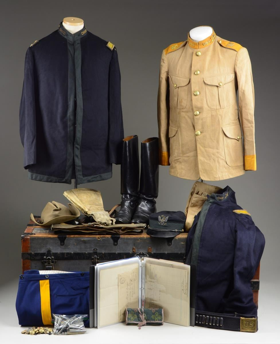 WAR UNIFORMS, MILITARIA AND EPHEMERA. This grouping of scarce items were the property of Second Lt. Leonard Paul Howland (1865-1942) who served as the Squadron Adjutant 1st regiment Ohio Volunteer Cavalry during the Spanish-American War. Howland was educated at Oberlin College. He then attended Harvard University Law School and was a practicing attorney. After the regiment's arrival at Chicamauga National Park, Ga. Lt. Howland was detailed as Regimental Ordinance Officer. Following the Spanish-American War he served 3 terms in congress and died in December 1942. The grouping includes a lg. amount of supporting research plus biographical data relating to Lt. Howland & his service. Some of this information is from internet research & some being copied from a book entitled "War With Spain. There is also a lg. quantity of correspondence & receipts relating to the supply & maintenance of the unit at Camp George H. Thomas located at Chicamauga National Park. The forms & receipts make fascinating reading & refer to a wide variety of items ranging from corn meal to cartridges. The ephemera is well organized in sleeves and binders. 1) Khaki coat and trousers. The coat has orange collar, shoulder straps & cuffs. Dome buttons have eagles w/ "C" in shield. Brass insignias on the standing collar are crossed sabers w/ "1" and "OHIO" followed by "U.S.V.". Shoulder straps have eagles w/ upswept wings, olive branch and arrows plus "E Pluribus Un um". CONDITION: Trousers and coat are well worn w/ extensive staining. Stitching appears tight. 2) 1895 U.S. Calvary Officers Coats, Trousers and Cap. The 2 officers wool lined coats are dark blue w/ dark green facings. The shoulders carry Lt. insignias. The standing collar embroidered having crossed sabers w/ "K" and "OHIO". The pair of wool blue trousers have yellow stripes. The cap has an embroidered eagle w/ a ribbon in its beak on the front and a braided cord over the patent leather visor. Cap is marked inside McLilley, Columbus, Ohio. CONDITION: the coats are well worn w/ staining and several tears. The gold colored embroidery is turning dark. 3) Olive drab Campaign Hat w/ center crease. Hat has snowflake vents & brown ribbon band. Hat has I.D. inside to Howland / I.O.V.C. CONDITION: Hat has light wear & staining but stitching appears tight. 4) one pair of black leather riding boots. The boots are unmarked except for Lt. Howland's hand written name inside. CONDITION: Boots have wear, flexing and scuffing. 5) Dark blue Mills woven cartridge belt having 45 single loops with brass U.S. plate. Belt is equipped w/ brass suspension hooks. Cartridge loops are filled w/ U.S. 38 cal. cartridges commonly referred to as 38 long Colt. Most appear to be Frankfort Arsenal tinned cases. Rnd. nose lead bullets. Head stamps are faint but most appear to be 1898 dates. Belt is accompanied by a period cigar box containing approx. 32rds. of military 30/40 Krag ball cartridges from Frankfort Arsenal UMC and WRA. Head stamps appear to be 1898 range. 10 rds. of 38 rd. Colt cartridges. CONDITION: belt is worn & has light staining. Stitching is tight. Brass plate has patina w/ spots of verdigris. Cartridges have wear & staining. Rifle rds. have many split necks common to the aging brass cases. 6) cloth drawstring bag contains a quantity of buttons including 5 brass eagle cavalry buttons. These buttons relate mostly to military clothing. CONDITION: items have wear & lightly oxidized appearance. 7) a folding cloth ("Housewife") sewing kit. 8) russet leather. SAM BROWNE belt & several related equipment straps. CONDITION: leather is aged w/ shrunken appearance. 9) 1 pair of tan leather riding gloves size 8 w/ gauntlets. CONDITION: gloves are well worn w/ staining. 10) group is contained in a period footlocker marked McLilley on the inside top. Footlocker w/ wood and metal reinforcements measures approx. 44 1/2" X 15 1/2" X 14 1/2"D and has compartments w/ removable shelf & box. CONDITION: footlocker has well worn but pleasing vintage appearance and is serviceable except for missing leather handles. Key is not available. (02-19781/RW). $3,000-5,000.