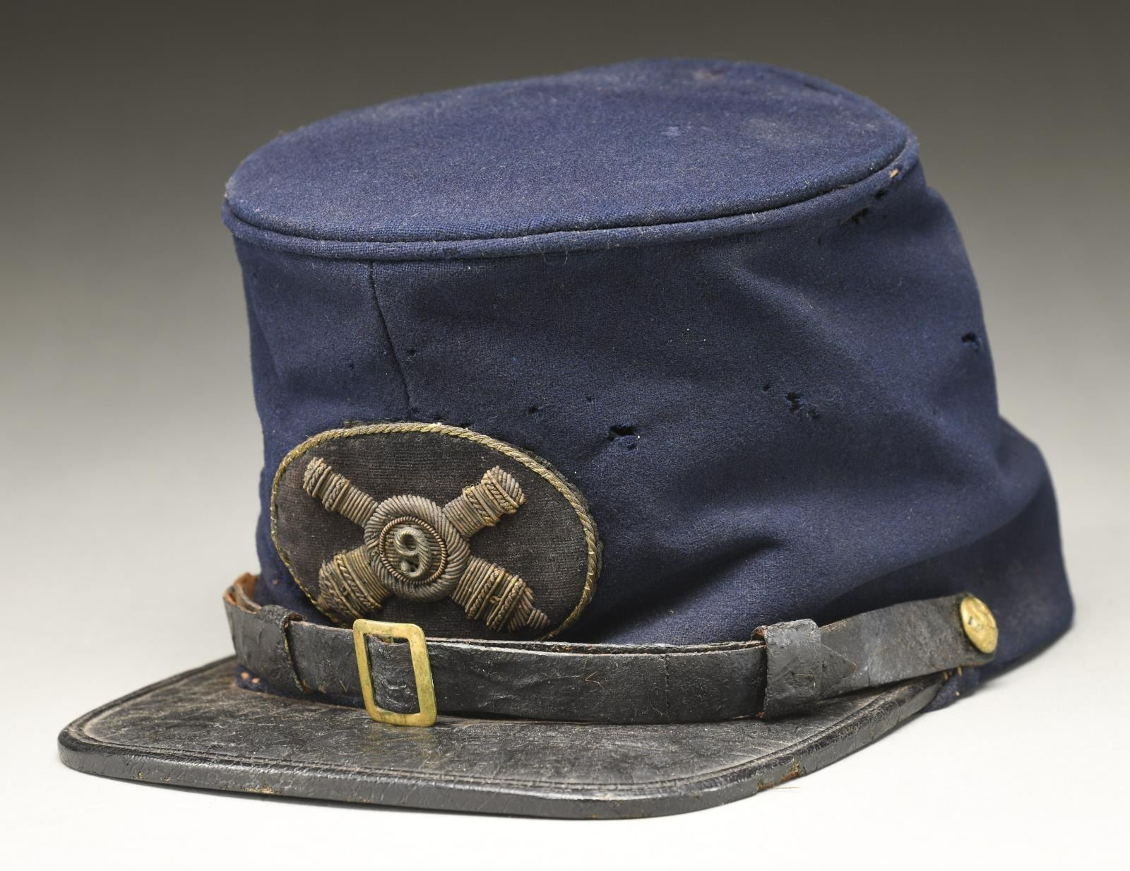 This fine cap has a dark blue wool body with a black leather chinstrap and a tarred black leather-bound visor. The side buttons are eagle "A" and the insignia on the front is a velvet oval with a gold embroidered cross cannon insignia superimposed by a silver false embroidered "9". The sweatband is dark brown leather. The interior has black silk over burlap and what appears like wool stuffing. The interior crown is quilted. CONDITION: the cap does show significant mothing on the exterior. The tarring on the chinstrap & visor shows some heat damage. Sweatband remains strong. The black interior lining is somewhat disintegrated particularly in the rear of the hat. PROVENANCE: From the Collection of James B. Taylor. (02-19908/BF). $1,800-2,500.