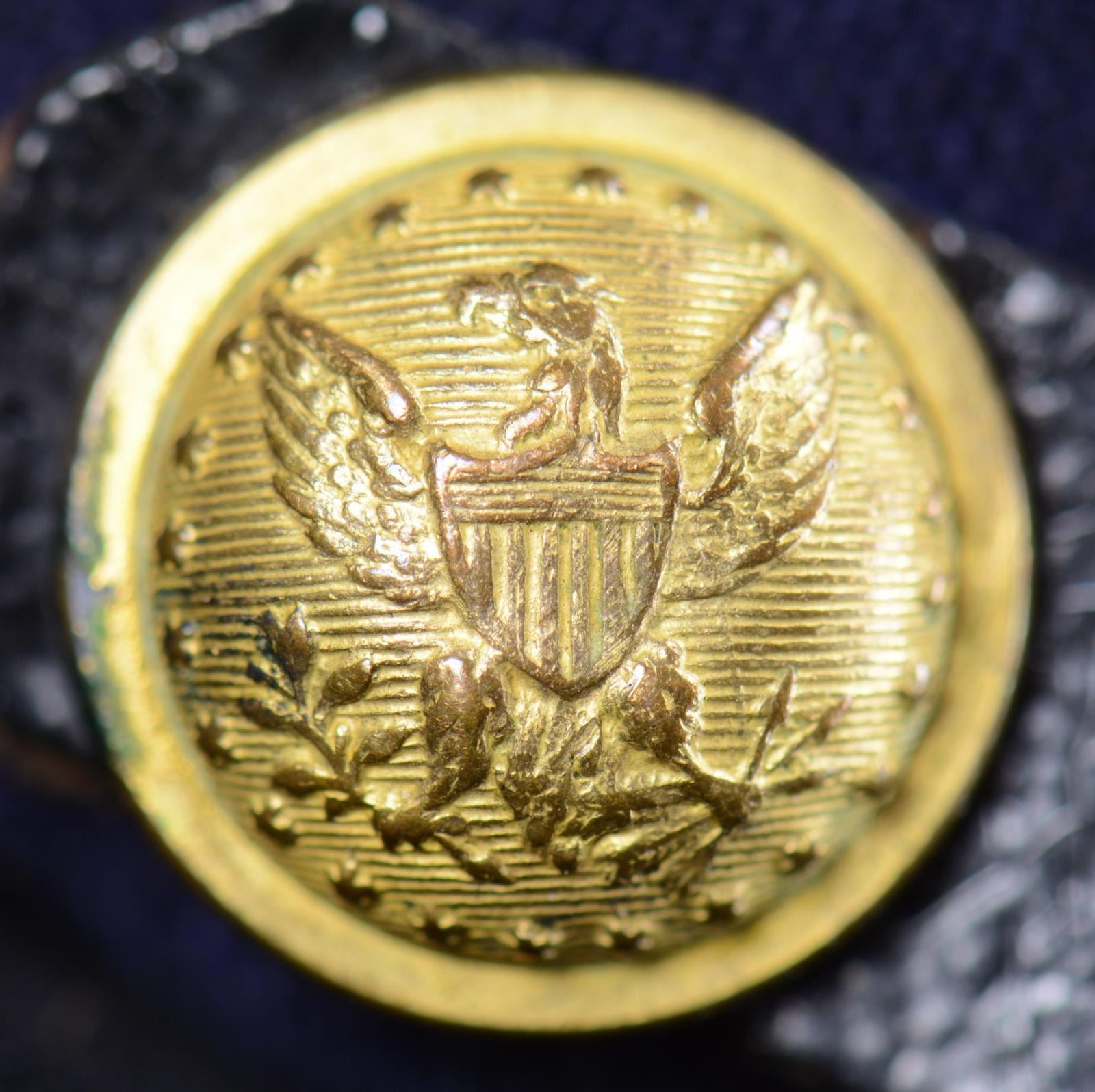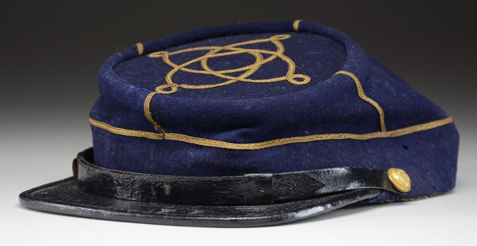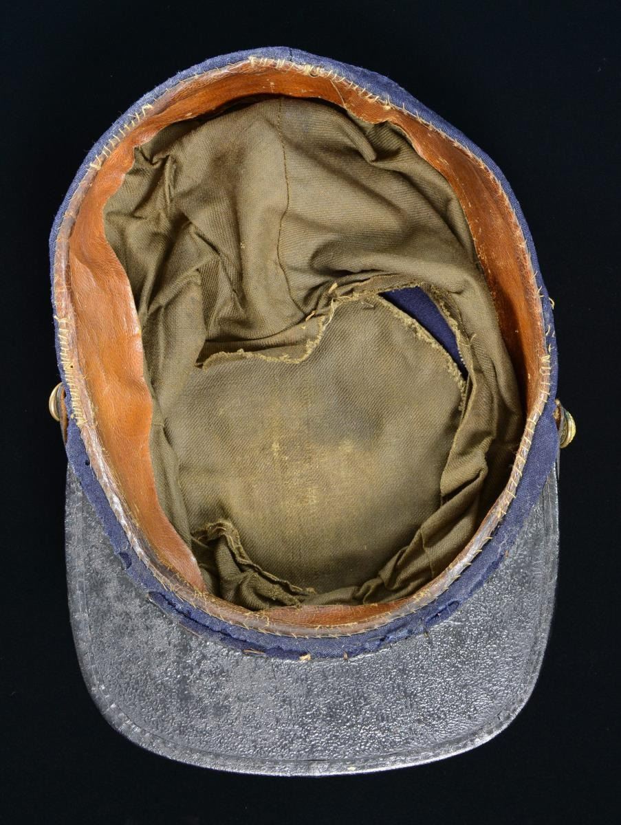 This well-made kepi has a blue wool body with thin gold bullion trim around the cap, up the back & front, as well as both sides. The bullion trim is also used to form a simple quatrefoil on the crown of the hat. Black leather chinstrap with what appears to be an enameled finish and a similar bound-edge visor with a matching finish. The chinstrap is terminated by 2 early, heavily gilded, small staff officer buttons back marked "ROBINSONS .MAKERS.". Brown leather sweatband with dark brown, polished cotton liner. The band & crown appear to be reinforced with heavy cardstock. CONDITION: generally, the hat shows light to moderate wear with minimal moth damage, and some heat damage to the chinstrap & visor. The liner is complete but occasionally detached. Sweatband is 100% but appears to have been reattached in a few spots. (02-20133/BF). $1,500-2,000.