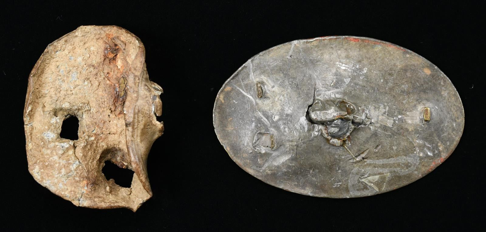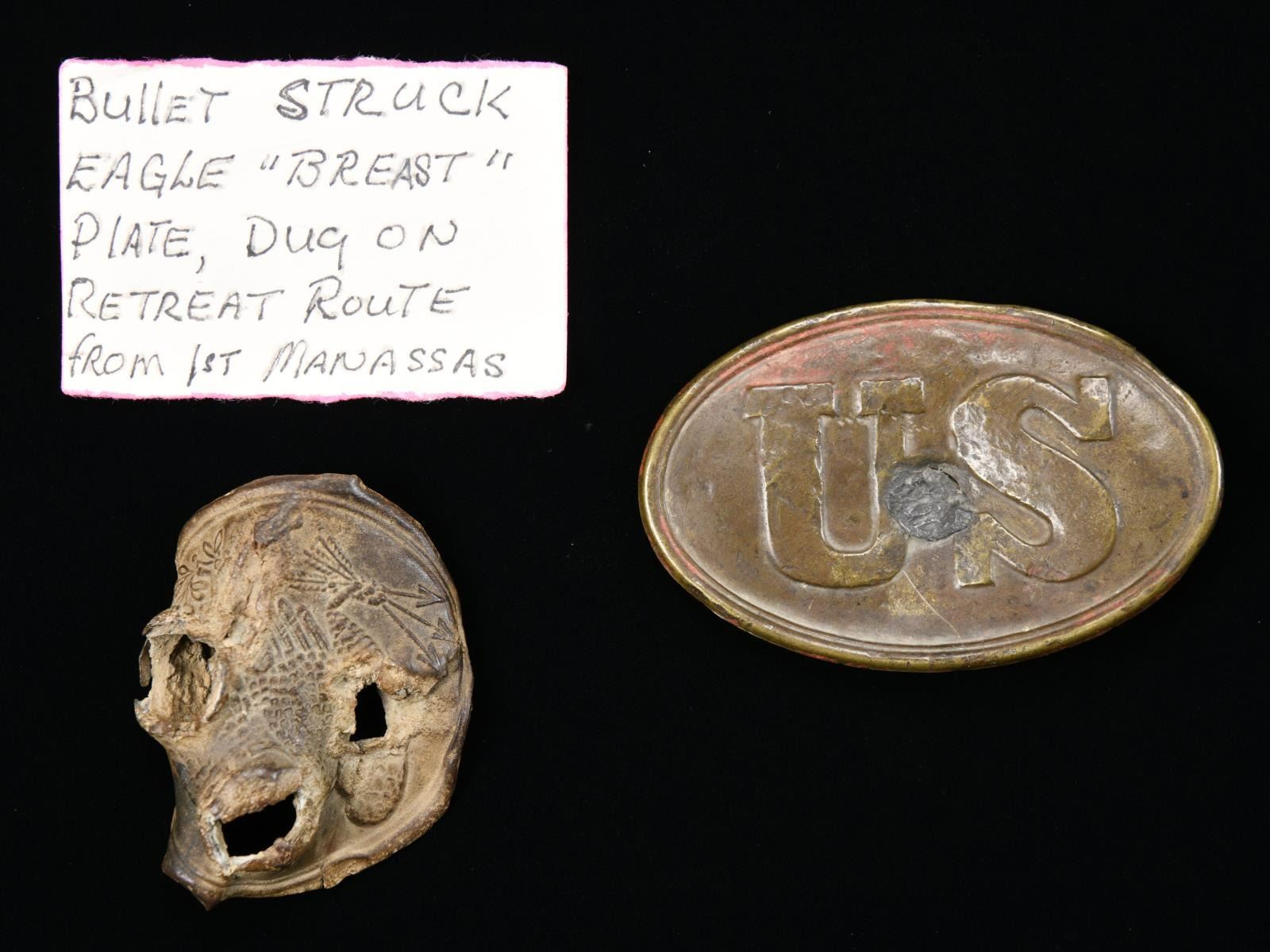 ACCOUTREMENT PLATES. 1) Eagle breast plate with 3 minié ball sized holes struck from back. An accompanying tag dated 1968 states it was dug on retreat route from 1st Manassas. Appears to be impeccable "wounded relic". 2) US belt buckle, all 3 hooks removed, ball embedded in face, non-excavated. CONDITION: eagle plate overall very good for excavated plate, iron wire broken by one ball, buckle is overall very good for damaged belt plate. PROVENANCE: From the Lifelong Collection of Glen E. Mattox. (02-18395/JS). $1,500-2,500.