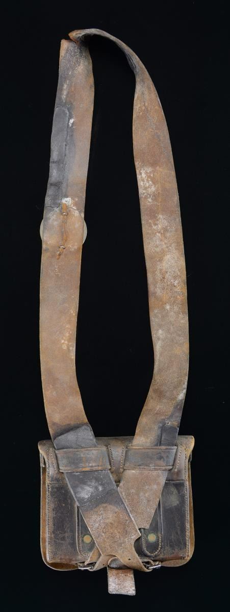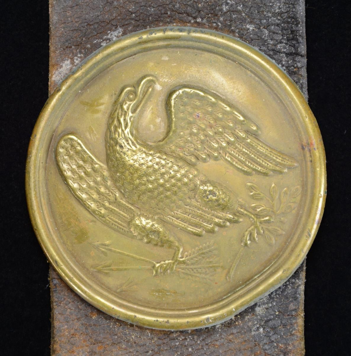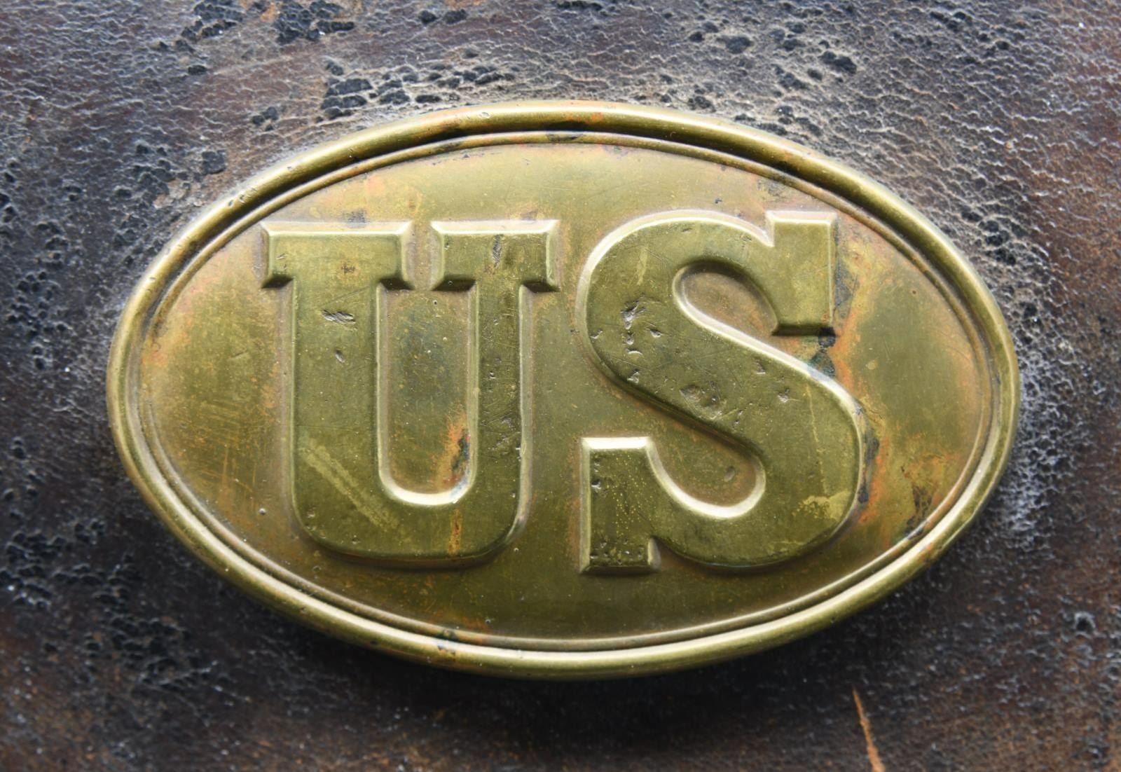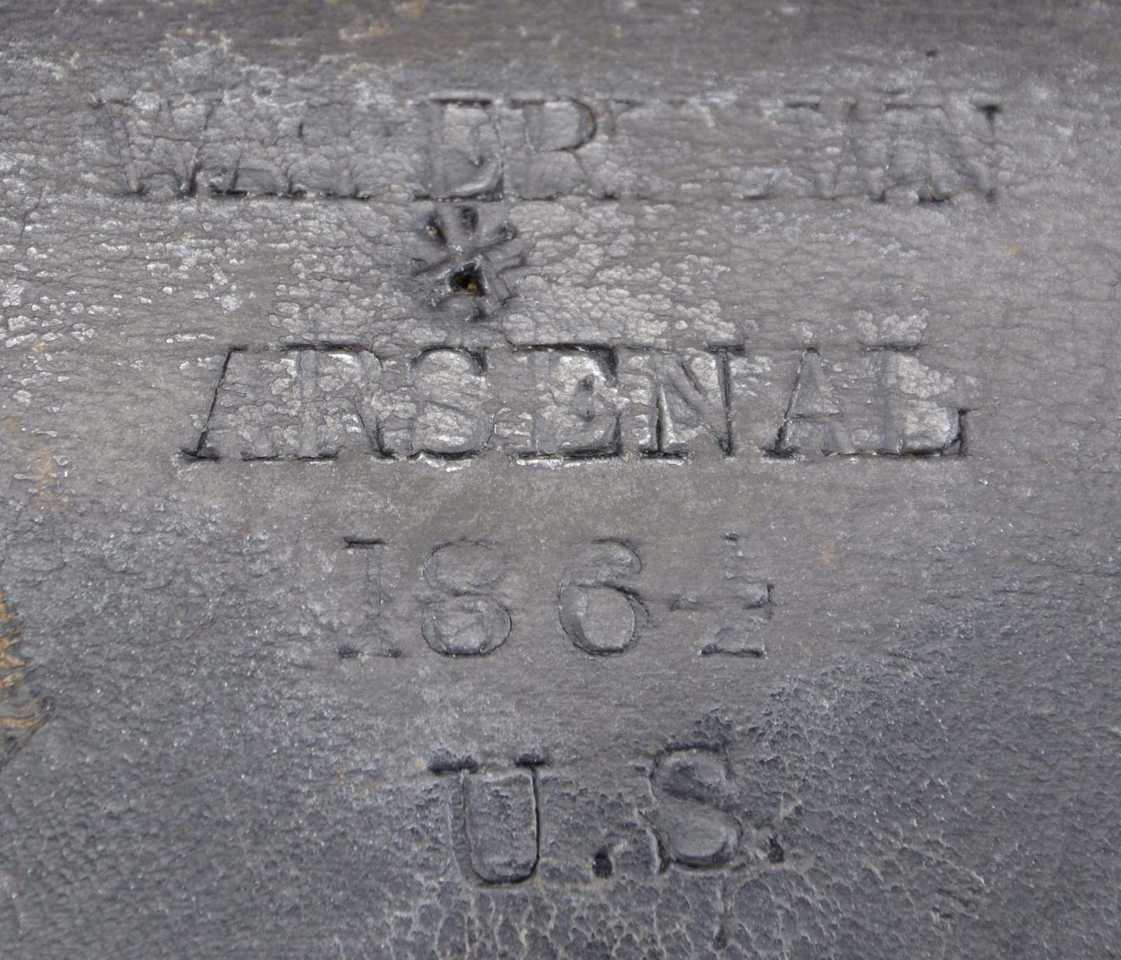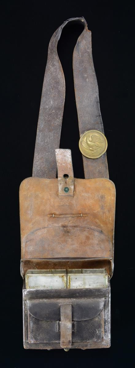 A good example of a Civil War period cartridge box with its original over-the-shoulder sling. The box has a large "US" in oval brass plate on the front. The inside flap is marked "WATERTOWN ARSENAL 1864 U.S.". The interior is complete with tins. Both original buckles remain on the base and belt loops are intact. The shoulder strap has its original round brass eagle buckle. CONDITION: the box shows overall moderate wear but the closing strap has been replaced. The shoulder strap has been repaired at several points and is starting to separate again. PROVENANCE: From the Lifelong Collection of Glen E. Mattox. (02-18735/BF). $400-600.