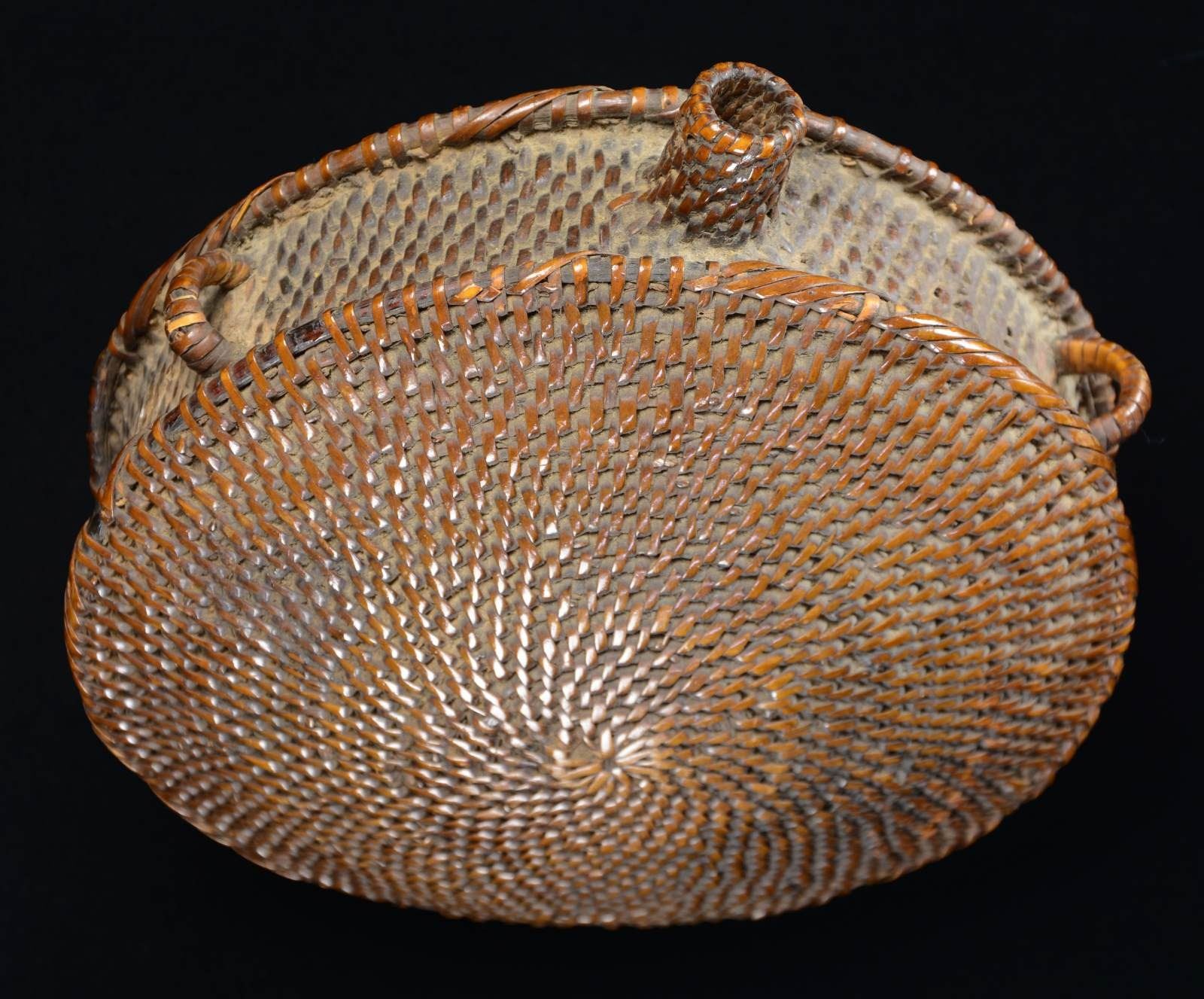 This canteen measures approx. 9" in diameter with a spout that measures 1 1/8". Canteens, constructed like this one, have been the subject of much debate over the years. They have been found as far East as the Carolinas, and as far West as the desert Southwest. It has been proposed that they were originally made by slaves for use in the field. Although this is possible, it seems far more likely they were produced by Native Americans, who were masters of basketry. Canteens like this have been associated with the Apaches, the Cherokees, as well as other Native American tribes. It is possible that canteens like this could have been pressed into limited Confederate service, as they did exist during the Civil War. The canteen shows superb craftsmanship and is created in a manner similar to weaving wicker or grass baskets. Once the wicker shell is completed, the interior is repeatedly coated with wet clay until the canteen becomes waterproof. CONDITION: the canteen is in amazing condition for its age with very minor losses to the wicker. The interior clay coating is intact. The overall patina of the piece is exceptional. (02-20116/BF). $600-1,200.