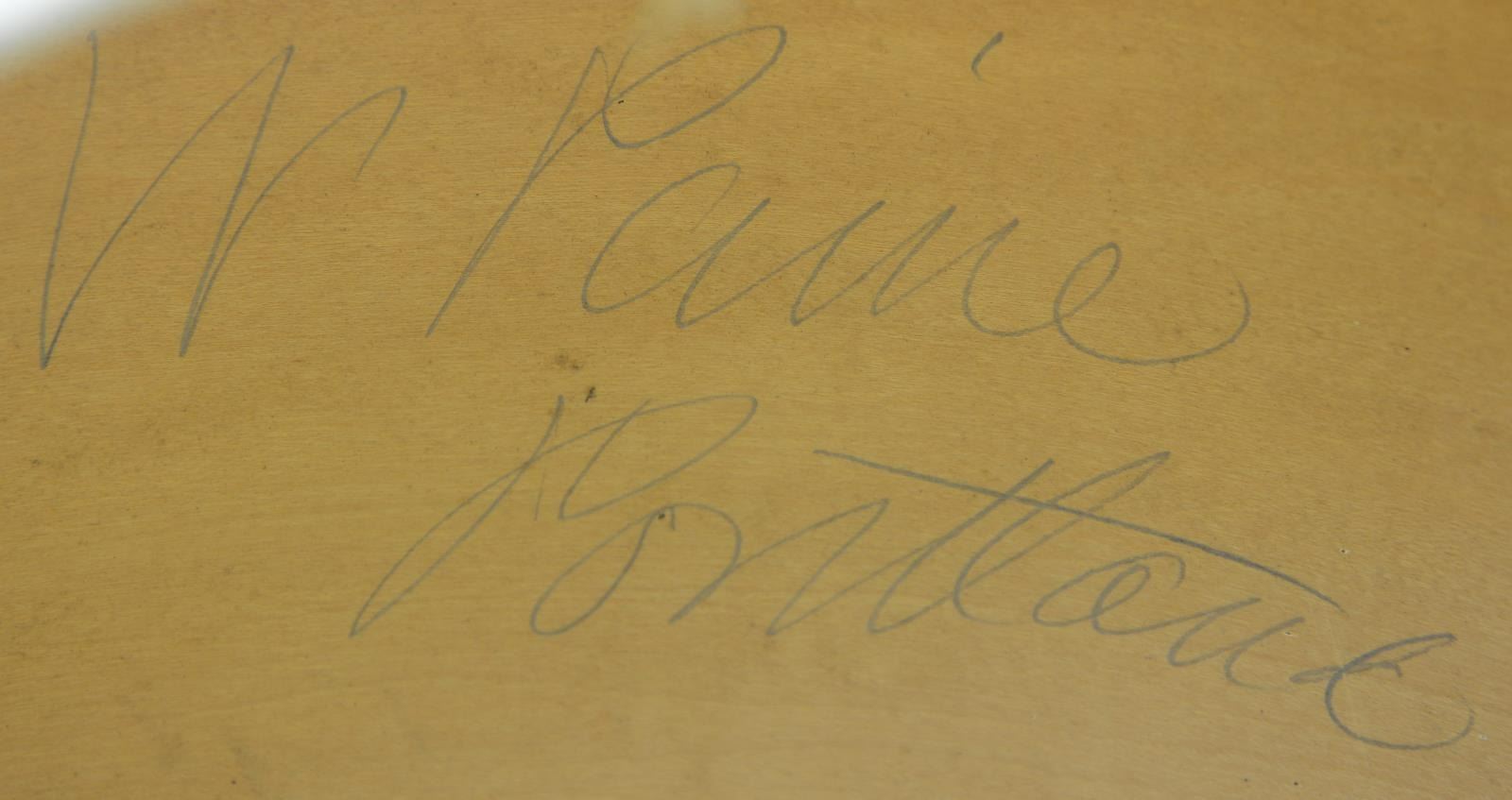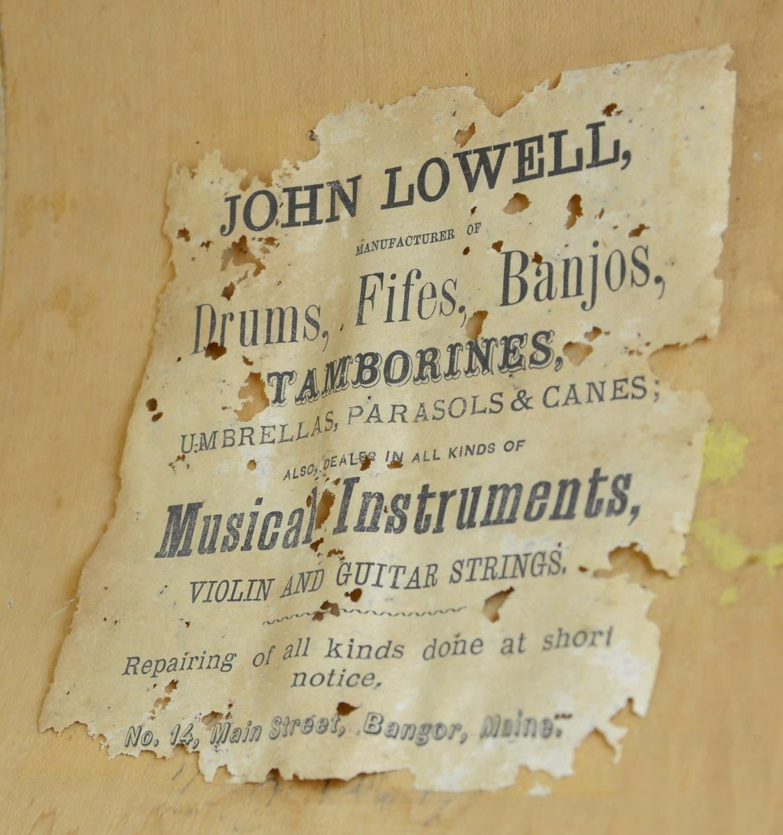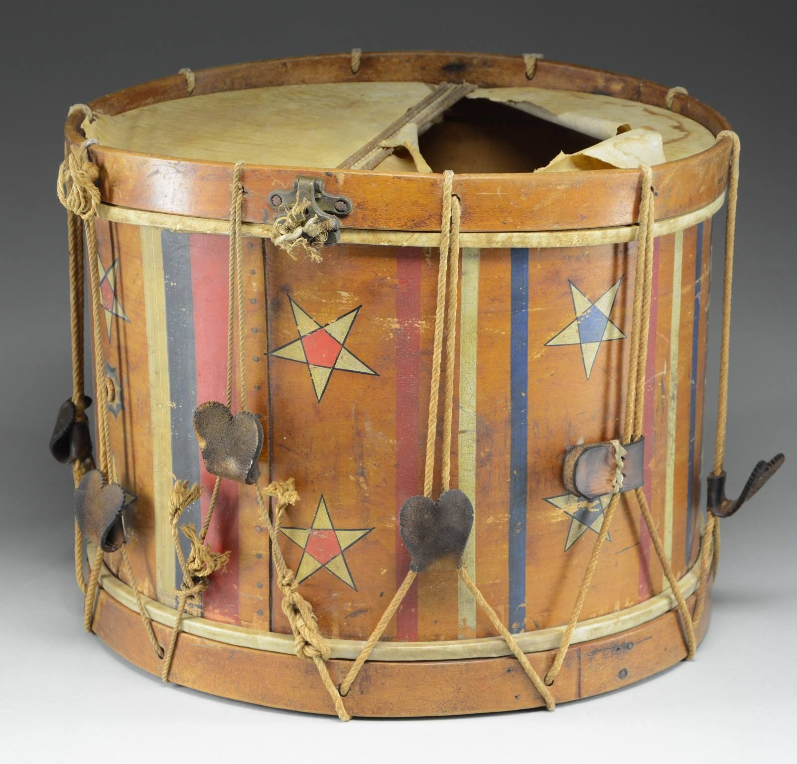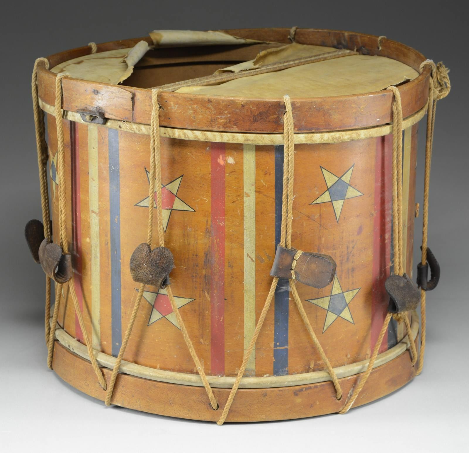 MAINE. Drum measures 17 1/4" across and 14" high. It has an upper skin intact & a partial lower skin with the lower skin having 6 snares intact. The 2 hoops are the early lace-through style with a natural finish. The wooden body of the drum has red, white, & blue painted decorations with 16 stars encircling the drum, and numerous red, white, & blue stripes. There is an 8-pointed blue star encircling the peep hole. The label inside the drum reads "JOHN LOWELL, MANUFACTURER OF Drums, Fifes, Banjos, TAMBOURINES, UMBRELLAS, PARASOLS, AND CANES; ALSO DEALER IN ALL KINDS OF Musical Instruments, VIOLIN & GUITAR STRINGS. Repairing of all kinds done at short notice, No. 14, Main Street, Bangor, Maine.". The inside of the drum is signed in pencil "W Paine Portland". The ropes & tugs appear to be original but have several spliced repairs. CONDITION: the drum is quite solid overall. The top skin is intact and the bottom skin is split near the center. The hoops are in good shape and positioned well. The painted decoration remains reasonably vivid and is quite clear. Tugs are dry and a bit brittle. Ropes have losses. Signature & label remain clear. (02-20121/BF). $1,200-1,600.