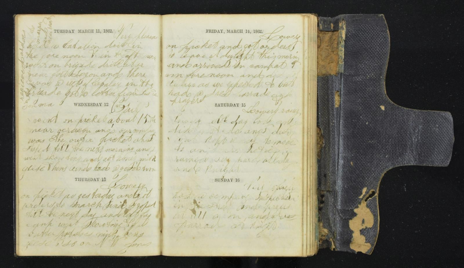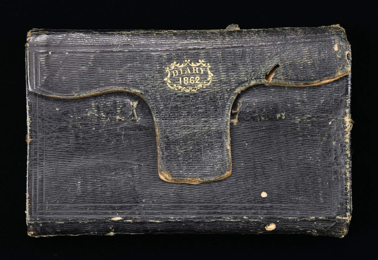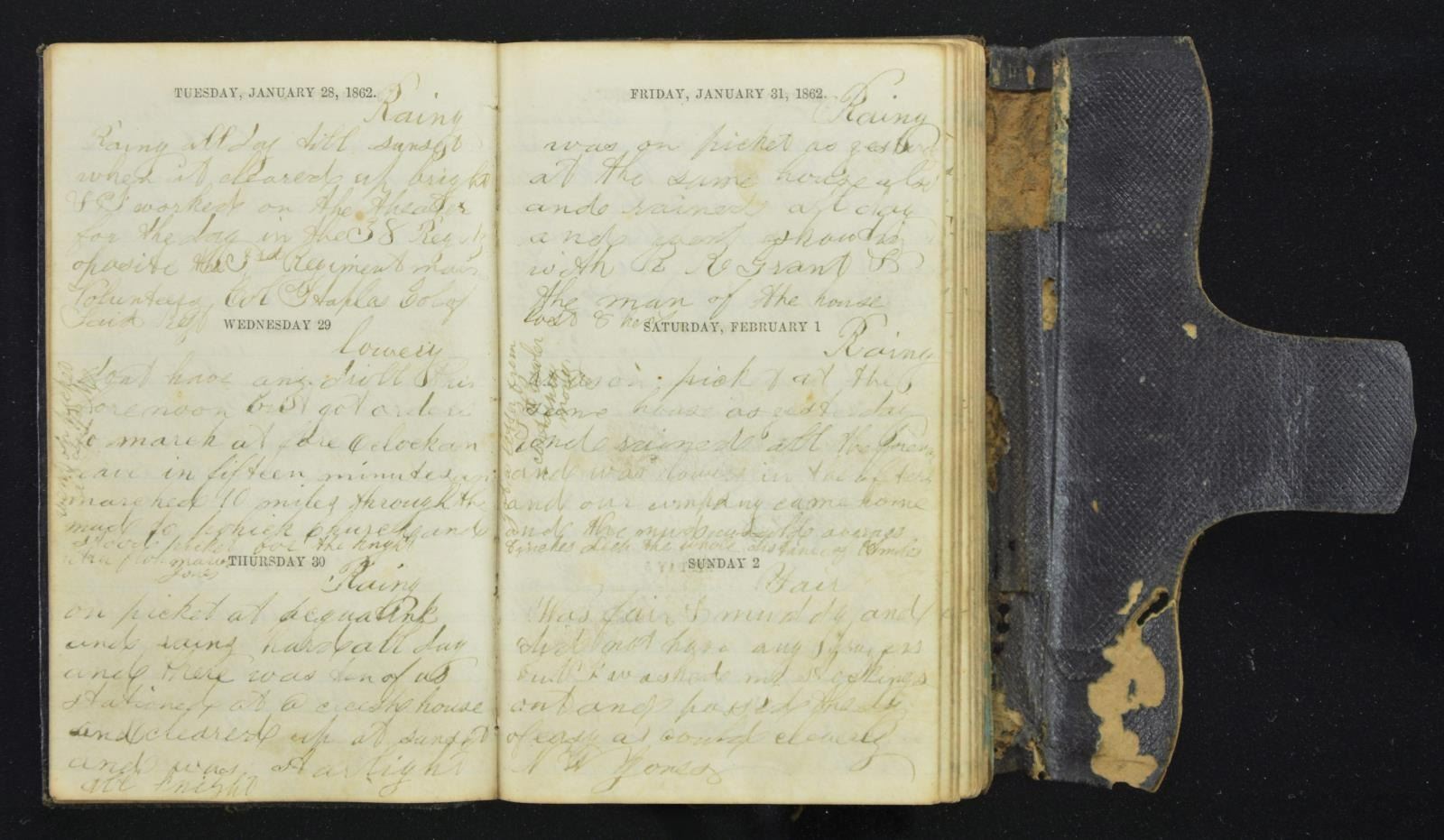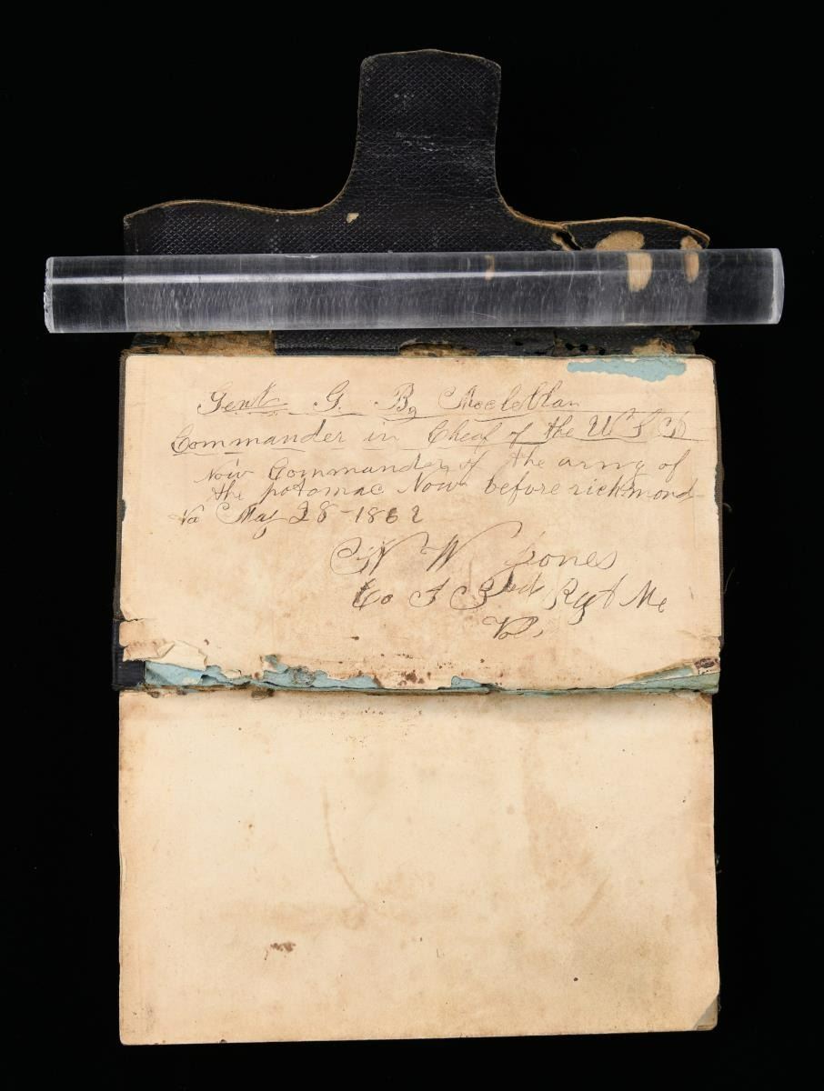 MAINE VOLUNTEERS. This handwritten diary covers the year 1862 and was kept by V.W. Jones of Company I of the 3rd Maine Infantry. This is a very newsy diary with most of the entries starting with a weather report. It speaks of camp life and the trials & tribulations of a Civil War soldier in camp and on the march. In skimming the diary, we note several passages mentioning the Battle of Fredericksburg in particular. An interesting inscription on the rear page reads "Genl. G. B. McClellan Commander in Chief of the U S A Now Commander of the army of the Potomac Now before richmond Va May 28-1862". Jones then signs the entry "V W Jones Co I 3rd Rgt Me Vol." CONDITION: the diary shows wear with minor insect damage, but the pages are mostly in good shape and the hand is quite legible. The closure strap on the front of the diary is missing. (02-19779/BF). $300-500.