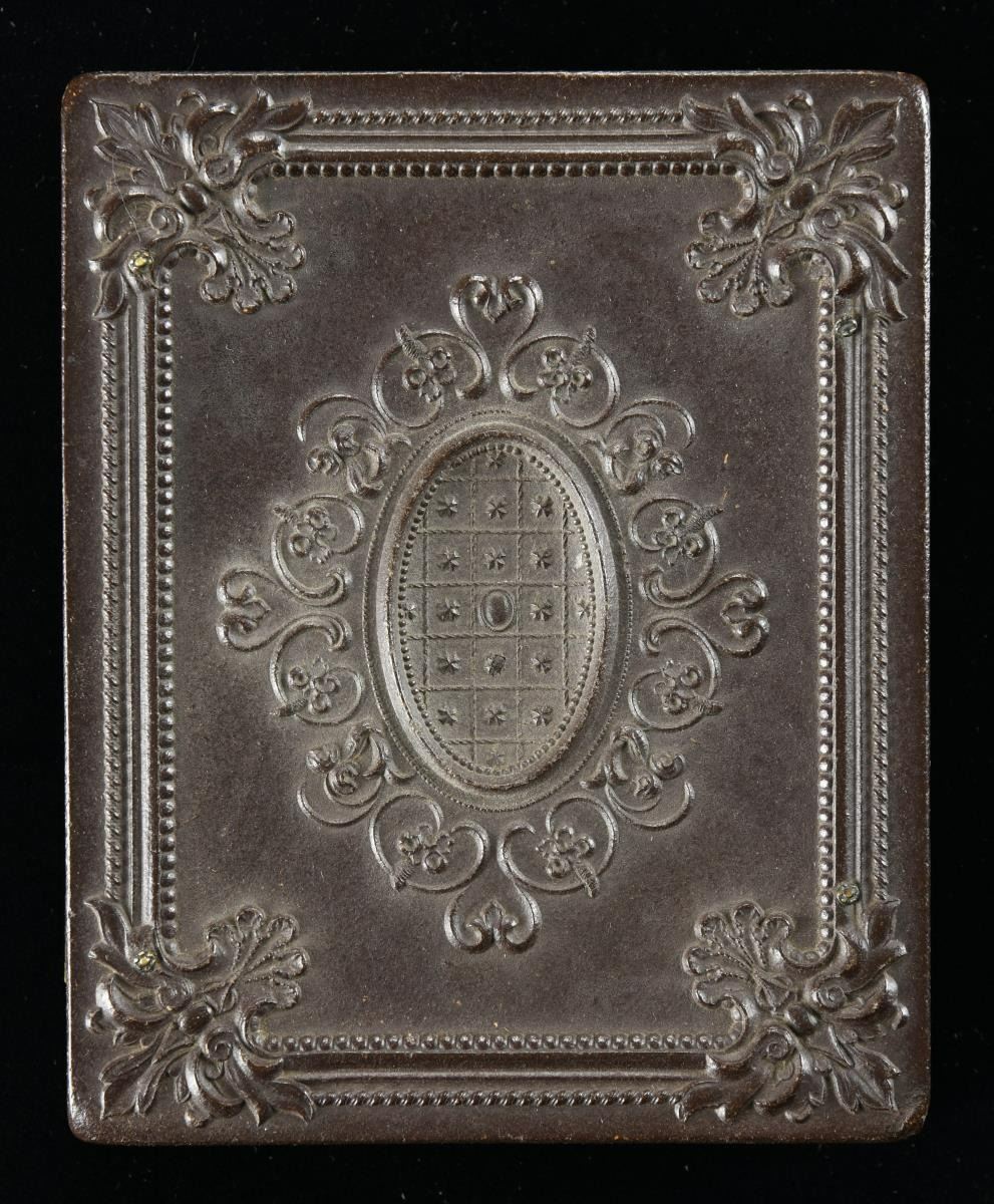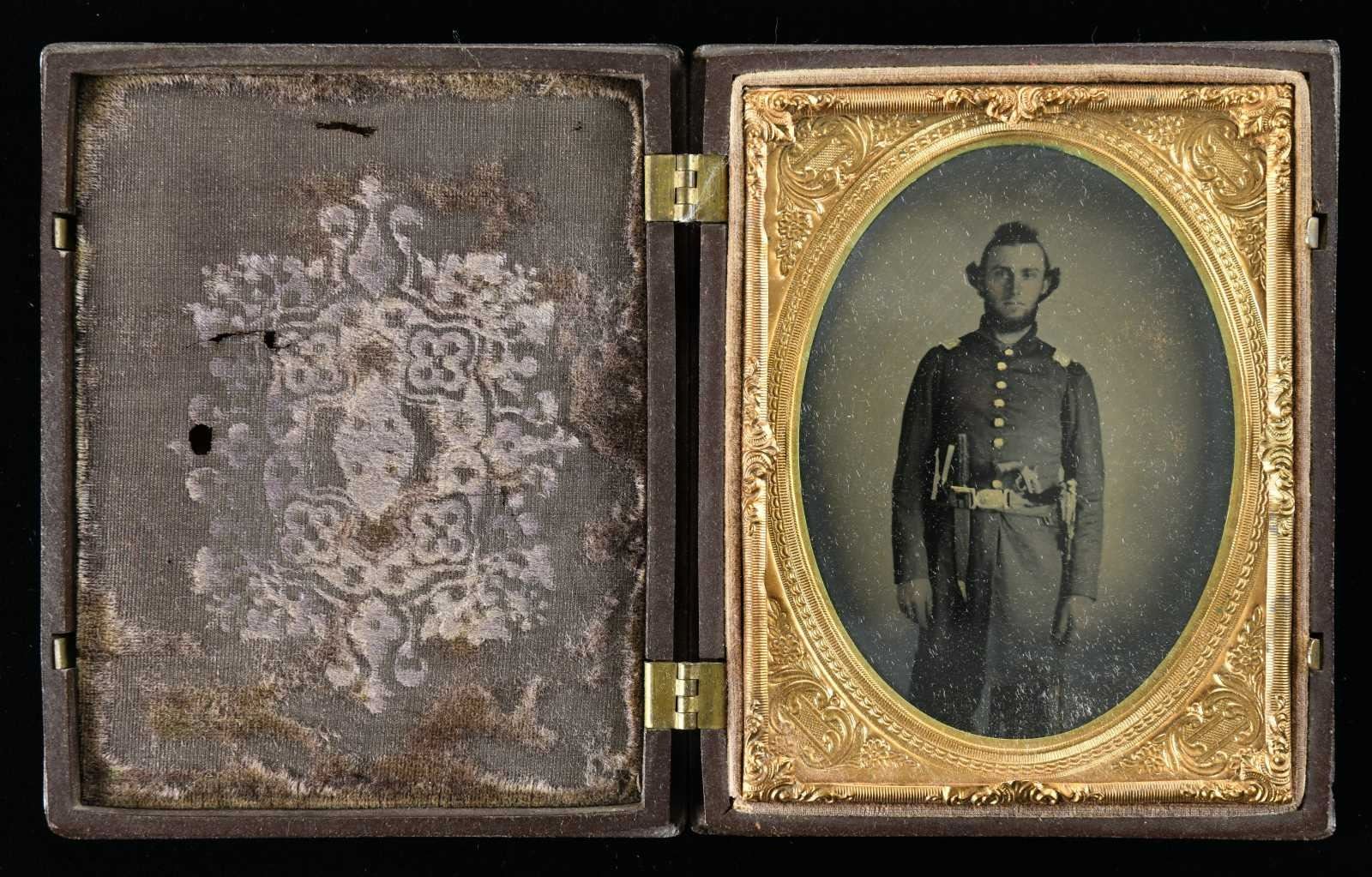 Quarter plate standing view of company grade officer frock with shoulder straps wearing militia sword belt, sword, revolver (appears to be Bacon Arms), & large bowie knife. Buttons, buckle, & sword hilt are gilded so details lost, still an impressive image in complete gutta percha case. CONDITION: good overall, crisp detail, scratched emulsion on right side affecting right arm of soldier, oxidized halo on emulsion around oval mat. Housed in half case with glass & mat. PROVENANCE: From the Lifelong Collection of Glen E. Mattox. (02-18386/JS). $800-1,200.