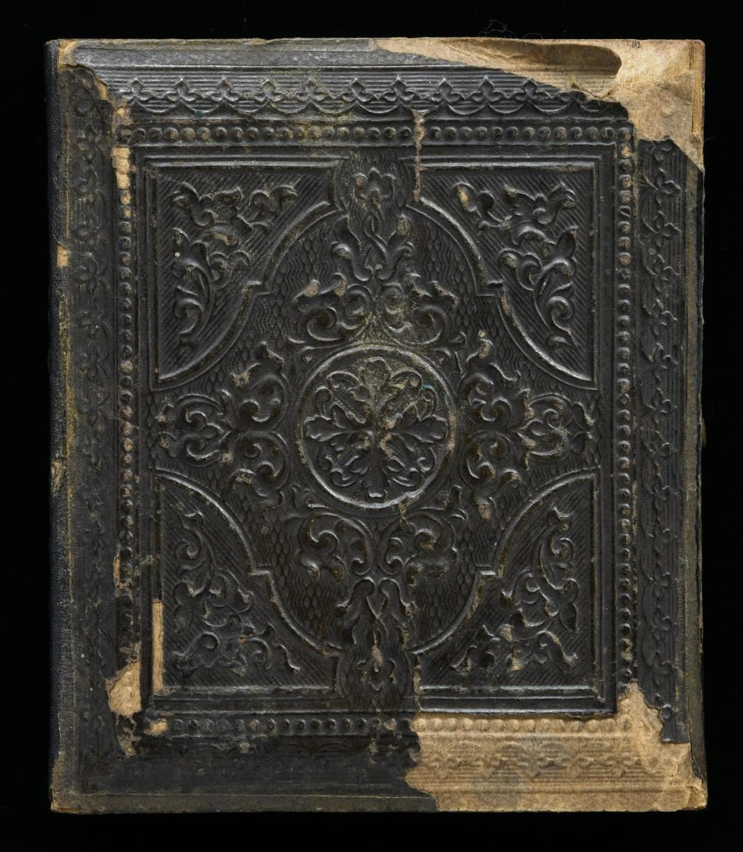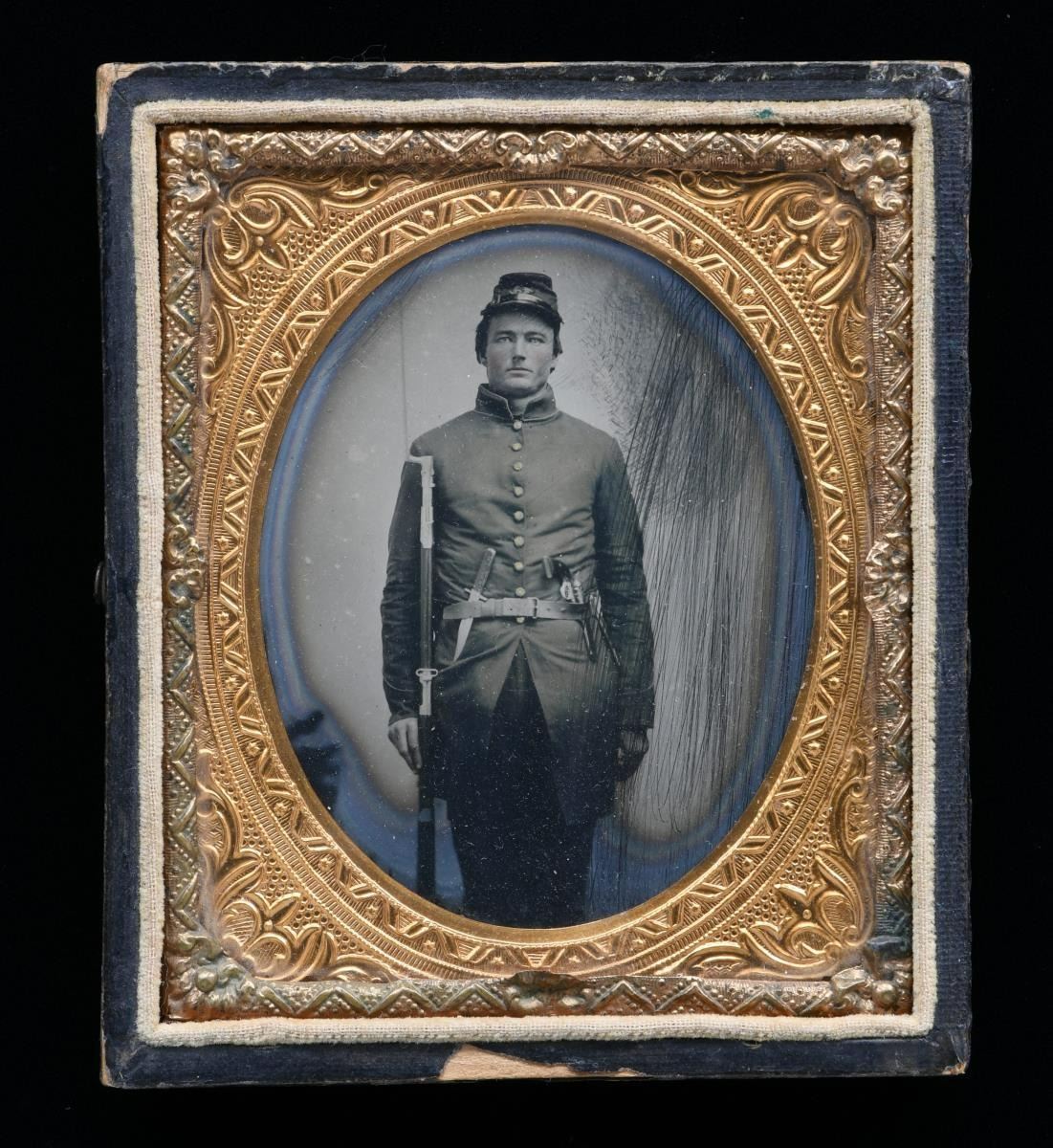 Sixth plate standing view of Union infantryman wearing 9-button frock, forage cap, holding model 1842 musket with bayonet. A Sheffield bowie knife and Colt navy style pistol are displayed in his roller buckle belt. A very clear image with sharp details. CONDITION: good overall, crisp detail, scratched emulsion on right side affecting right arm of soldier, oxidized halo on emulsion around oval mat. Housed in half case with glass & mat. PROVENANCE: From the Lifelong Collection of Glen E. Mattox. (02-18387/JS). $800-1,200.