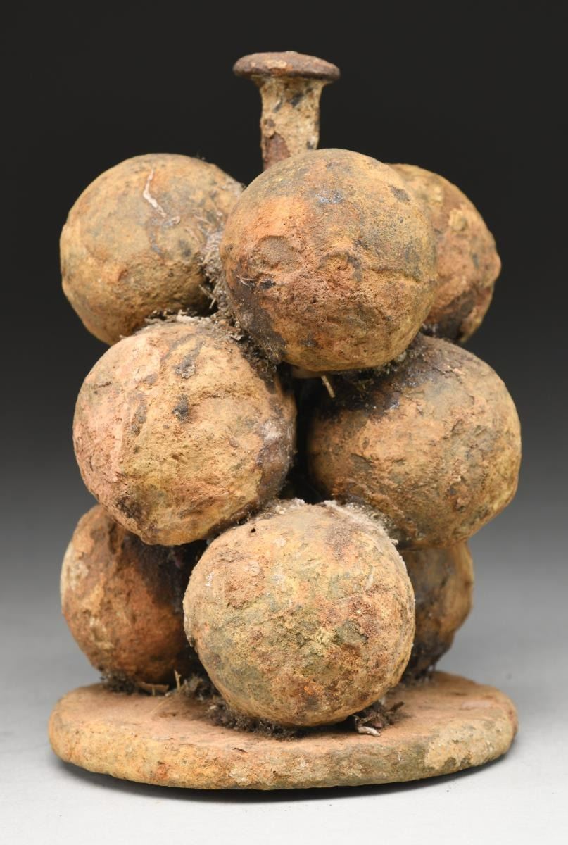 This stand is likely for an 18 pounder and has an approx. diameter of 5.03". Along with the base & the stand there are 9 balls roughly 2" in diameter around the central shaft. CONDITION: the excavated stand appears to be relatively solid & stable. It has a brown/red dirty oxidized overall patina. (02-19789/BF). $800-1,300.