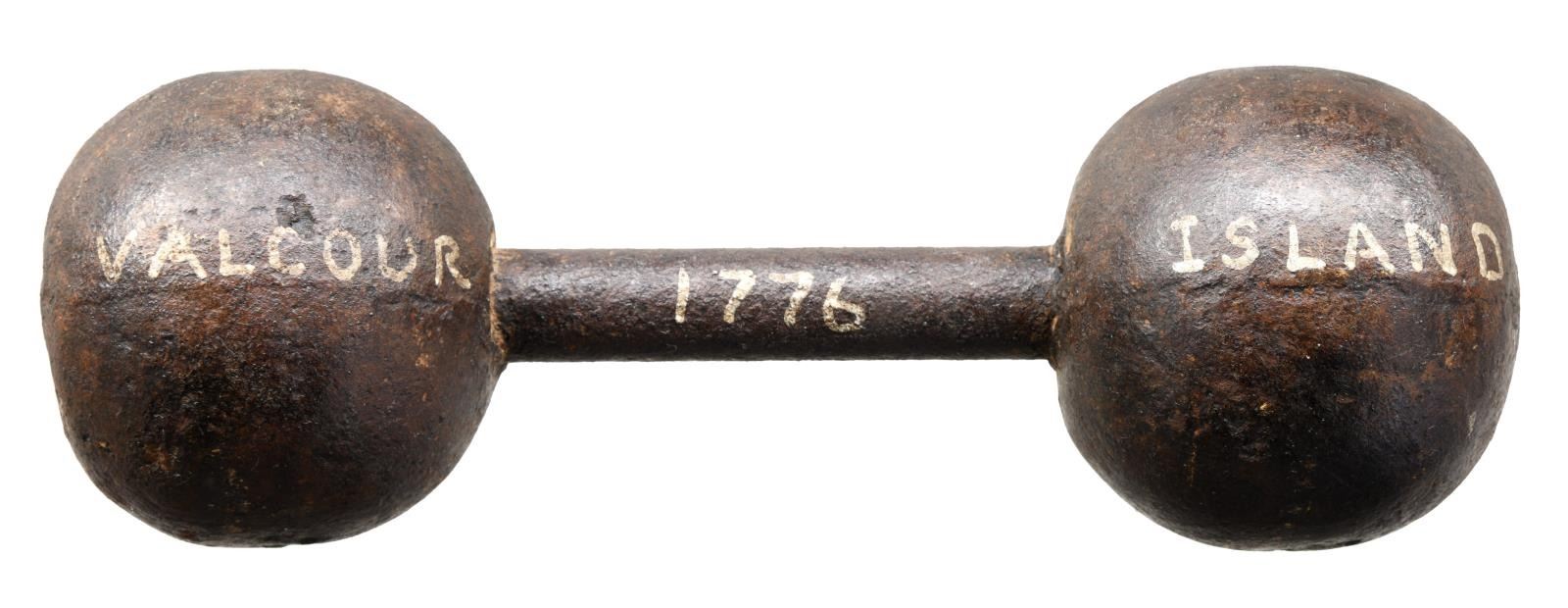 This bar shot consists of 2 balls measuring 4" in diameter joined by a 4 1/2" long and 7/8" wide round iron bar. The total length of the shot is 11". This bar shot was recovered near Valcour Island on Lake Champlain. The bar shot itself has "VALCOUR 1776 ISLAND" written in old faded white paint on one side. The famous battle of Valour Island took place on October 11, 1776 and was one of the first Naval engagements of the Revolutionary War. CONDITION: bar shot has an overall dark patina. Painted letters are still easily legible. (02-19790/BF). $1,000-1,500.