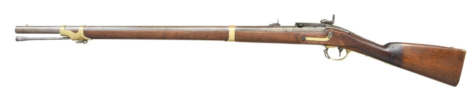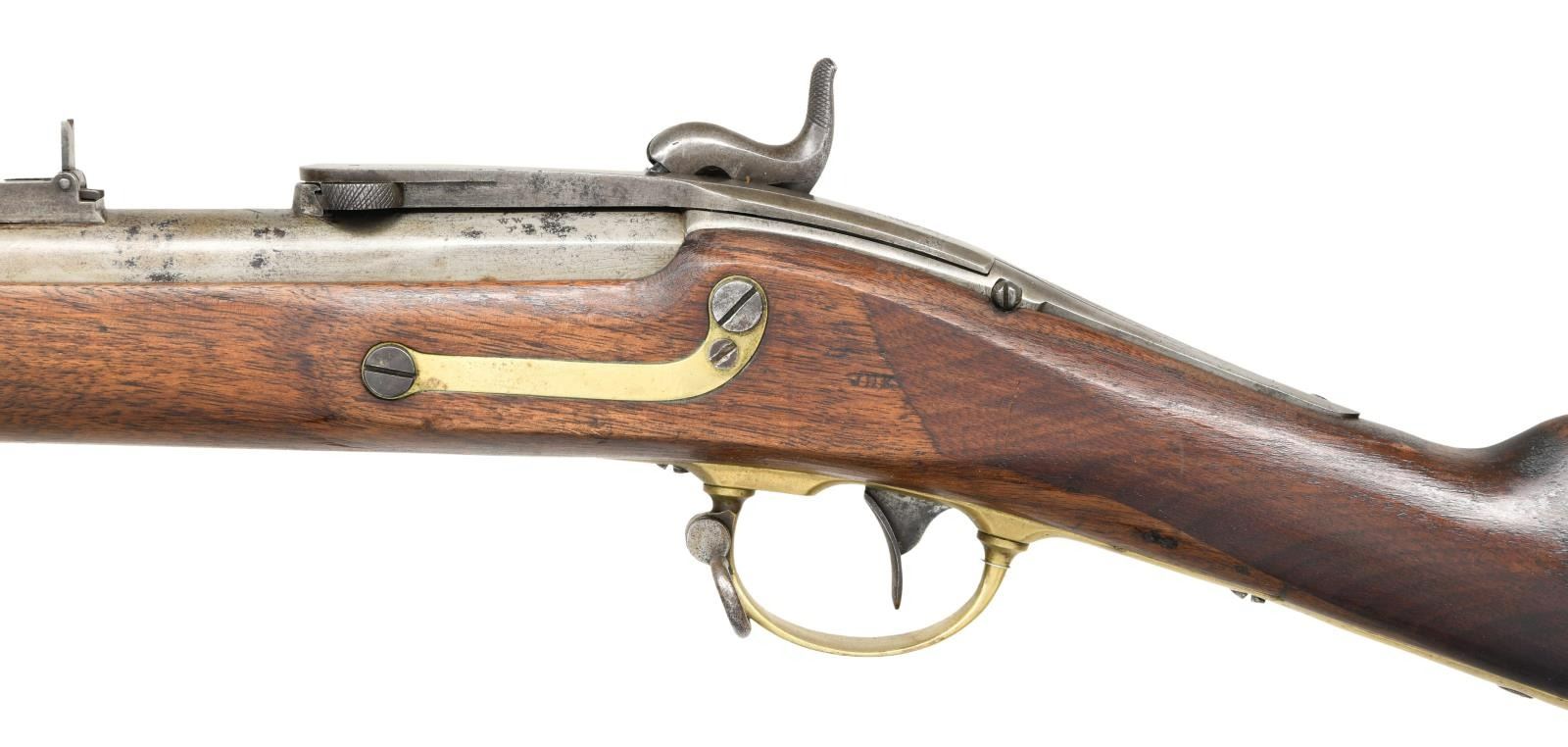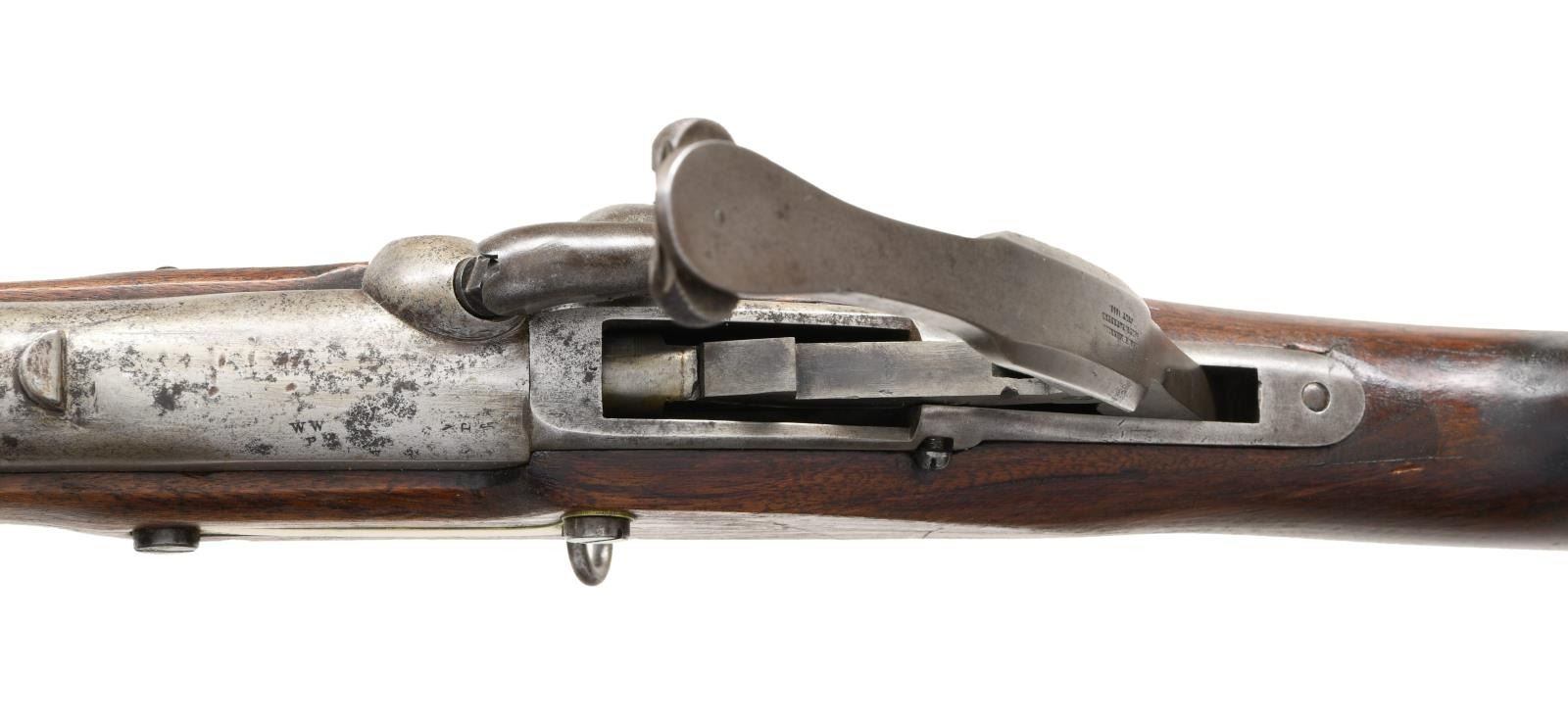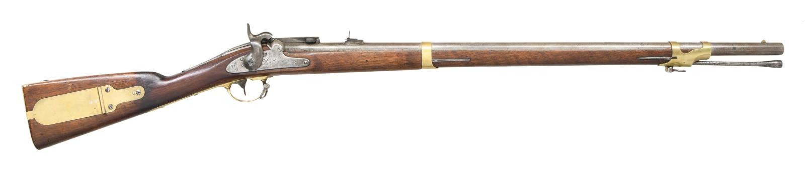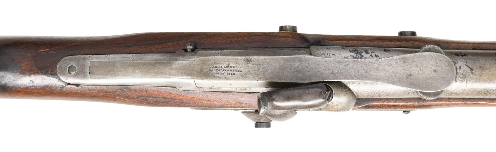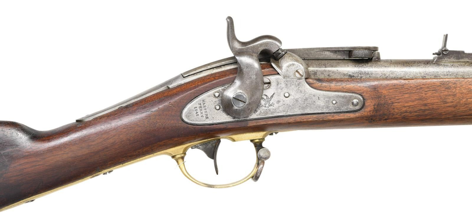 RIFLE. Cal. 54. NSN. Bbl. 33". This rare gun is an M1841 Mississippi rifle with a Merrill alteration done in 1861 or 1862. There were a total quantity of 100 alterations to M1841 rifles done by James H. Merrill of Baltimore, Maryland. The alteration replaced the original tang/breech plug with the Merrill breech loading mechanism. Round barrel with brass bladed front sight and fixed, folding rear sight. The breech is marked "WW PM V / P / (eagle head)". The lock is marked "(eagle)" over "US" in front of the hammer, and "HARPERS FERRY 1848" to the rear of the hammer. Brass trigger guard, patchbox, buttplate, side plate, and barrel bands. Iron ramrod and sling swivels. The Merrill alteration is stamped at the top "JAS. H. MERRILL BALTO. PATENTED JULY 1858.". Stock has inspectors' marks in back of the side plate. CONDITION: barrel, lock, and alteration have medium gray patinas. Brass has a pleasing mustard patina. Lock holds both full & half cock, and alteration functions very well. The stock has a noticeable, but very well done, repaired area surrounding the wrist. Excellent bore. (01-23175/BF). ANTIQUE. $5,000-8,000.