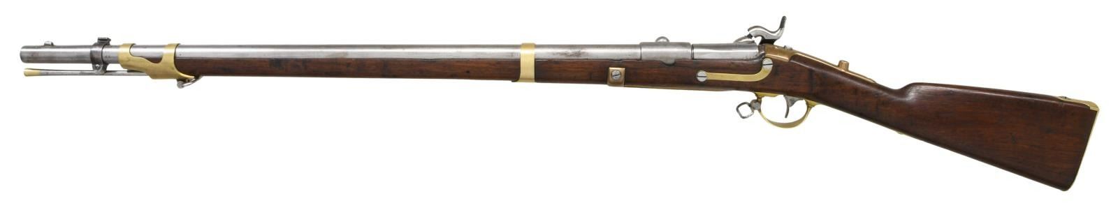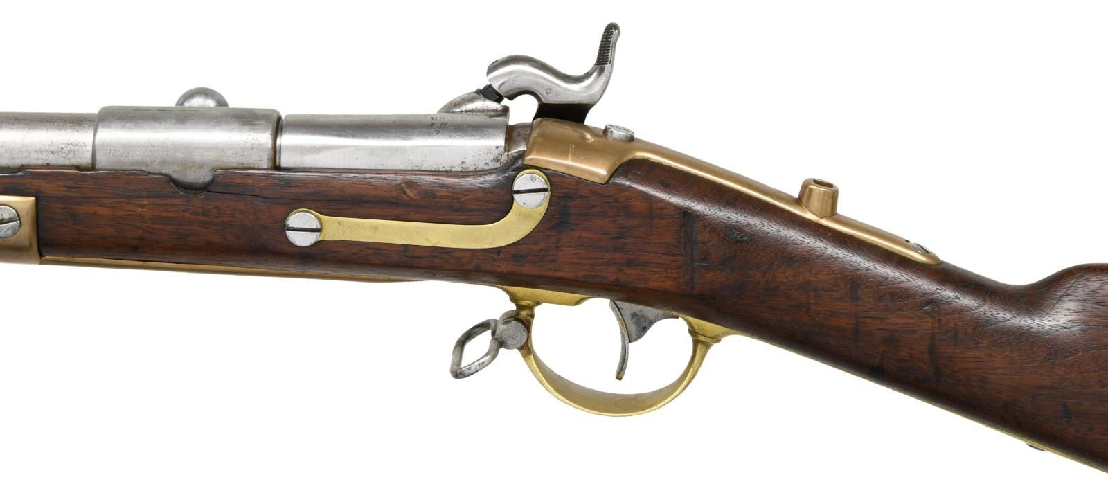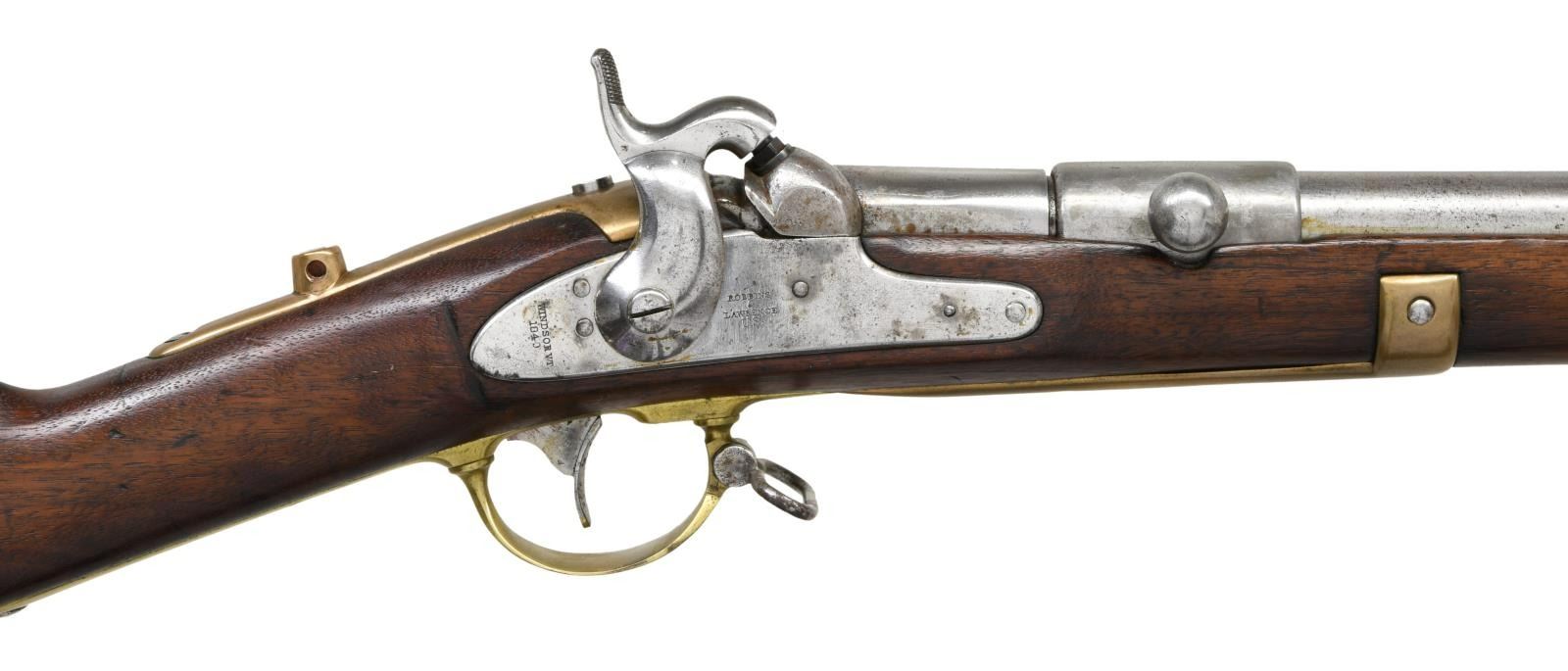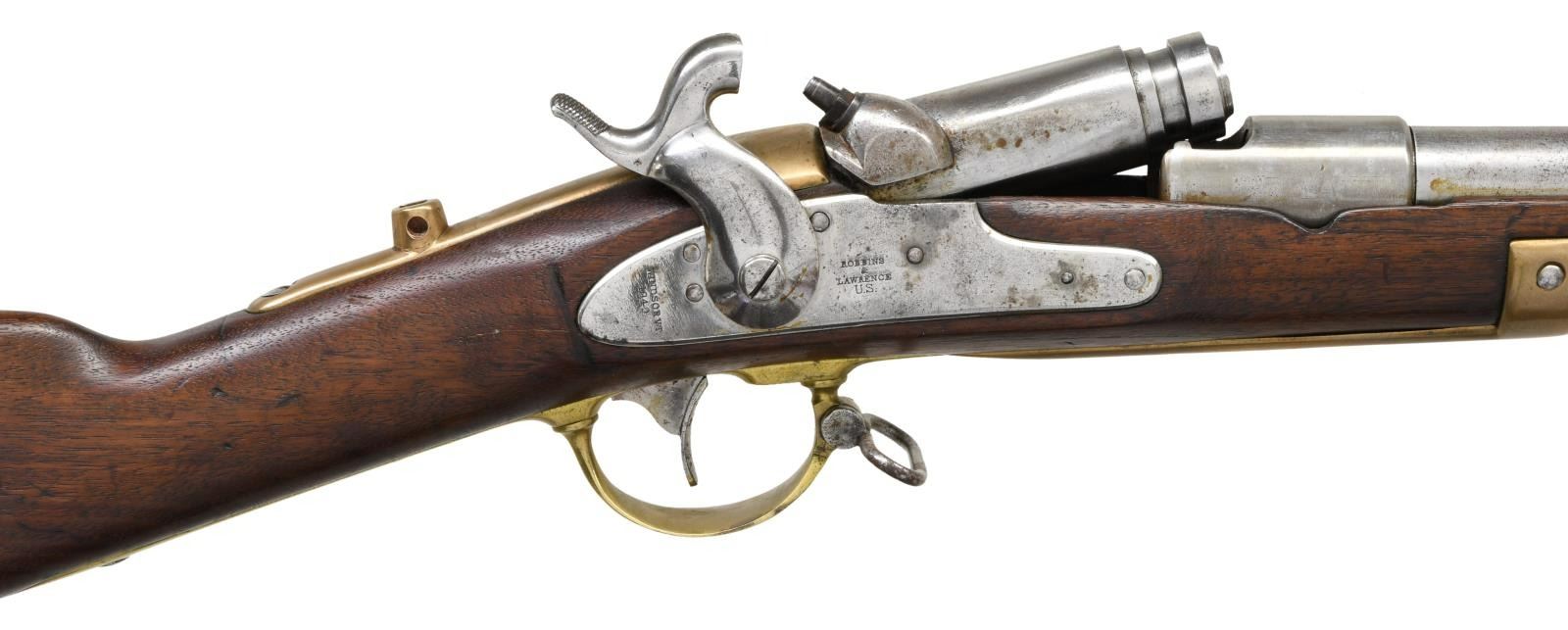 RIFLE. Cal. 54. NSN. Bbl. 33". This rare gun is an M1841 Mississippi rifle with a Lindner alteration done in 1861. There were a total quantity of 100 alterations completed by Allen and Morse of Boston, Massachusetts, utilizing the Lindner patent conversion. The conversions were performed on M1841 rifles by Robbins and Lawrence of Windsor, Vermont. The alteration was accomplished by removing the rear section of the barrel breech and replacing it with a pivoting breech section, complete with nipple bolster. A rotating sleeve with a ball handle was mounted to the barrel to release or secure the pivoting breech section. Round barrel with rectangular front sight and added ring bayonet adapter for the saber bayonet. The breech is marked "US / JH / P". The lock is marked "ROBBINS & LAWRENCE U.S." in front of the hammer, and "WINDSOR VT. 1849" to the rear of the hammer. Brass trigger guard, patchbox, "US" marked buttplate, side plate, and barrel bands. Brass tipped iron ramrod and sling swivels. The Lindner alteration is stamped at the top "PATENTED MAR. 29, 1859". CONDITION: barrel, lock, and alteration have light to medium gray patinas. Brass has a pleasing mustard patina. Lock holds both full & half cock, and alteration functions very well. Stock has expected dents and dings but not major issues. Very good bore. (01-23177/BF). ANTIQUE. $6,000-9,000.