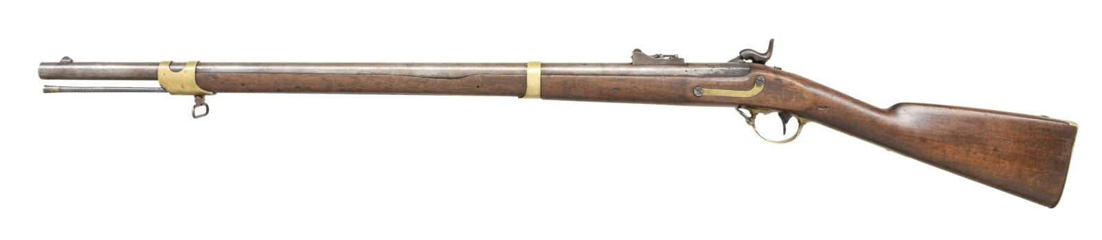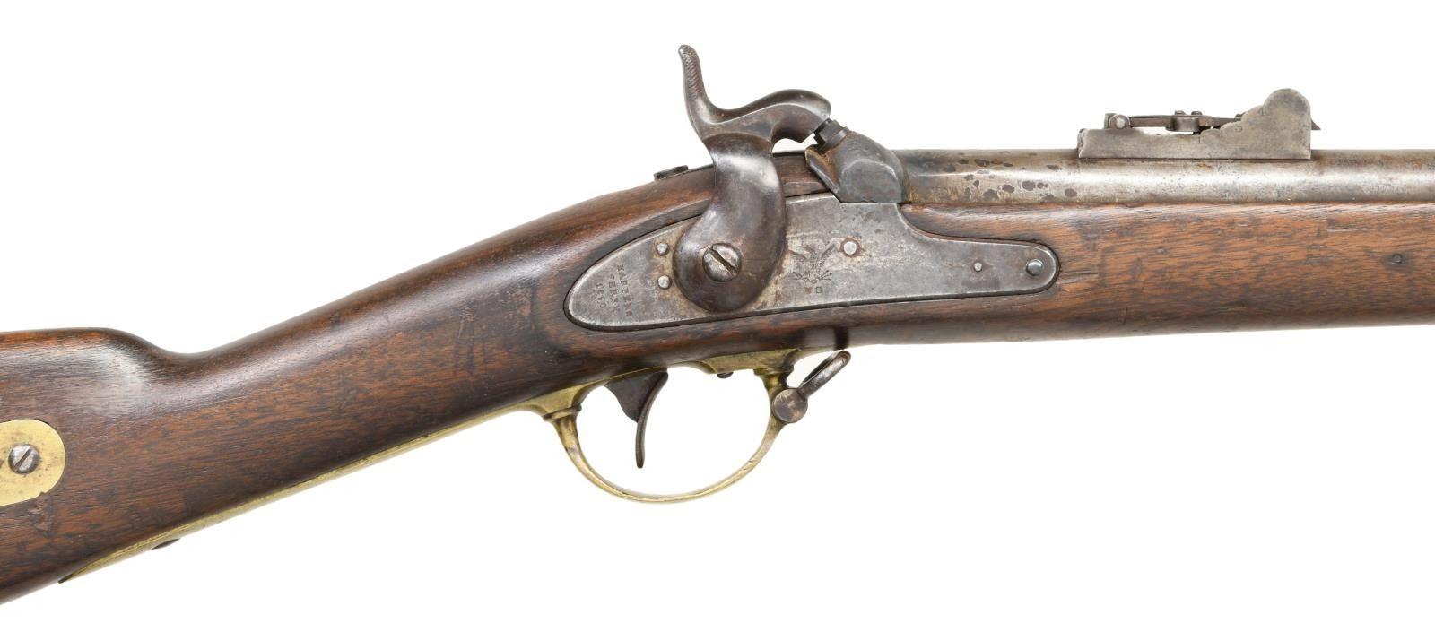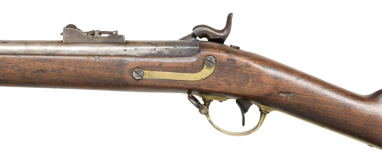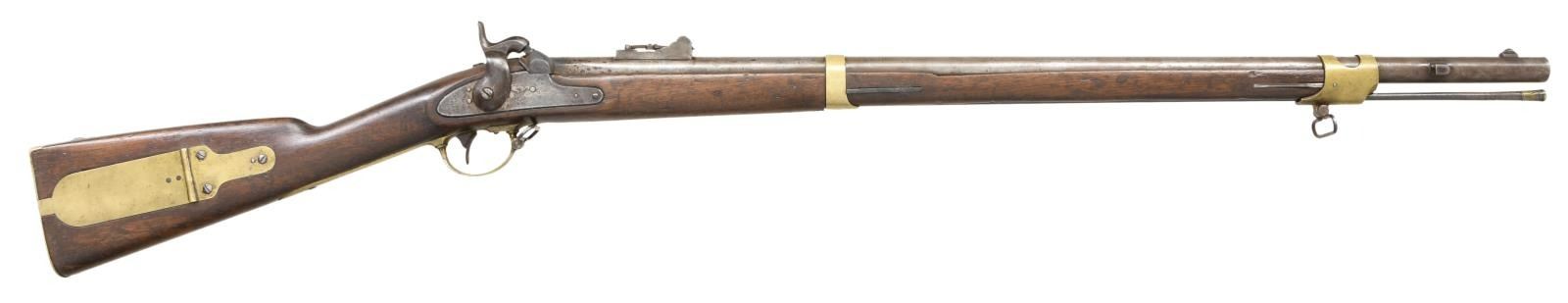 RIFLE. Cal. 54. NSN. Bbl. 33 1/4". This Mississippi rifle has been fitted with the 2nd style alteration with a bayonet adaptation for a saber bayonet. The stock has a shortened fore end and a smaller front barrel band. The barrel has a rectangular bladed front sight and a bayonet lug 4" back from the muzzle. There is a rear folding adjustable sight mounted 3-5" in front of the breech. The breech is proofed "AW / P" & "V / P / (eagle head)". The lock is marked "(eagle)" over "US" in front of the hammer, and "HARPERS FERRY 1850" to the rear of the hammer. Brass trigger guard, patch box, butt plate numbered "19", side plate, and barrel bands. The correct original iron ramrod has a brass tip. Walnut stock. Iron sling swivels are in place. CONDITION: barrel has a medium gray patina with spotting near the breech. The lock has a dark patina with some wear to the marking. The lock holds both full & half cock. Brass has a pleasing mustard patina. The stock is quite solid with 2 small slivers missing at the barrel channel and a small chip behind the side plate. Good but dirty bore with strong rifling. (01-24055/BF). ANTIQUE. $1,500-2,500.