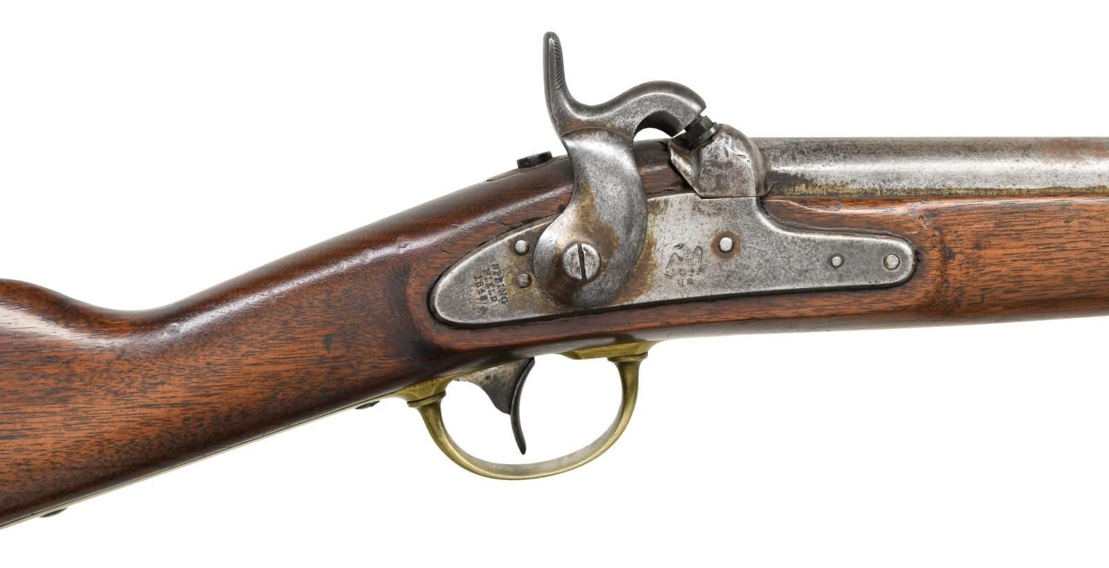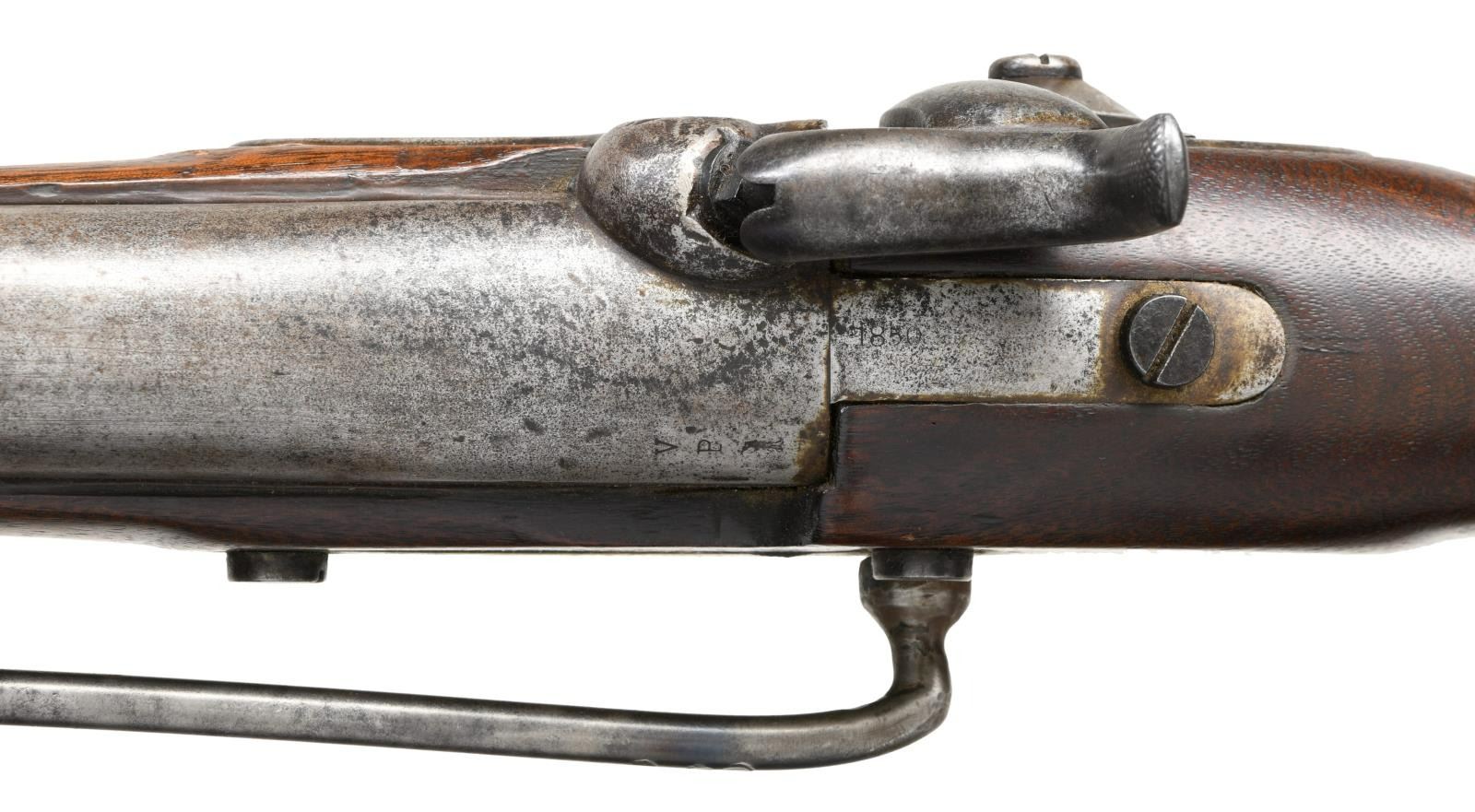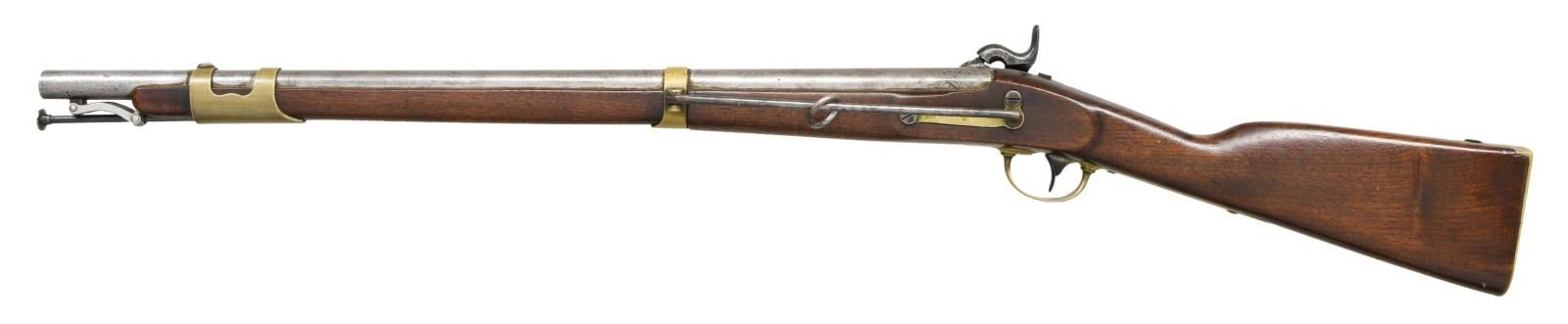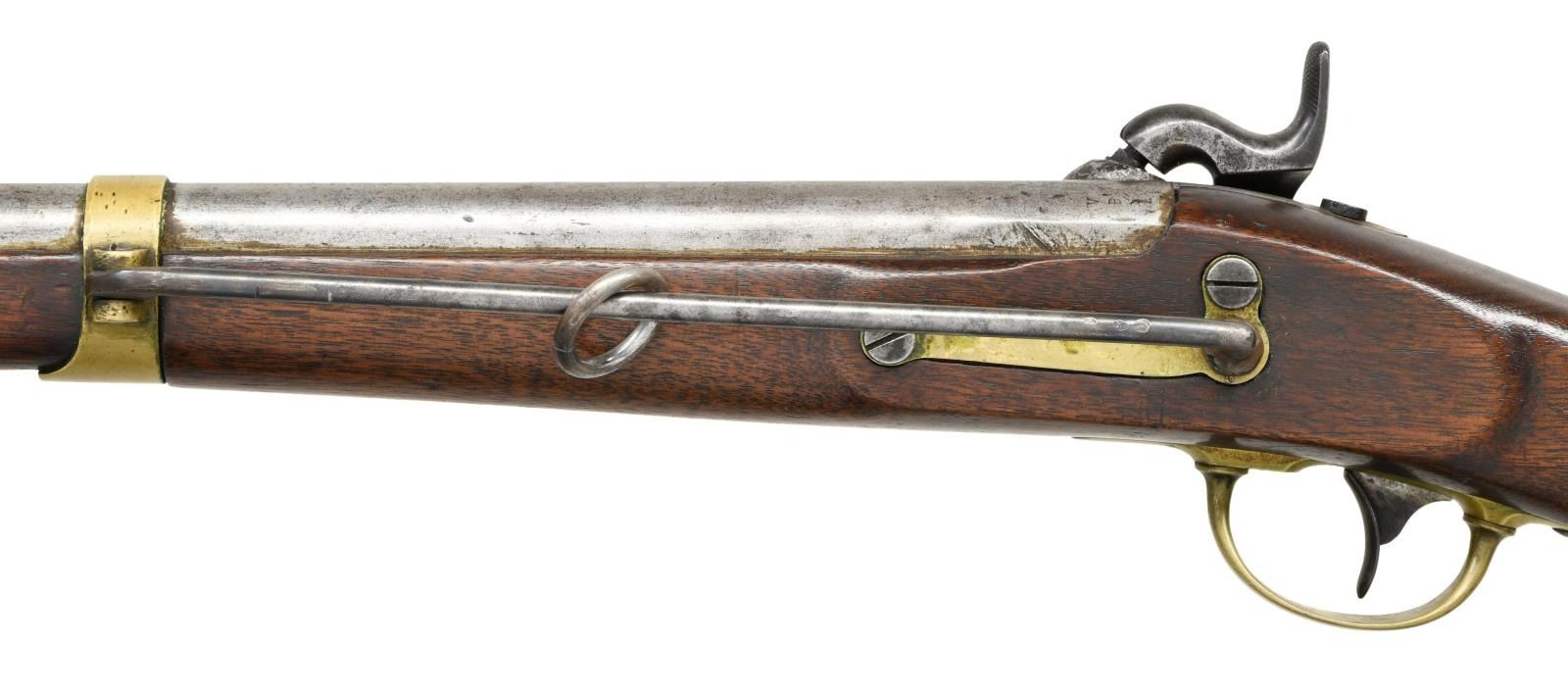 40.5" overall, 26" barrel, VP eaglehead proofed, 1850 date on tang. Lock marked Springfield 1848. Brass mounted with 9" saddle ring bar, captured ramrod assembly. 5800 of these cavalry musketoons were manufactured between 1847-1854. These arms replaced Hall carbines for the 1st & 2nd US dragoons stationed in the West. CONDITION: Fair to good as restored. Stock is refinished with no discernible cartouche. Ramrod assembly and sling bar are restorations and not well fit. Brass furniture is good with toned patina. Barrel and lock marks all discernible. Mechanics need attention, will not hold on full cock, clear smooth bore. (01-23163/JS). ANTIQUE. $1,800-2,200.