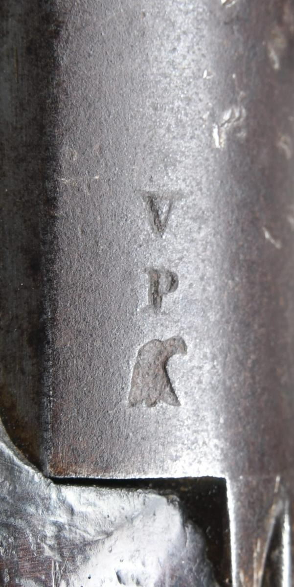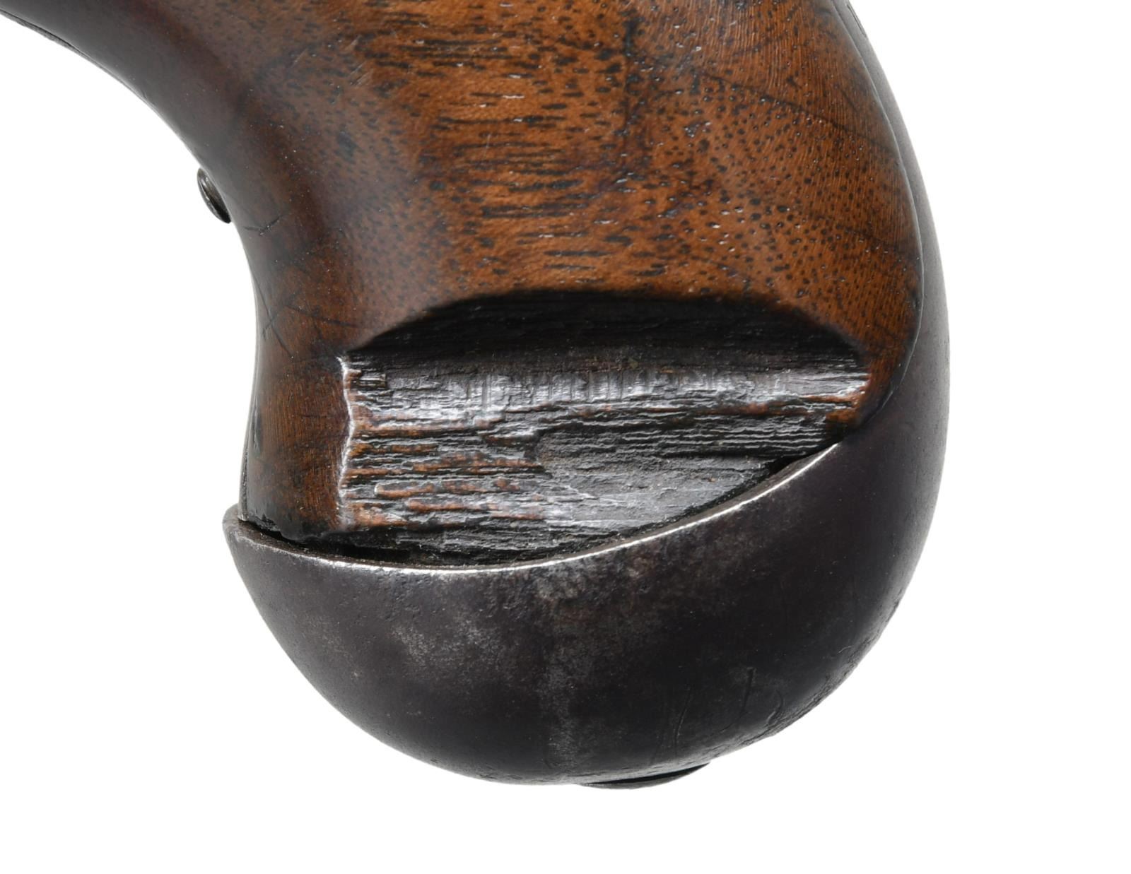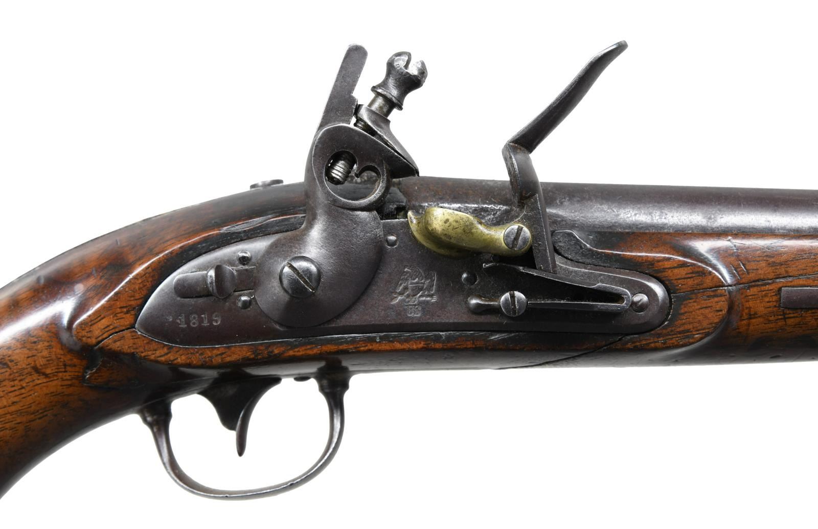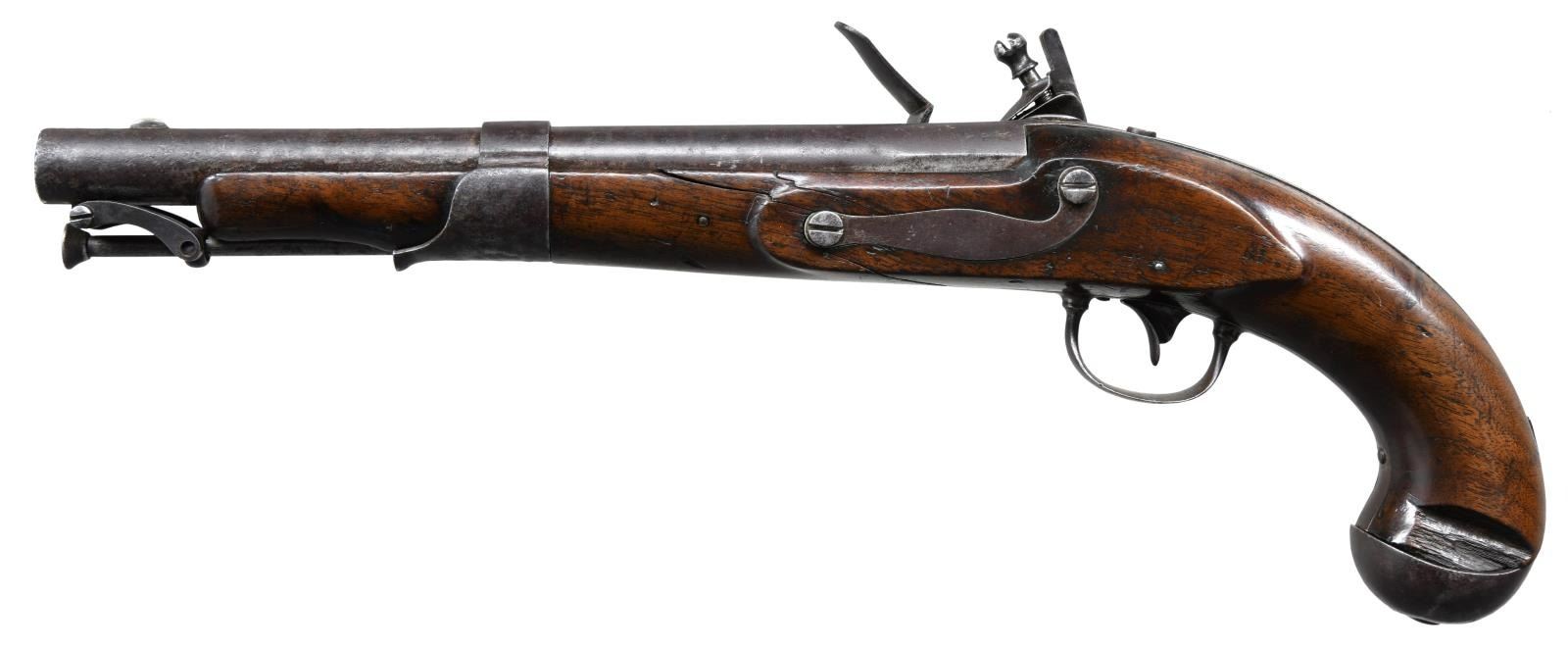 FERRY DESIGN PISTOL FOR PRODUCTION BY SIMEON NORTH. Cal. 54. NSN. Bbl. 10". This rare pistol is one of 6 produced at the Harpers Ferry Arsenal in Virginia (now West Virginia) in the year 1819. It is believed that 3 versions of this pistol were made and this is the pattern that was accepted and subsequently produced by Simeon North of Middletown, CT. North ultimately produced slightly more than 20,000 of this style pistol between 1819 and 1823. The Harpers Ferry patterns produced are discussed on pages 53-55 in the book "THE GUNS OF HARPERS FERRY" by Stuart Brown. This pistol is marked on the left side of the barrel near the bolster "V / P / (eagle head)". The lock has a brass pan and is marked in front of the cock with a droop-wing eagle over "US". Behind the cock, at the base of the lock, is the date "1819", and a sliding safety bolt is located just above the date. Iron trigger guard, buttcap, and side plate. The iron backstrap, that is inset to the back of the grip from the tang to the buttcap, is engraved "HARPER'S FERRY. 1819." There is a large iron single barrel band, which doubles as an entry thimble, in the center of the fore stock. This pistol introduces the swivel ramrod into American single shot pistol production. The stock is stamped "RI" opposite the lock 2" behind the side plate screw. CONDITION: barrel has a dark brown finish with scattered oxidation. The lock also has a dark brown finish and holds both full & half cock. All other iron parts have a similar dark brown finish. Markings throughout the pistol are quite clear. The stock has a crack extending from the front of the trigger guard to the right side past the lock to the barrel band. A crack on the left side runs from the front of the trigger guard past the front of the side plate to the lower barrel channel. There is another crack that extends from the trigger guard down the left side to the back of the lock. There is a large chip on the left side just above the buttcap. Good bore. PROVENANCE: from the Collection of Rick Hudak, author of, "Harpers Ferry Arsenal and Joseph Perkin". (01-23200/BF). ANTIQUE. $40,000-50,000.
