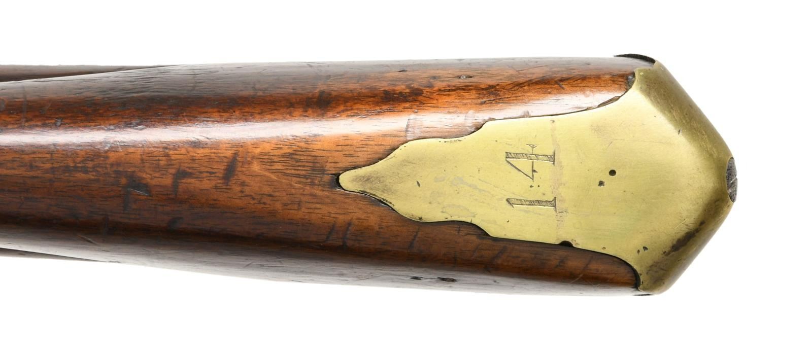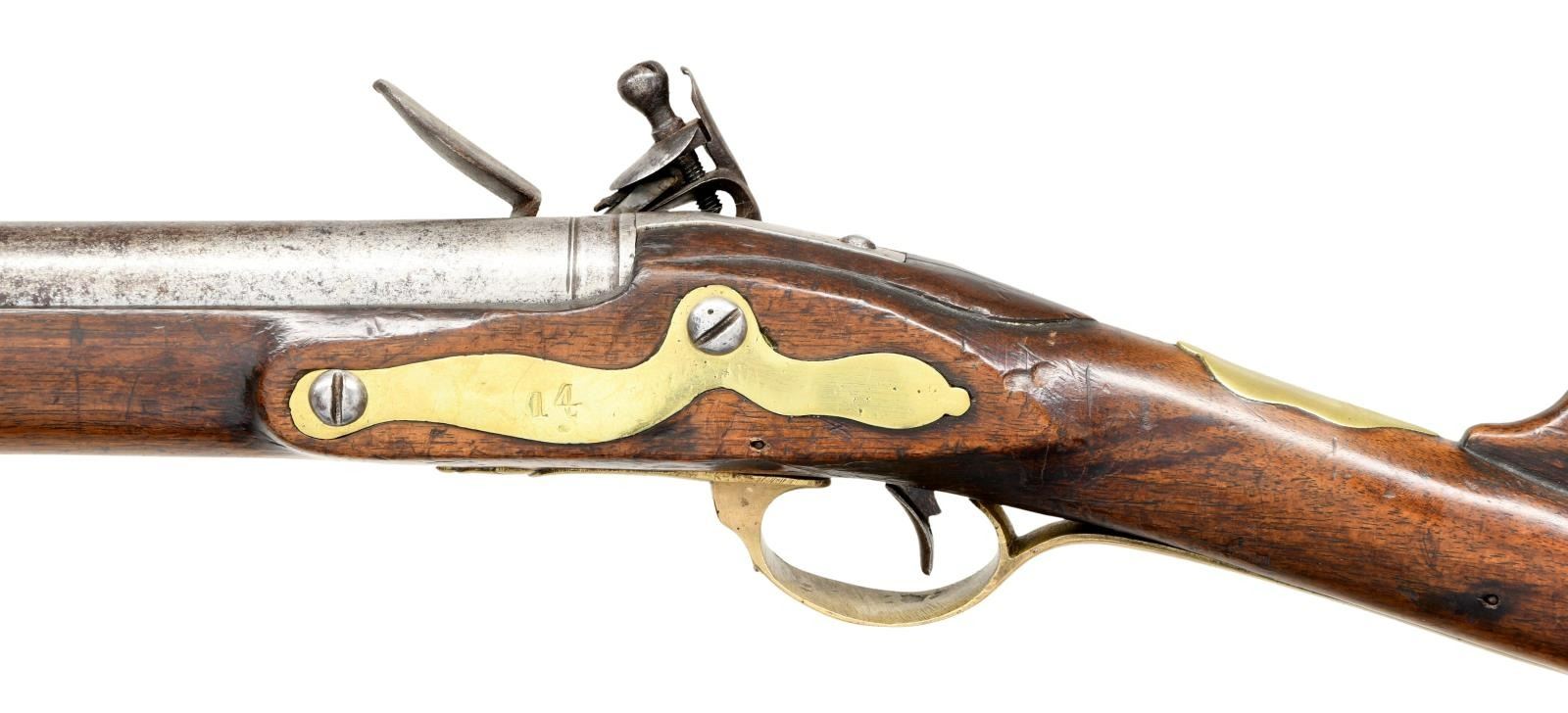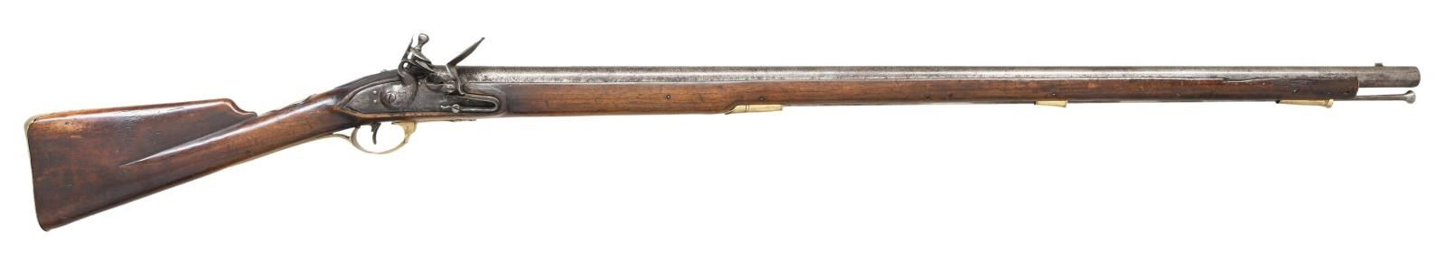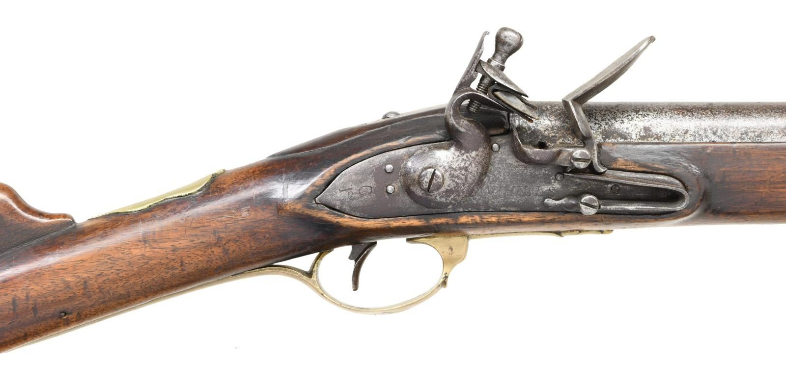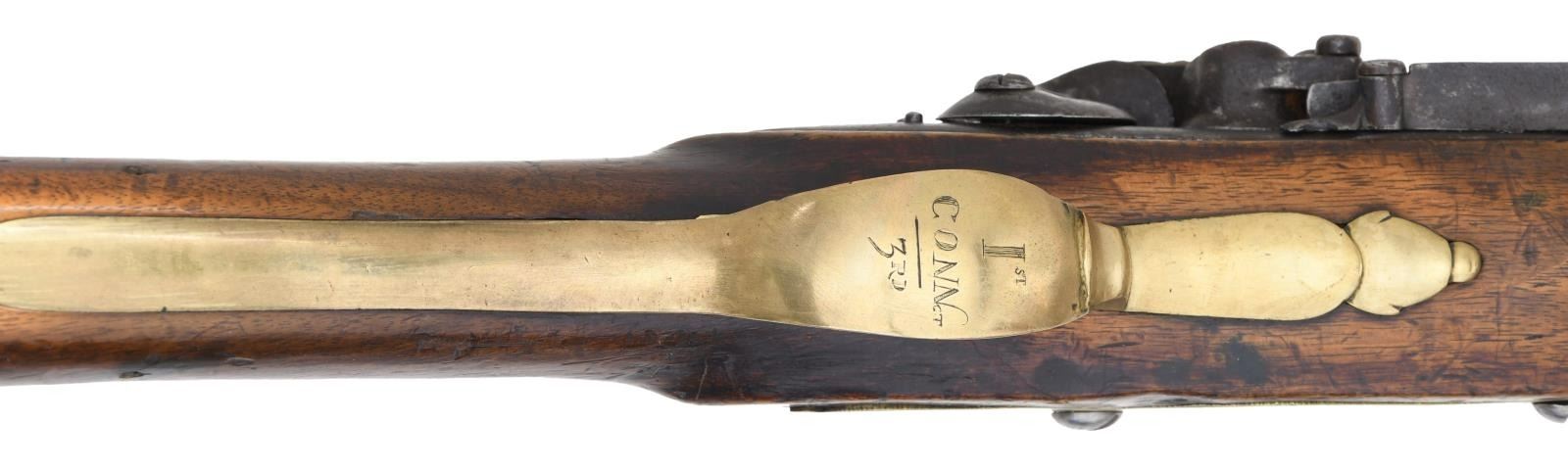 REVOLUTIONARY WAR OFFICER'S FUSIL, 1ST CONNECTICUT REGT. Cal. 76. S# 14. 54" overall, 38.25" round American made barrel, makers cartouche on bottom "LL", known Connecticut Revolutionary War era iron monger. This well preserved and beautifully marked short musket/fusil is signed "M. HILLS", Medad Hills of Goshen, CT was the most famous member of a large family of gun makers in colonial America. Medad delivered 40 muskets to the state of Connecticut in 1776. Trigger bow is engraved "1ST / CONN / 3RD", buttplate tang & sideplate both marked "14". Lock is also engraved "C / 1co". Rarely are American Revolutionary War era arms found in such exemplary condition. The reason for such fine condition is that this long arm was purchased from an Irish estate in 2006 where it had been maintained since it was thought taken home as a souvenir in the Revolutionary War. The 1st Connecticut regiment was involved in the disastrous 1777-1778 campaign to control New York City, where this souvenir was possibly taken. Regardless, this is among the finest regimental marked Revolutionary War American made longarms extant. Steve Hench treasured this gun in his exceptional collection of Revolutionary War long arms collected over 60 years that were sold in 2019. Speaking with Mr. Hench, who is noted expert on American Revolutionary War & Kentucky rifles, he stated he had no doubt that this was among the very few totally American made regimentally marked Revolutionary War longarms surviving today. He pointed out that the barrel was crudely made with numerous forging flaws and would probably not have survived long service. Luckily this exemplary arm was taken home by British soldier to be preserved like other fine important Revolutionary War American objects that have been returned to the US. He also pointed out the gun was stocked in American White Walnut (Butternut) which is rare feature. UNATTACHED ACCESSORIES: laboratory report identifying genus species of wood in stock. Letter from Al Para to Steve Hench, detailing the history of gun coming from Irish estate. File of research on Medad Hills and the other Hills family gun makers. History of 1st Connecticut in the Revolutionary War. CONDITION: very good to fine overall for an 18th century flintlock, appears original and complete overall, original flint configuration, the ramrod is replacement but of the era. Gun was cleaned & varnished in European style when fashionable in 19th century. Mechanically fine, clear smooth bore. (01-24155/JS). ANTIQUE. $35,000-45,000.